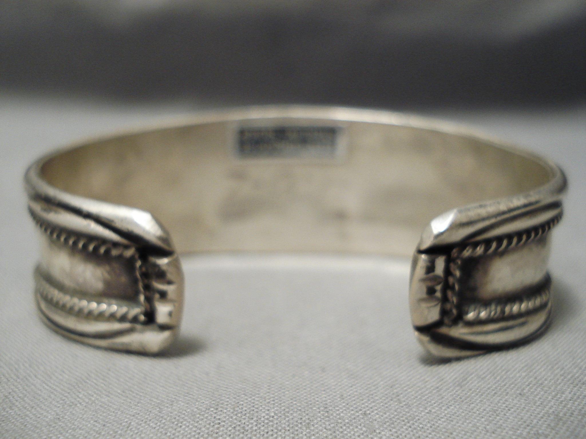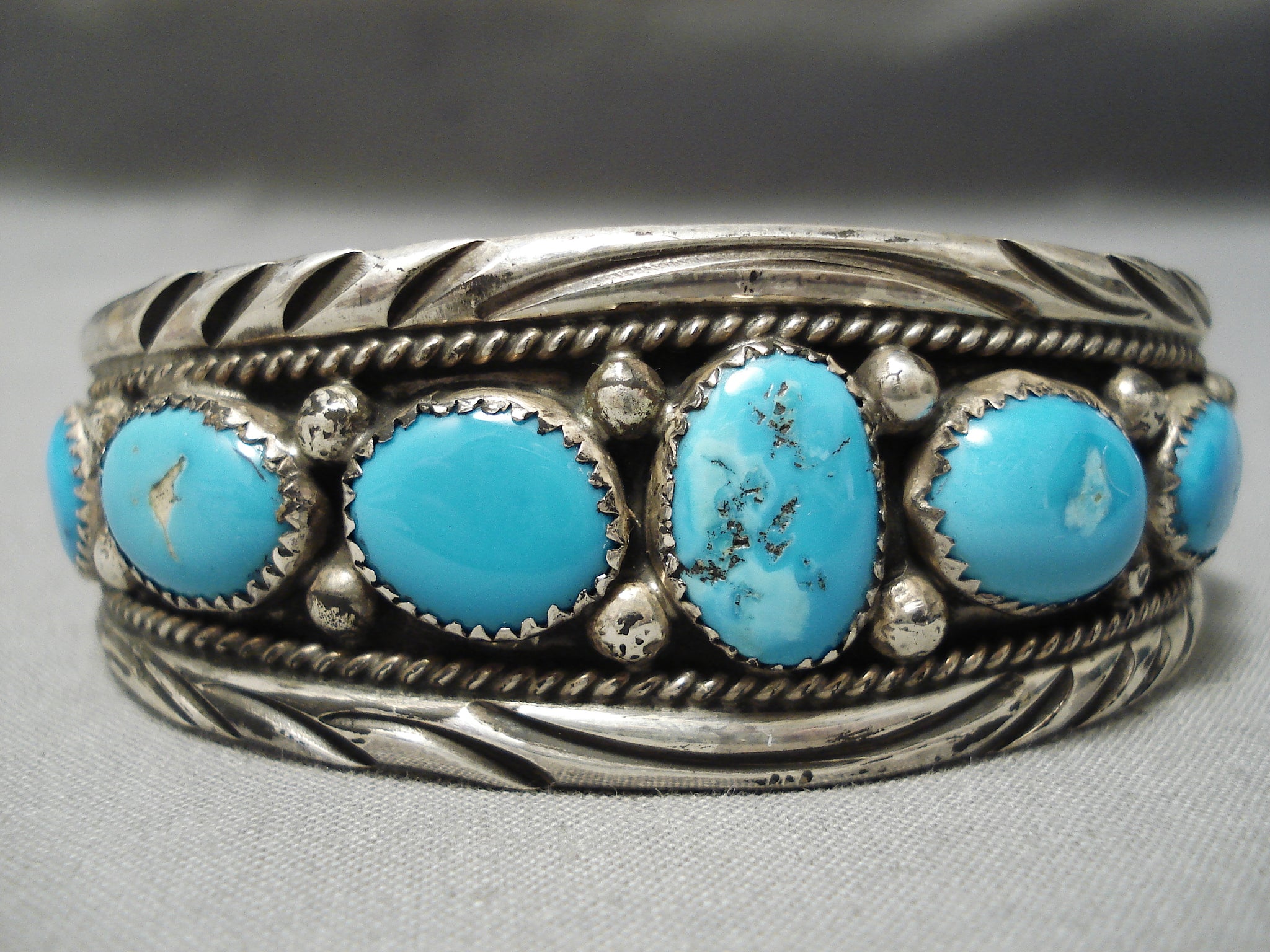 Rare Wide Wave Stamp Vintage Native American Navajo Blue Turquoise Sterling Silver Bracelet Old