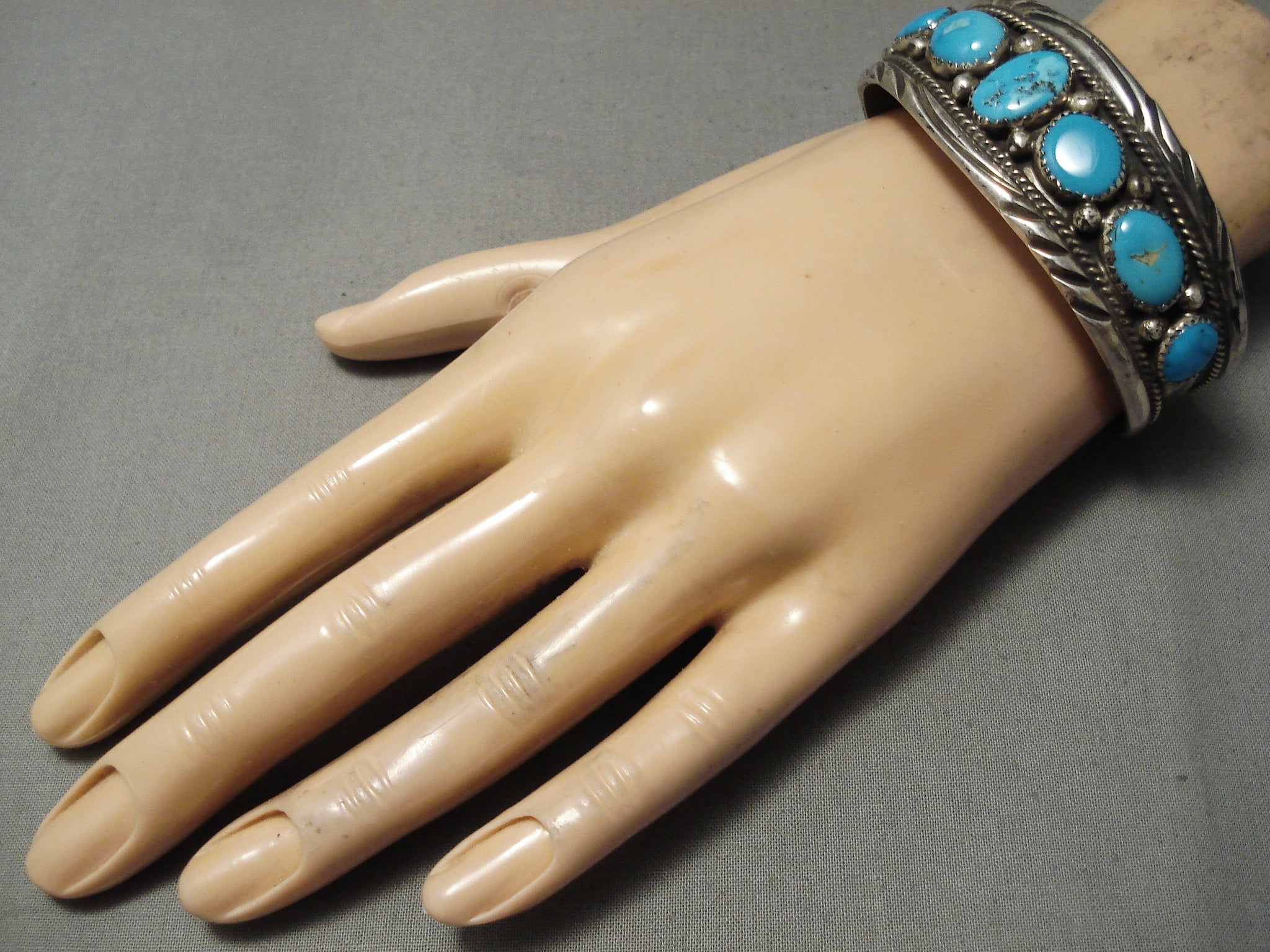 This is an exquisite vintage Navajo turquoise row silver bracelet. This outstanding piece contains 7 fabulous blue turquoise stones. Accenting the stones are wonderful silver raindrops with accenting silver ropes. Check out how the artist did amazing deep silver long wave patterns that border the cuff, very unique. The center stone measures around 1/2" x 1/4". The width of the bracelet measures around 1". Sterling silver. Cir. Mid to late 20th century . The inside end to end measures around 6-1/4" with an additional 3/4" gap. Sturdy 50 grams.