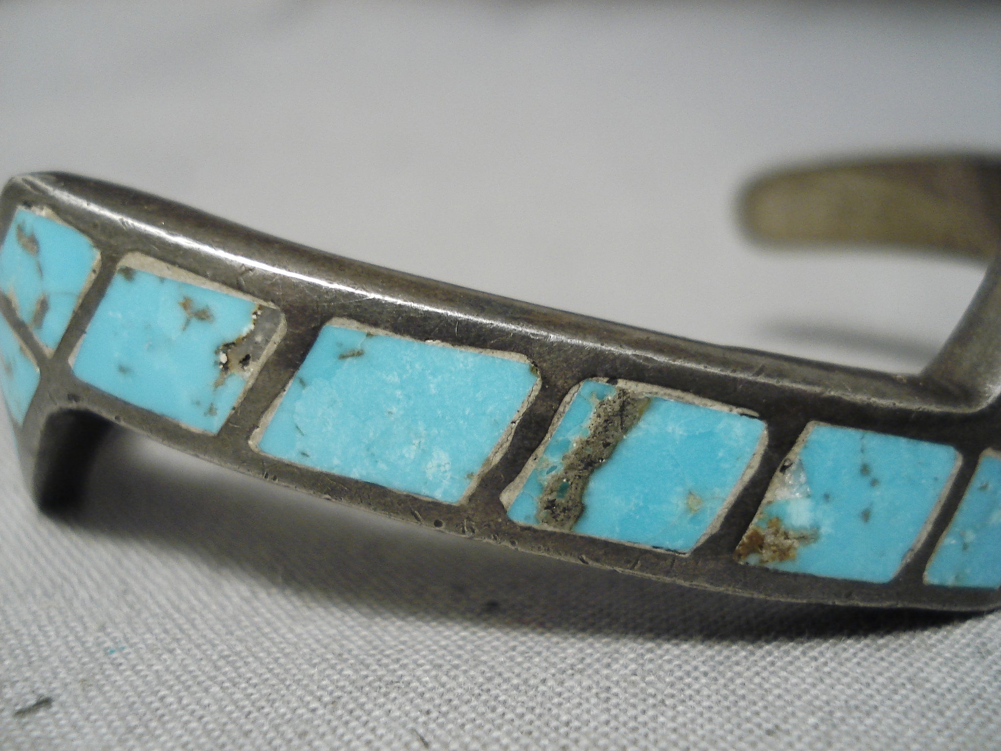 This is an exquisite vintage Zuni/ Navajo inlaid silver bracelet. This outstanding piece is amazing as it consists of a fabulous zig zag thick and sturdy silver cuff. Resting in the center of the cuff are beautiful inlaid Blue Gem turquoise stones. The width of the bracelet measures around 3/8". Sterling silver. Cir. Mid century . The inside end to end measures around 4-3/4" with an additional 1" gap. Sturdy 26 grams.