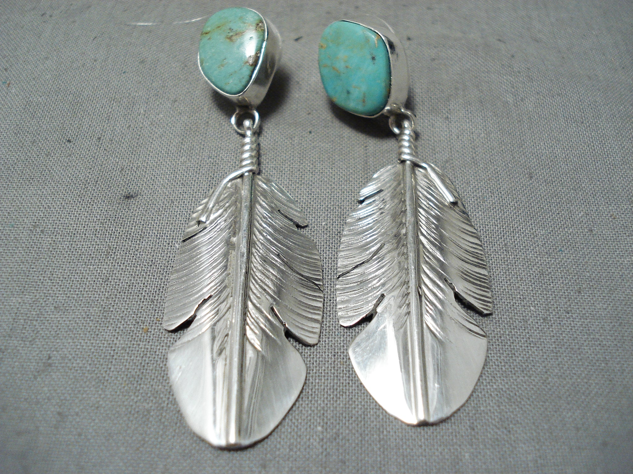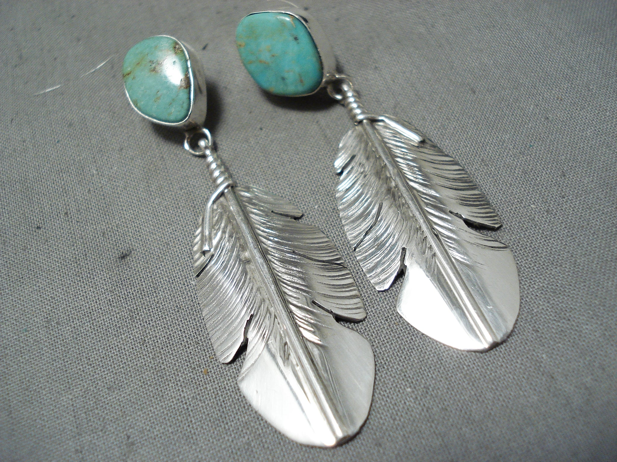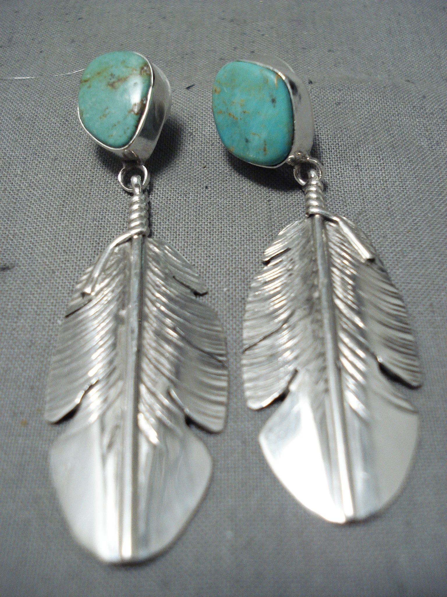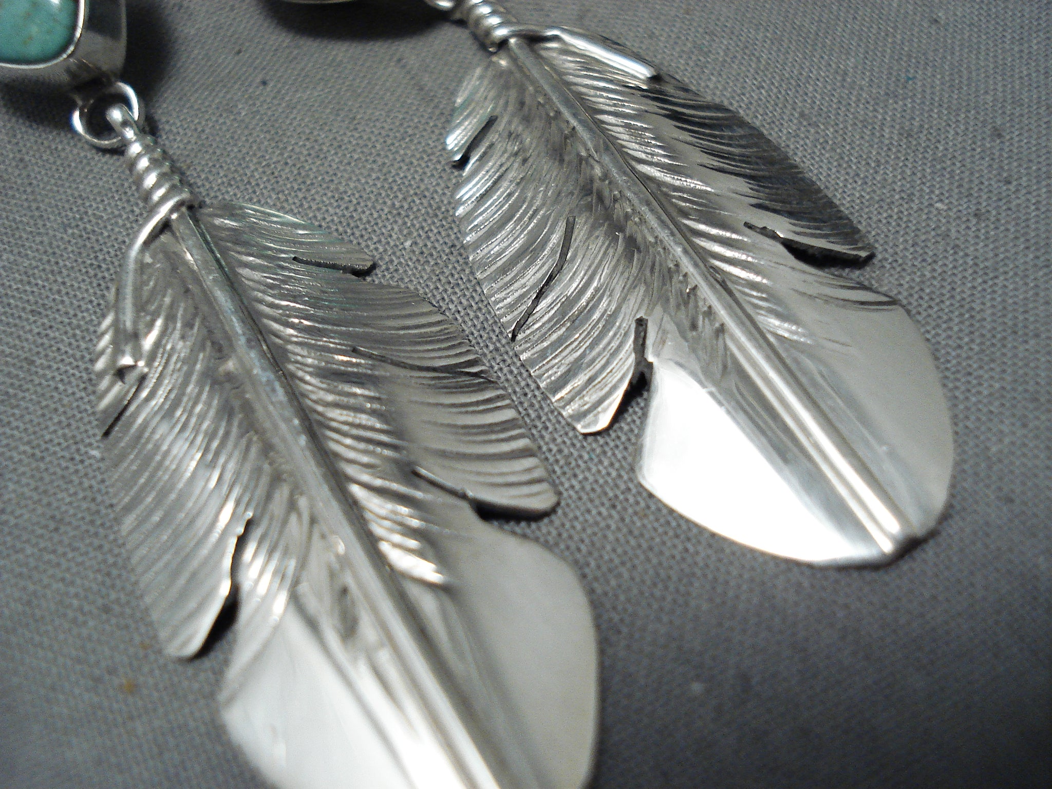 Remarkable Native American Navajo Royston Turquoise Sterling Silver Feather Earrings