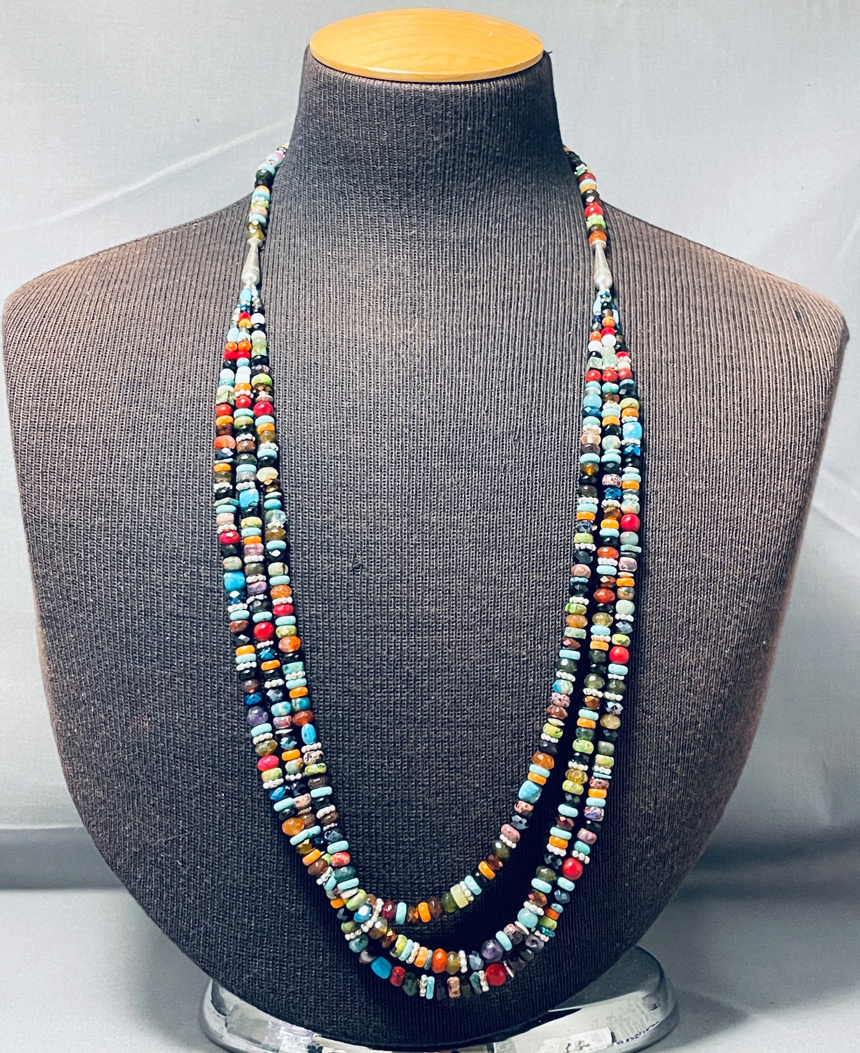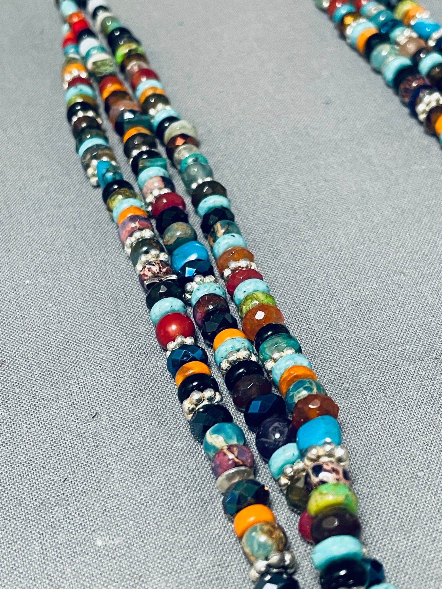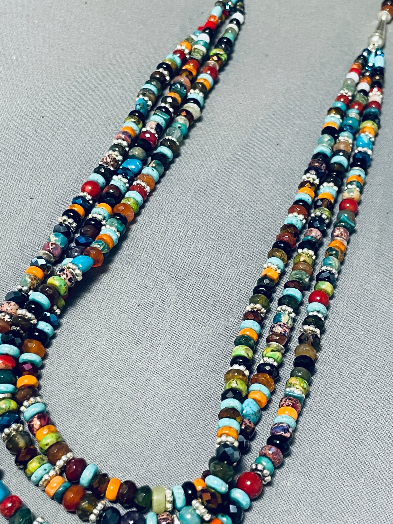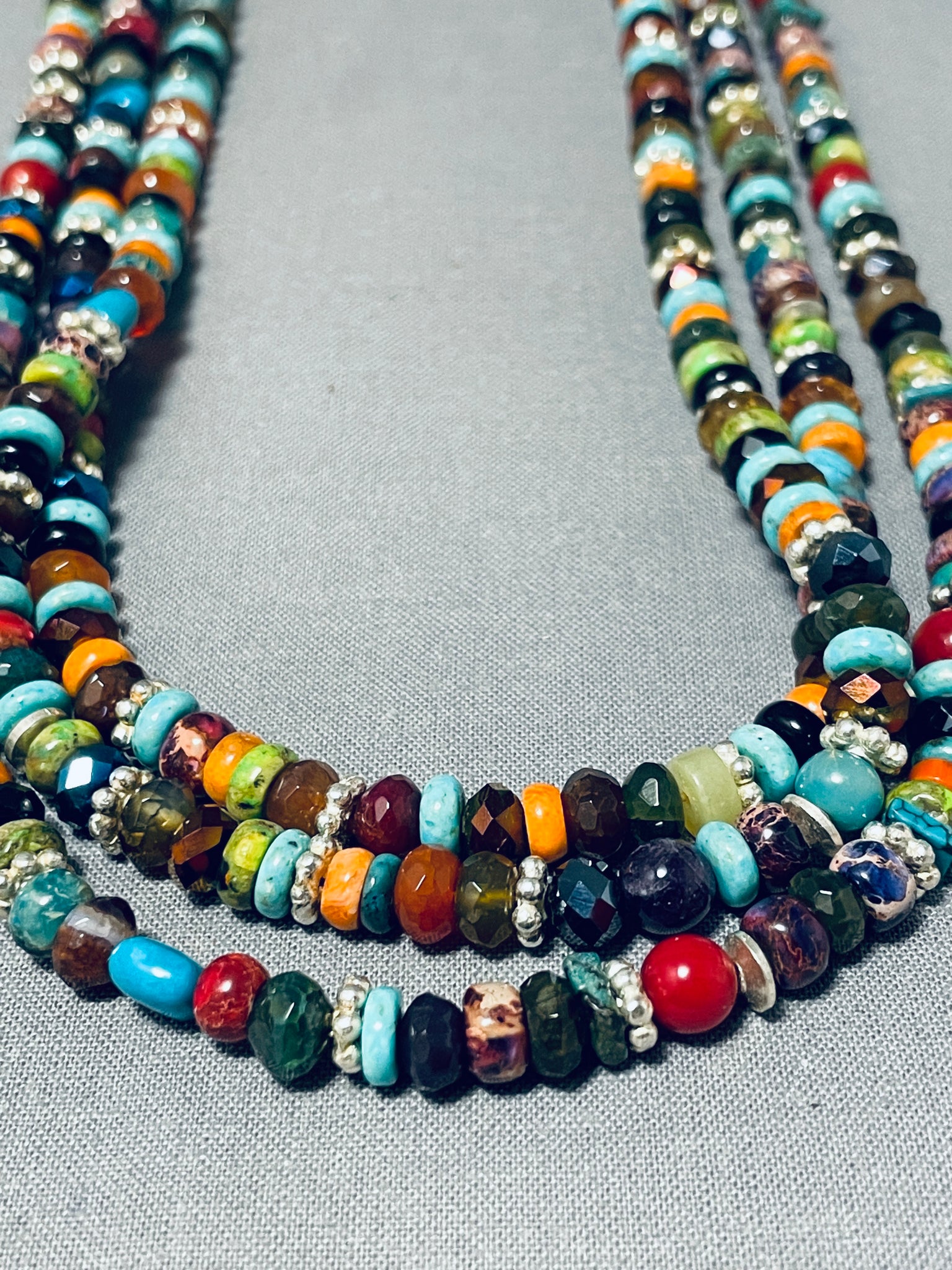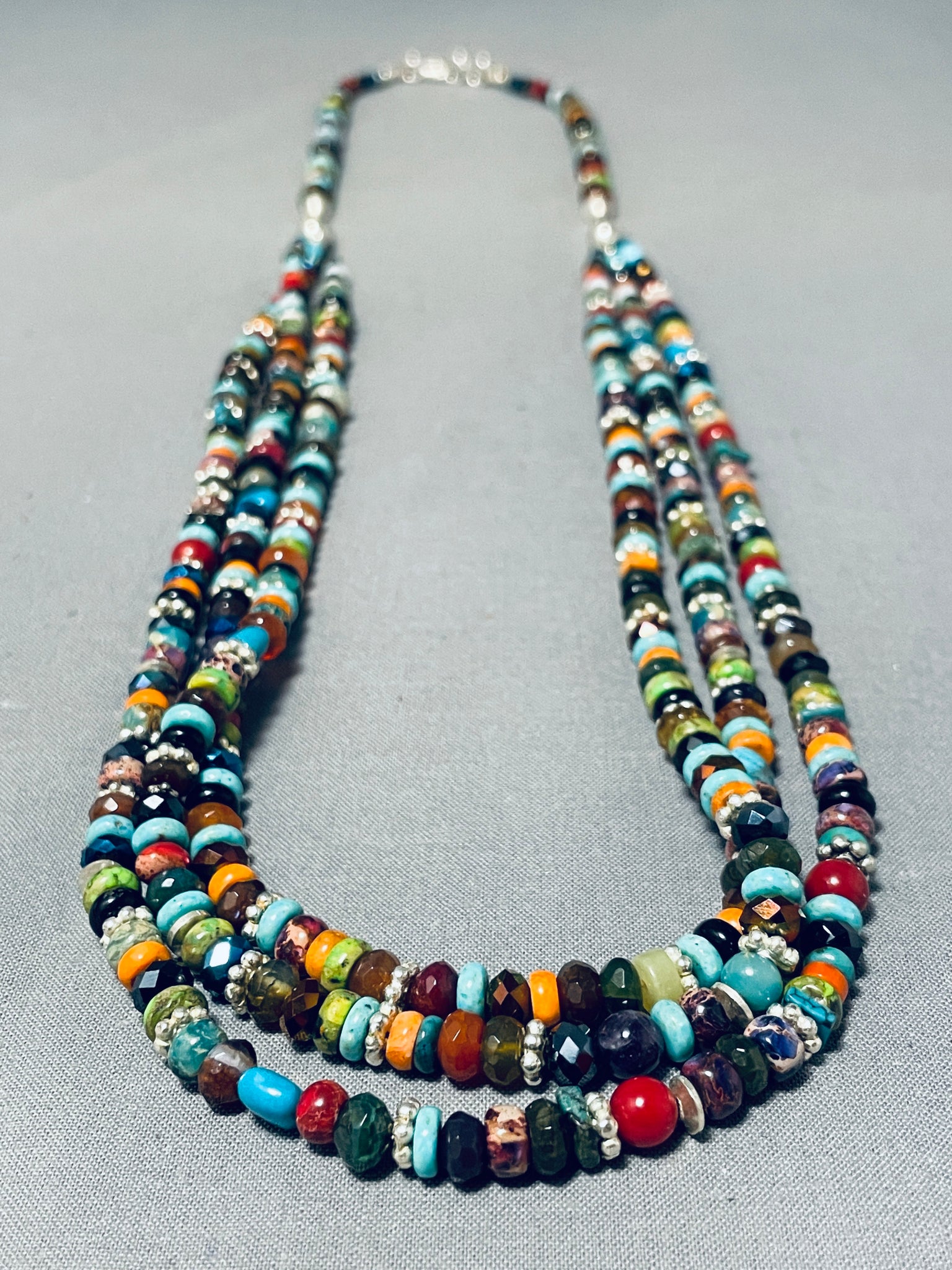 An exceptional Navajo silver necklace. Be sure to check out all the picture to try to get a true sense and impression of the extraordinary attributes of this triple strand layered necklace! The necklace is a spectacular mix of colorful stones and silver bead spacers that fabulously reflect the light! The strands gather with a ¾" combo of silver bead and cone at each side! A Fabulous piece! Sterling silver. The length of the necklace measures around 29". Sturdy 86 grams.