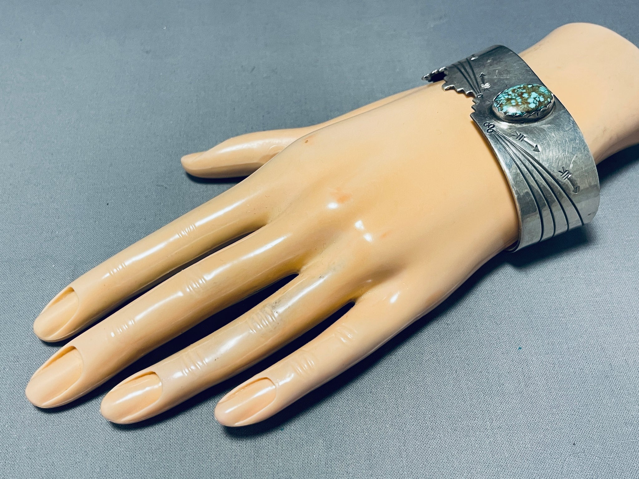 This is a marvelous vintage Navajo single stone silver cuff bracelet. This amazing bracelet contains a center spiderweb turquoise stone appearing to be from the wonderful Red Mountain turquoise mine. Located on the wide silver cuff bracelet are outstanding carving patterns that consist of long sun bursting patterns with accenting arrow patterns and dotted works. Located on one half of the cuff on one edge are carved out pueblo patterns. Such a wonderful bracelet. The center stone measures around 5/8" x 1/2". The width of the bracelet measures around 1". Signed by Navajo artist, Ross Scott. Sterling silver. Cir. 1990's+. The inside end to end measures around 5-1/2" with an additional 1-1/4" gap. Sturdy 48 grams.