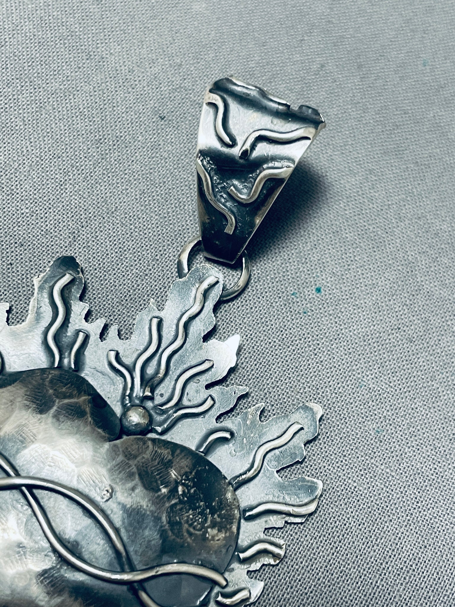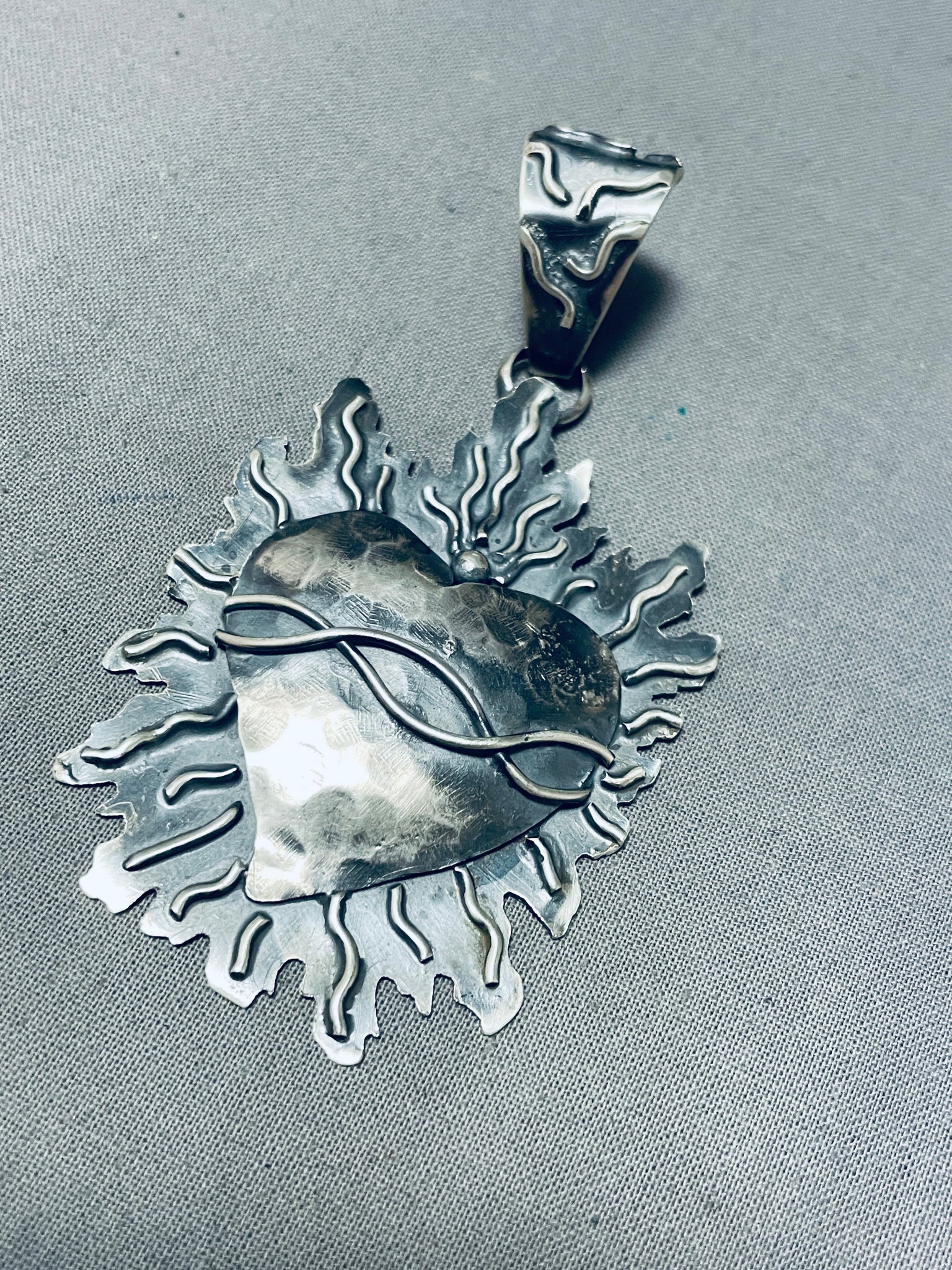 Here we have an astonishing Navajo sterling silver handcarved heart on fire pendant with handcarved silver flames surrounding a silver heart center and a handcarved silver bail! Simply Stunning! Sterling silver. The pendant measures around 3-1/8" x 1-5/8". Sturdy 23 grams.