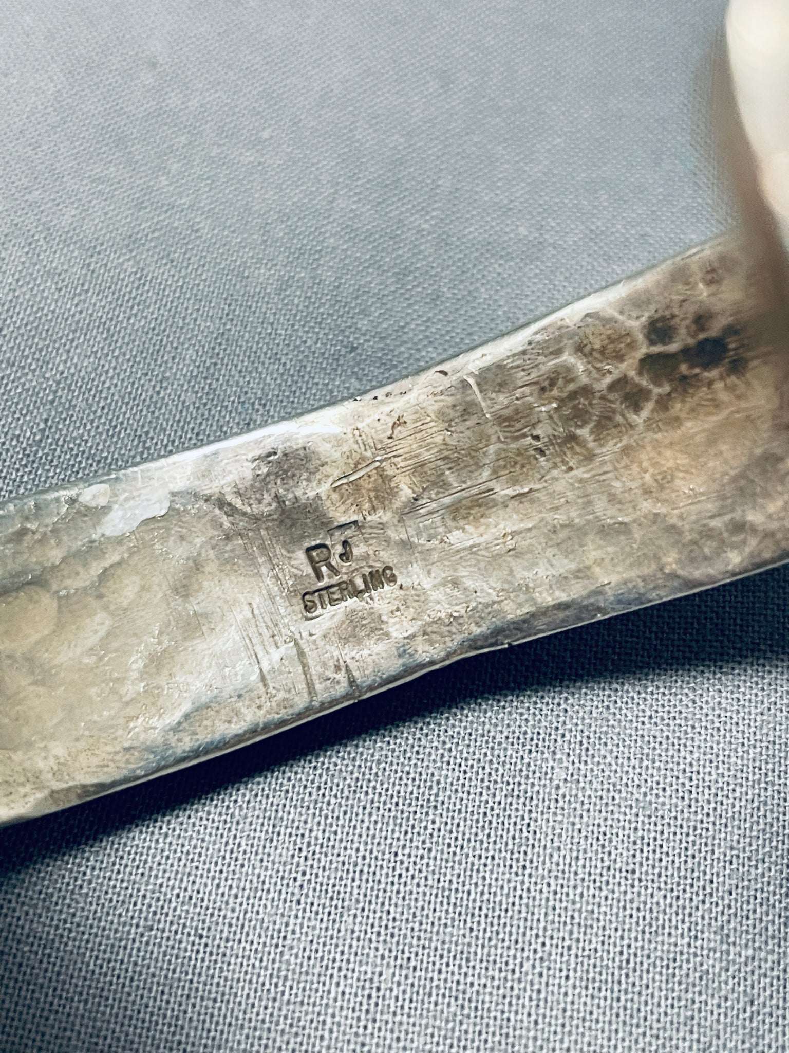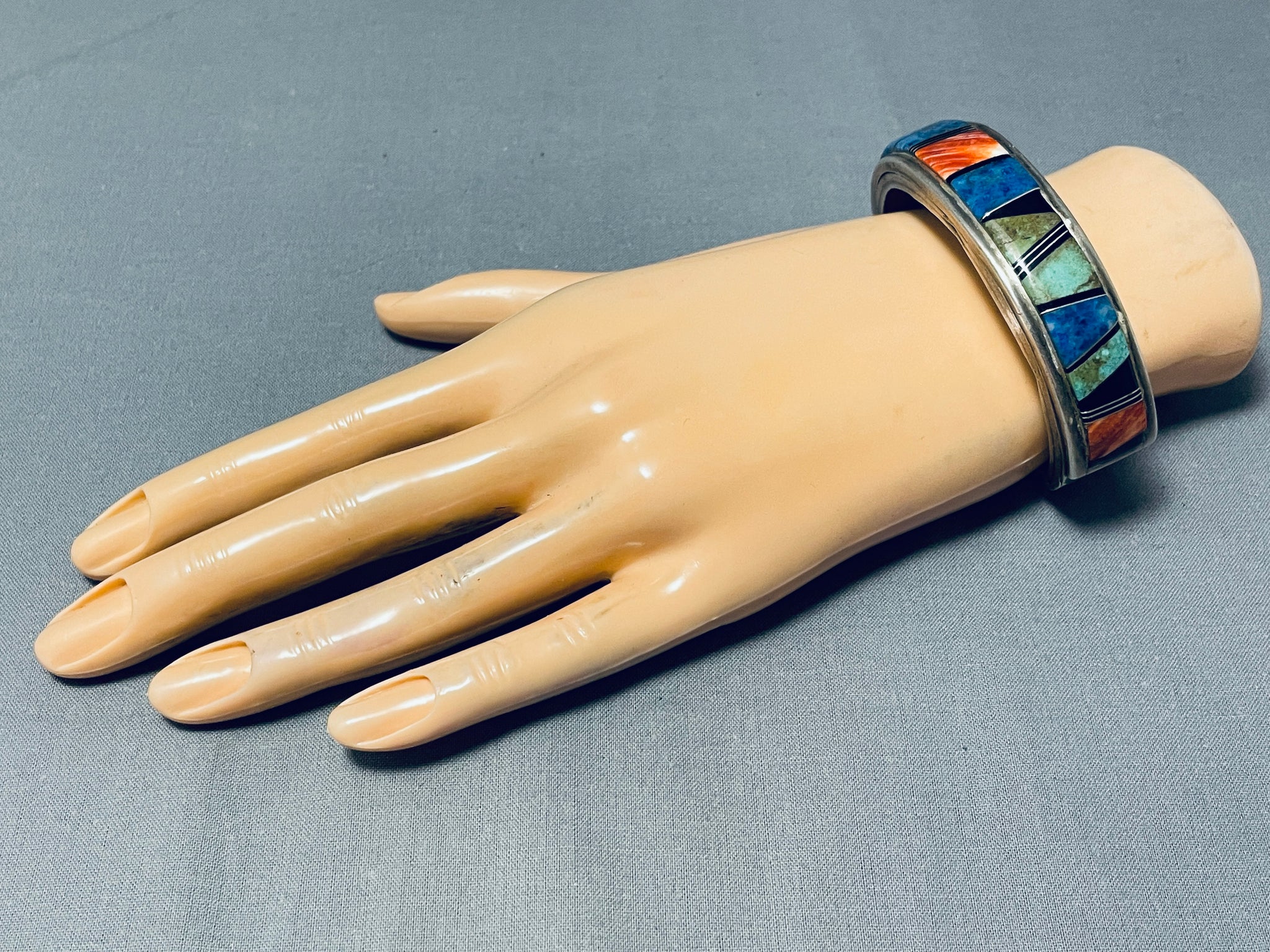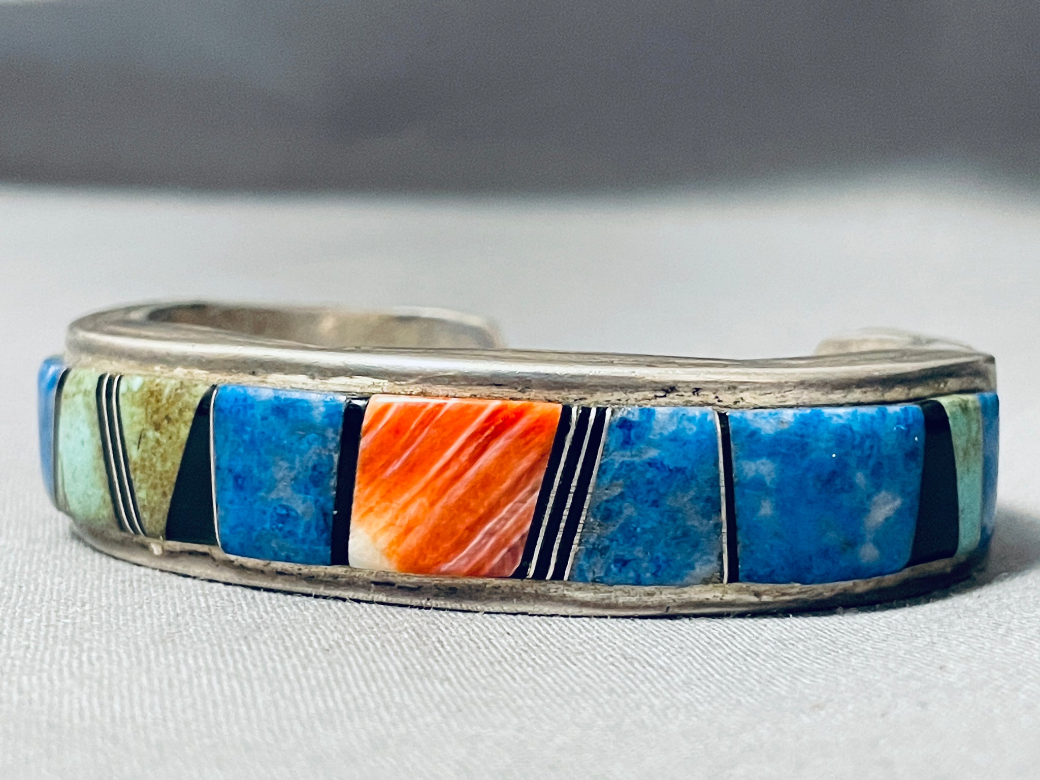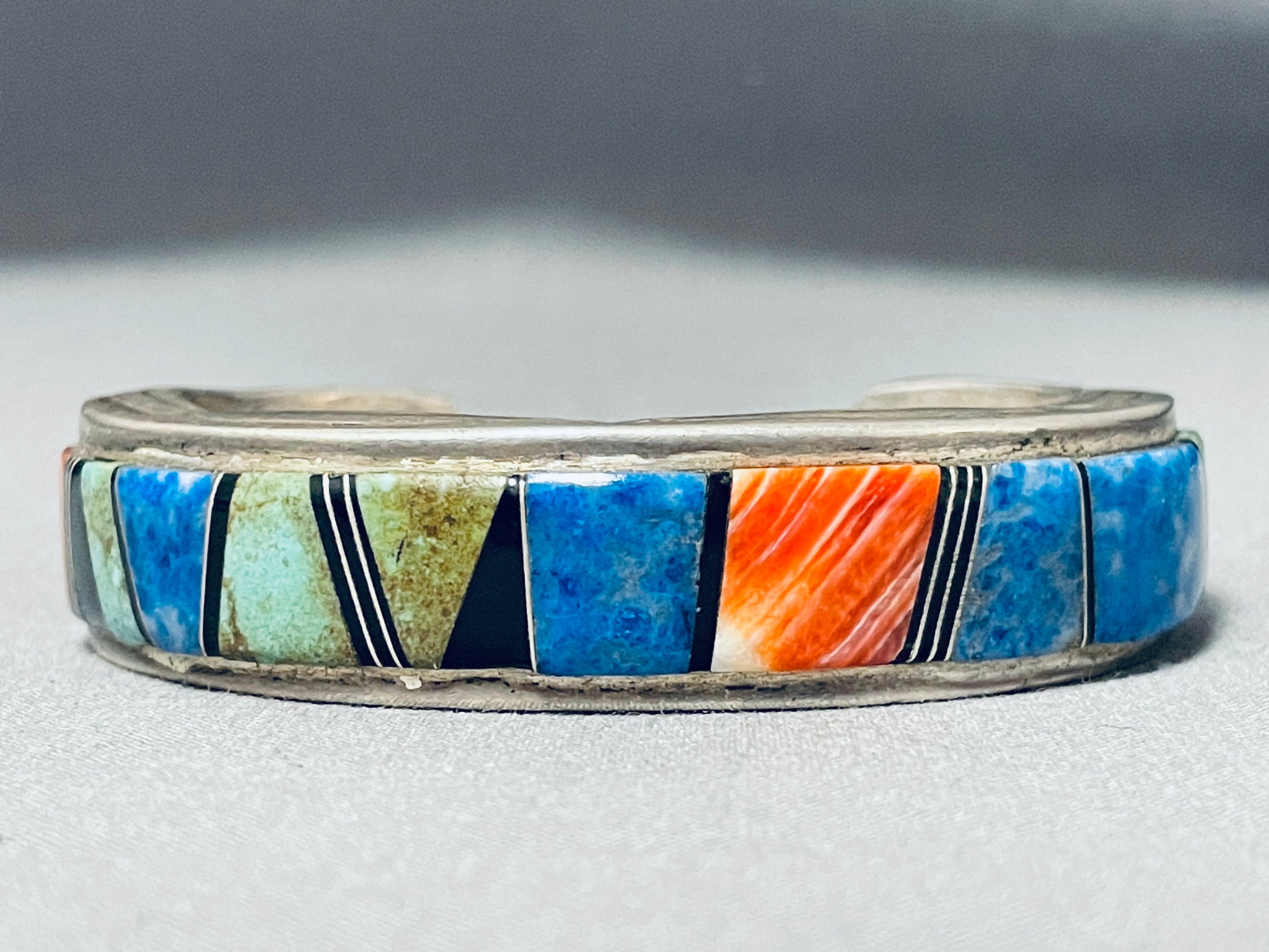 Signed And Intricate Vintage Native American Navajo Turquoise Lapis Sterling Silver Bracelet
