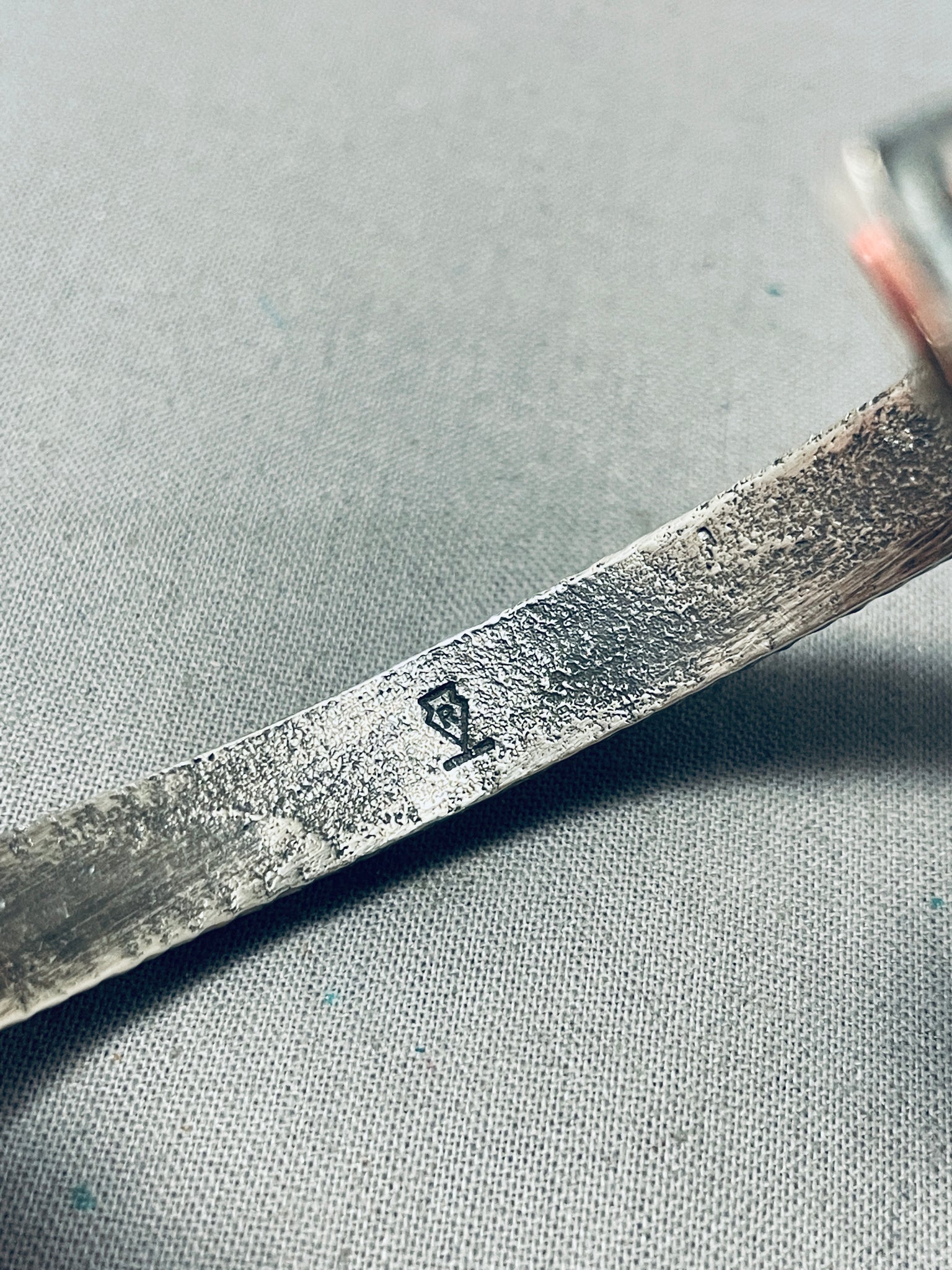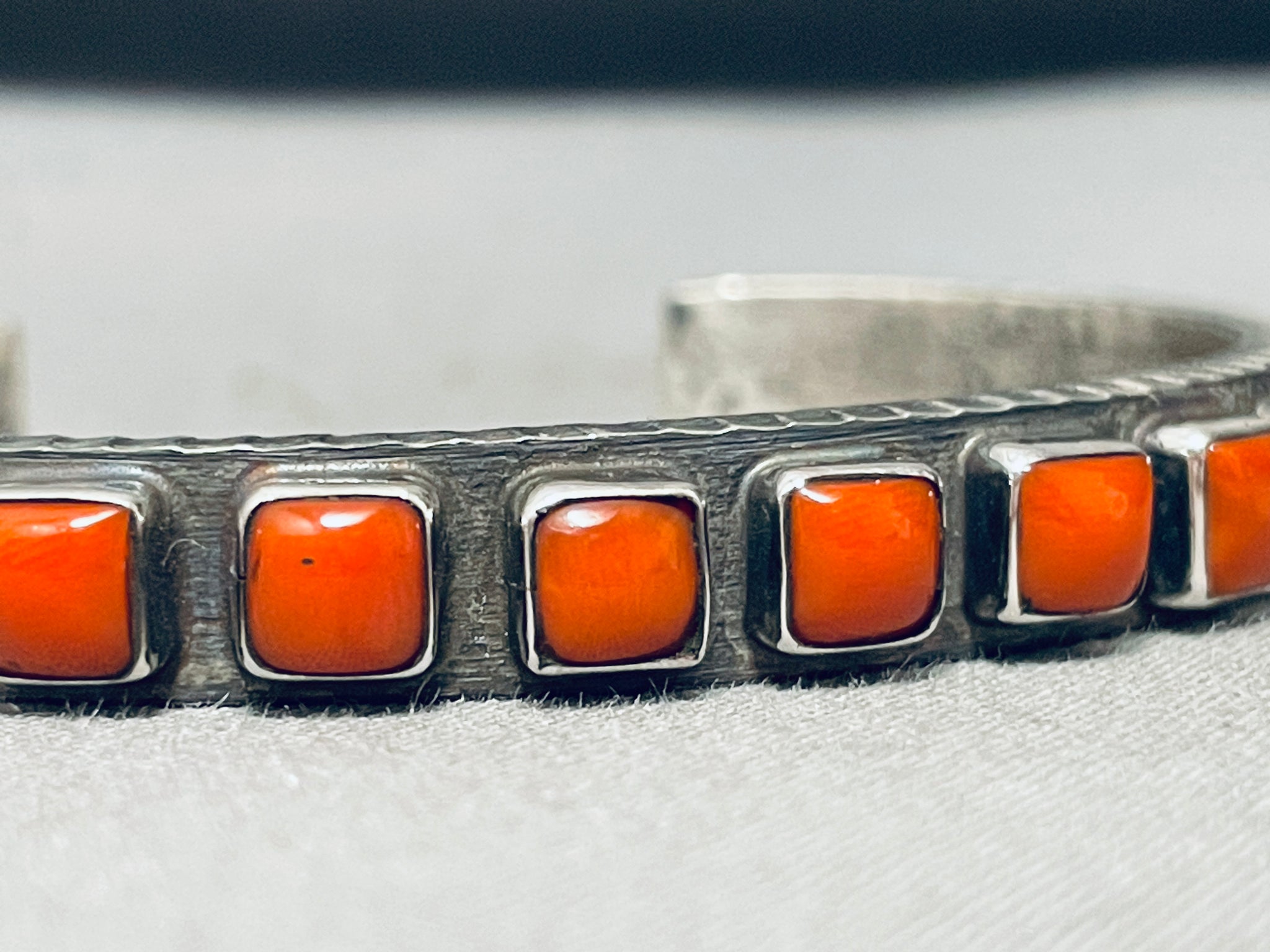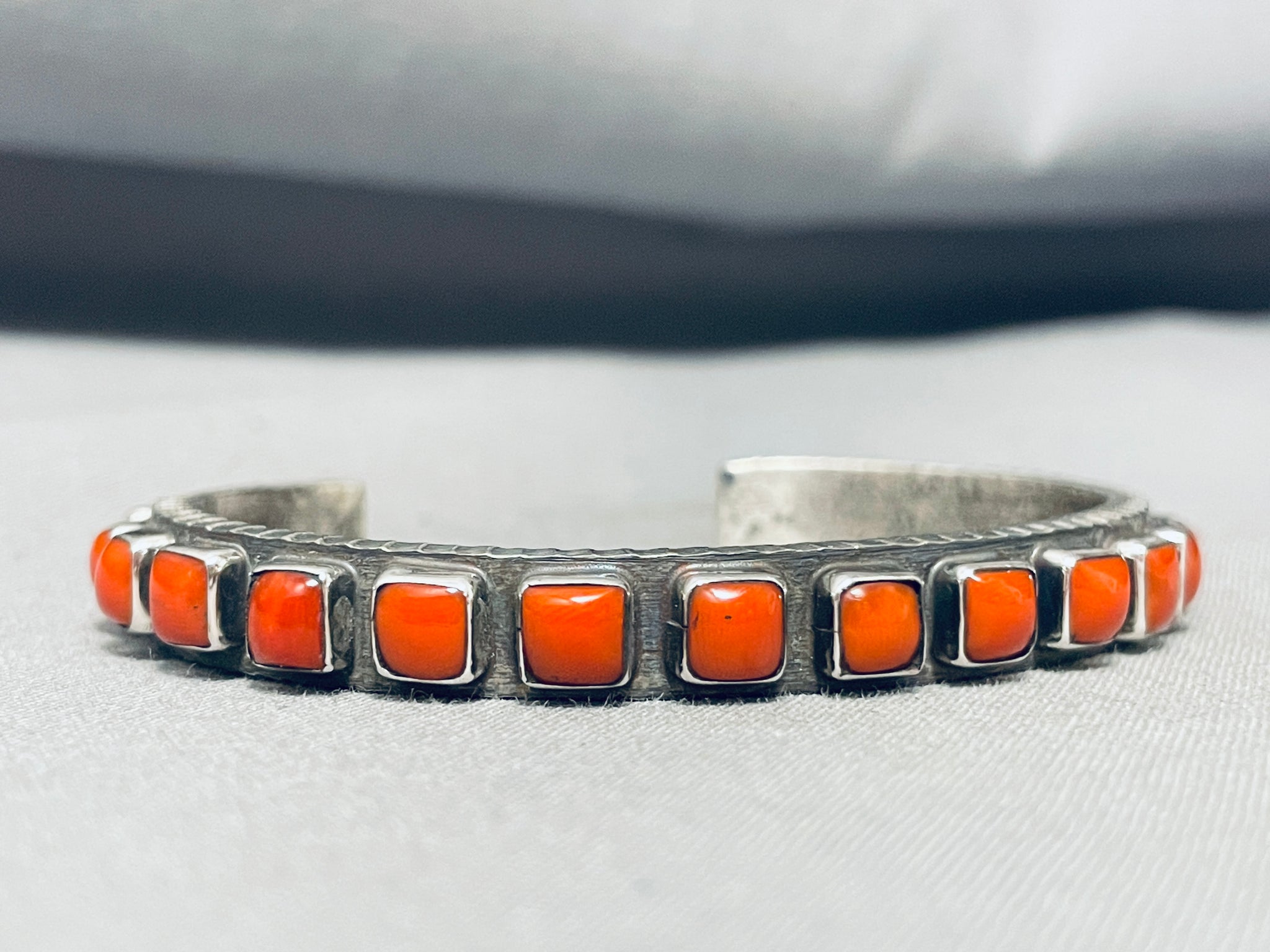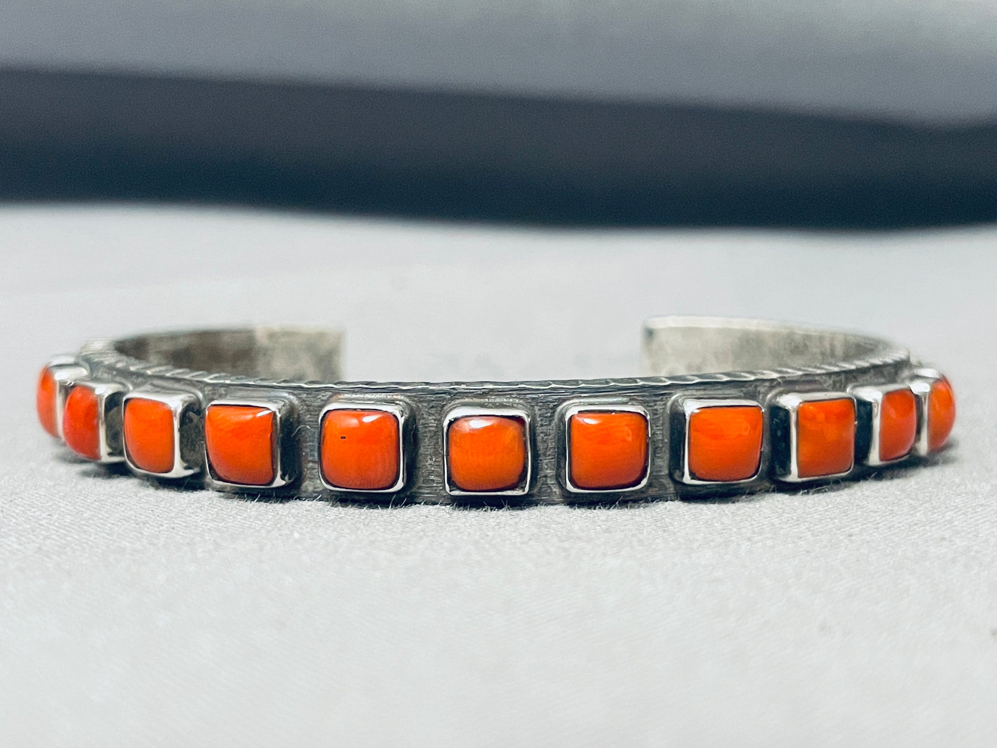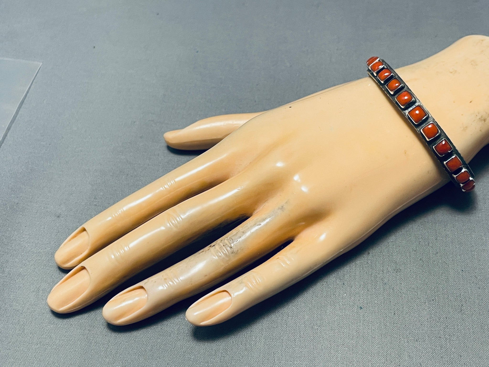 Signed Heavy Native American Navajo Cubed Coral Native American Navajo Sterling Silver Bracelet