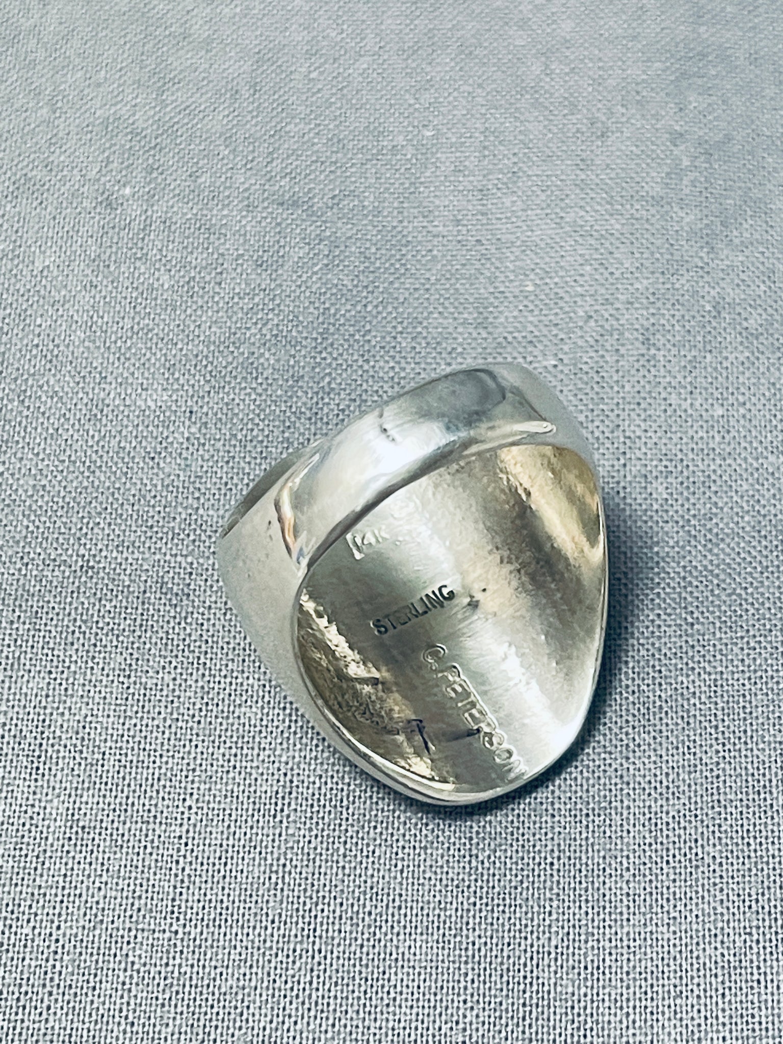 We are proud to offer this stunning Navajo ring featuring a handcarved 14k gold kokopelli on a graduated silver band! Positively Breathtaking! The ring face measures around 1" x 5/8". Signed by Navajo artist, C. Peterson. The ring size is around 9. Sterling silver, marked. Sturdy 17 grams.