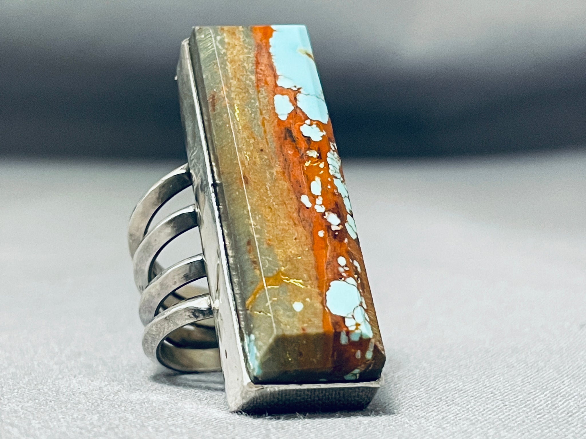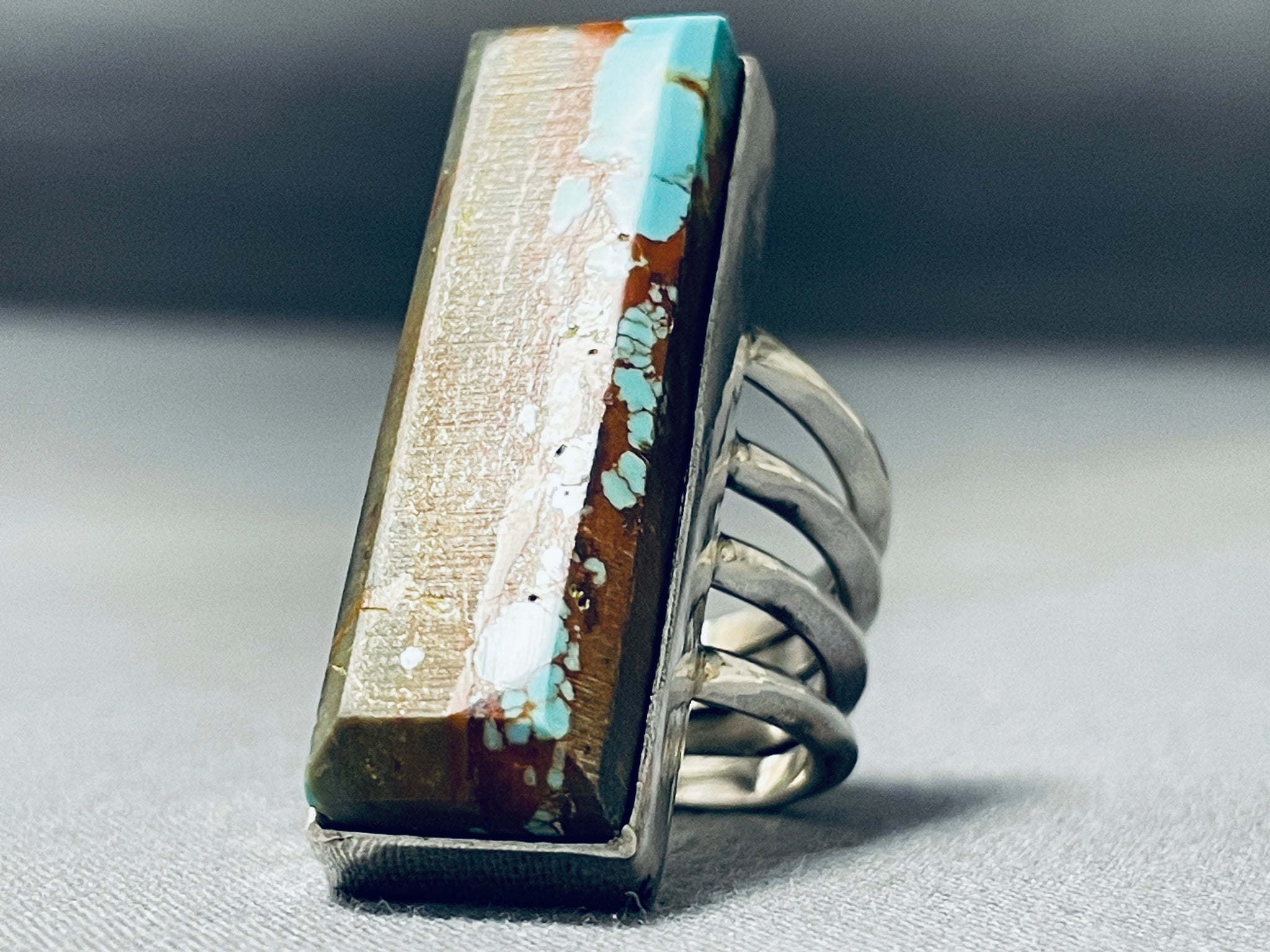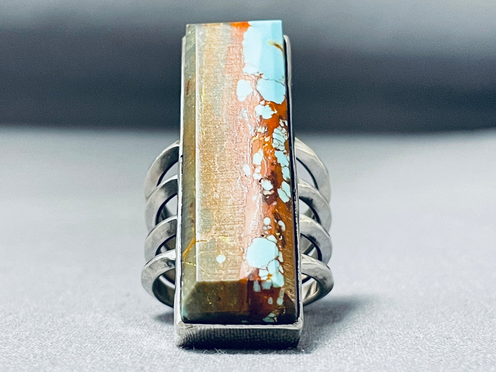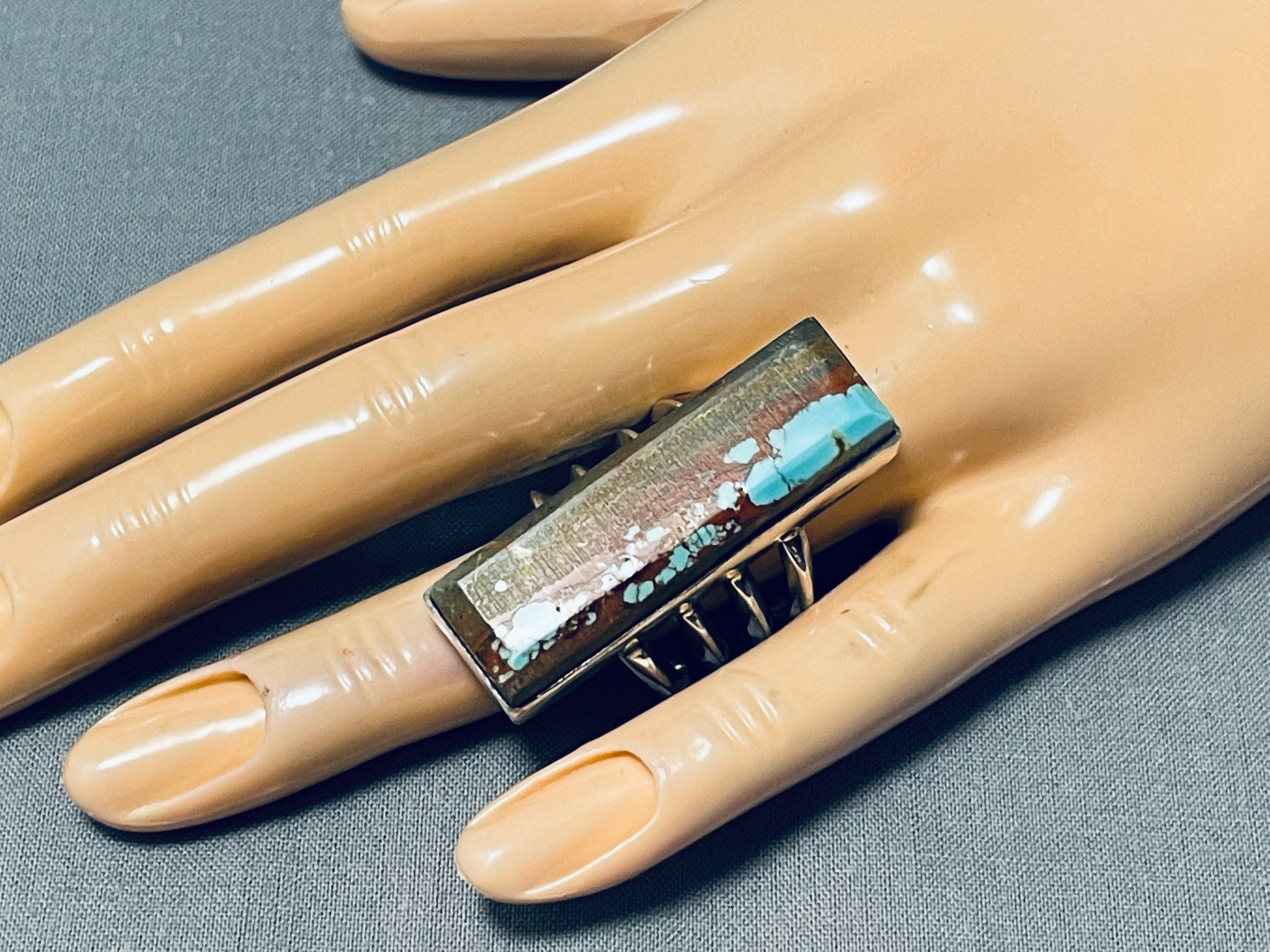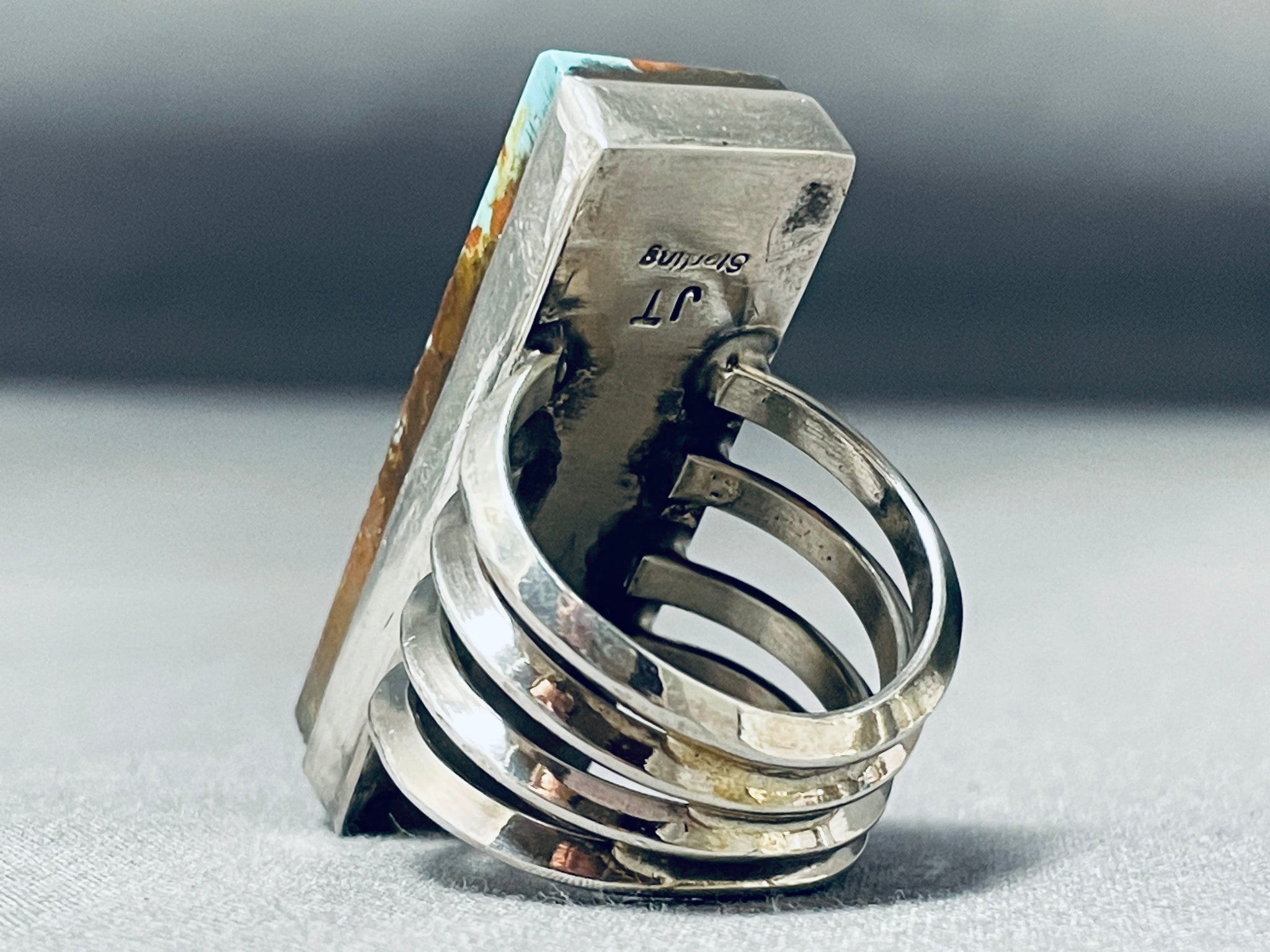This is a marvelous Navajo ring featuring a rectangular #8 turquoise stone on a graduated quadruple rail silver band that reduces to a solid silver band! So Fantastic! The center stone measures around 1-1/2" x 1/2". Signed by Navajo artist, J.T. The ring size is around 8. Sterling silver, marked. Sturdy 21 grams.