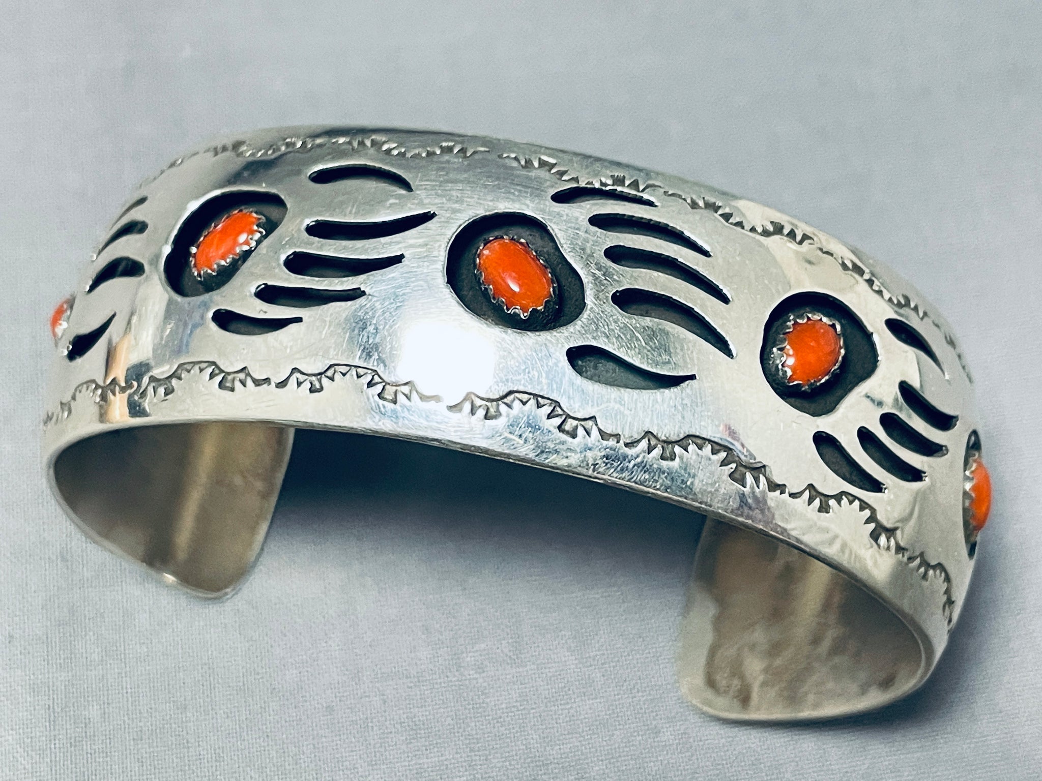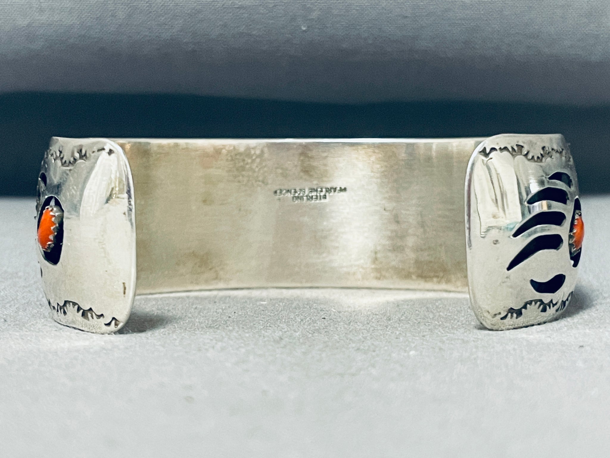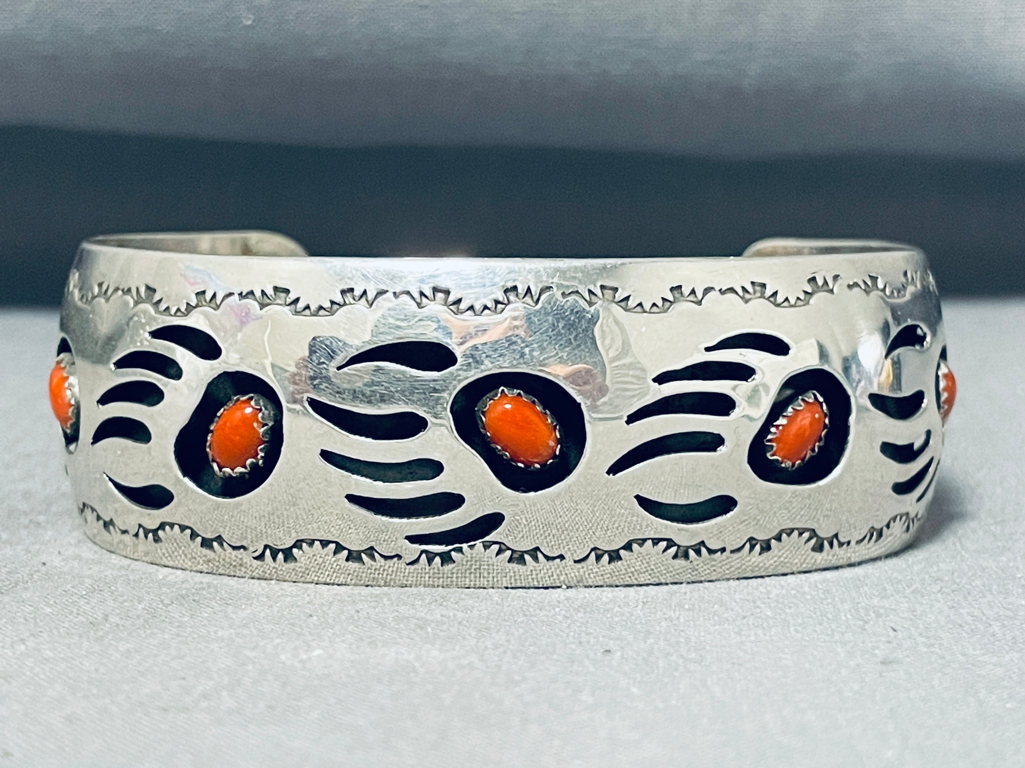 Signed Native American Navajo Coral Sterling Silver Bear Paw Bracelet