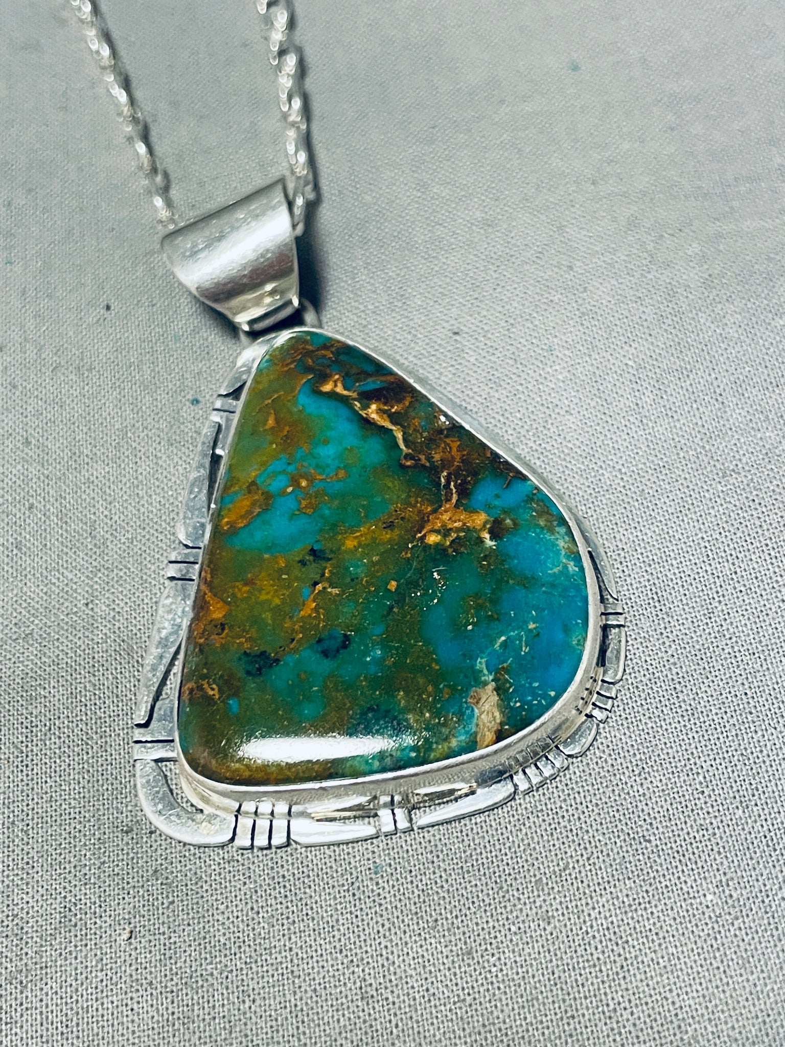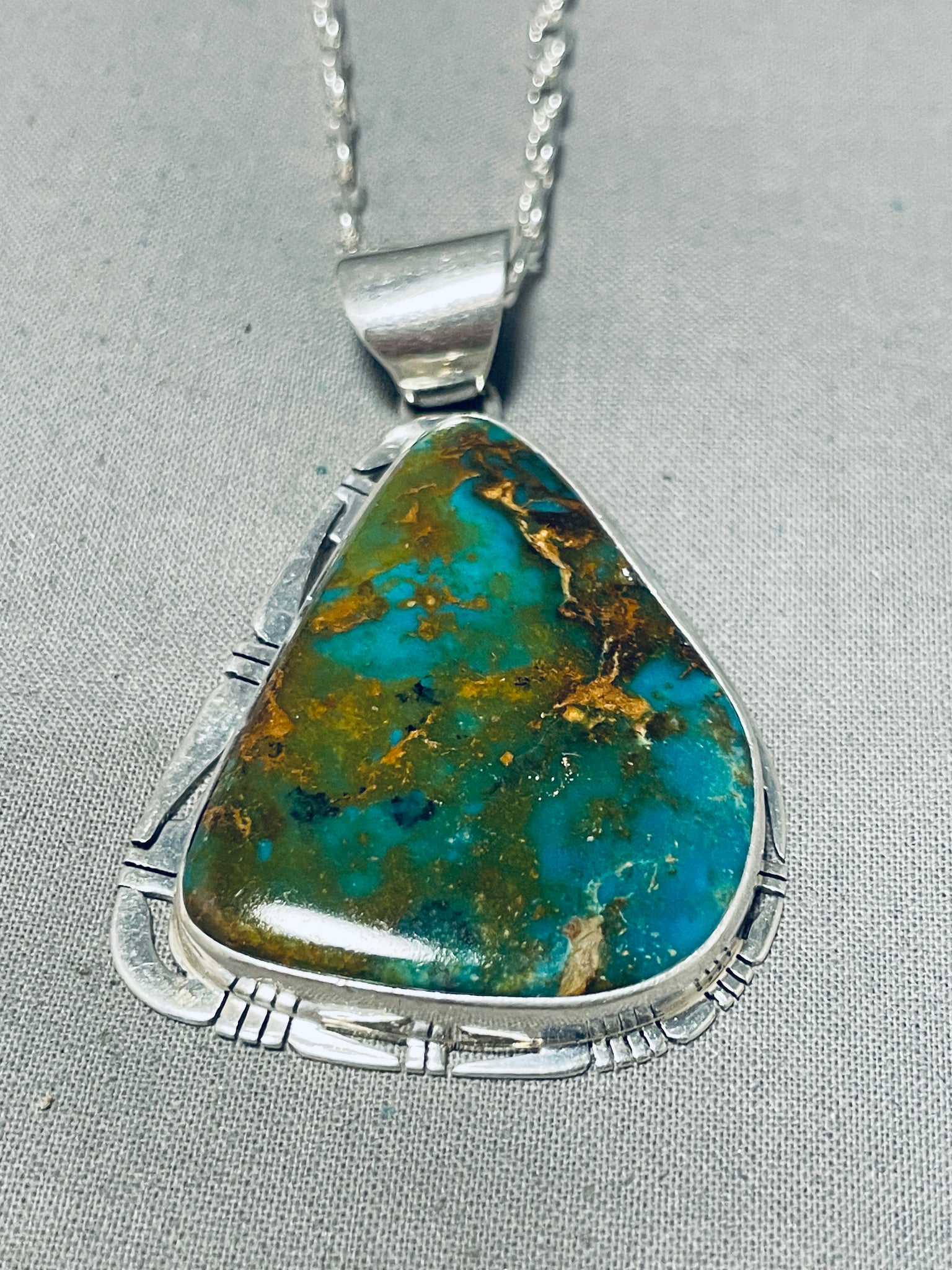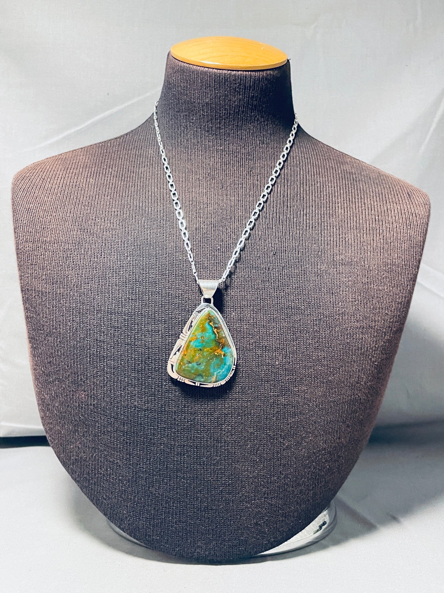 Up for sale is this elegant Navajo necklace! It features a huge Royston turquoise pendant and a silver chain and clasp! A gorgouse statement piece!