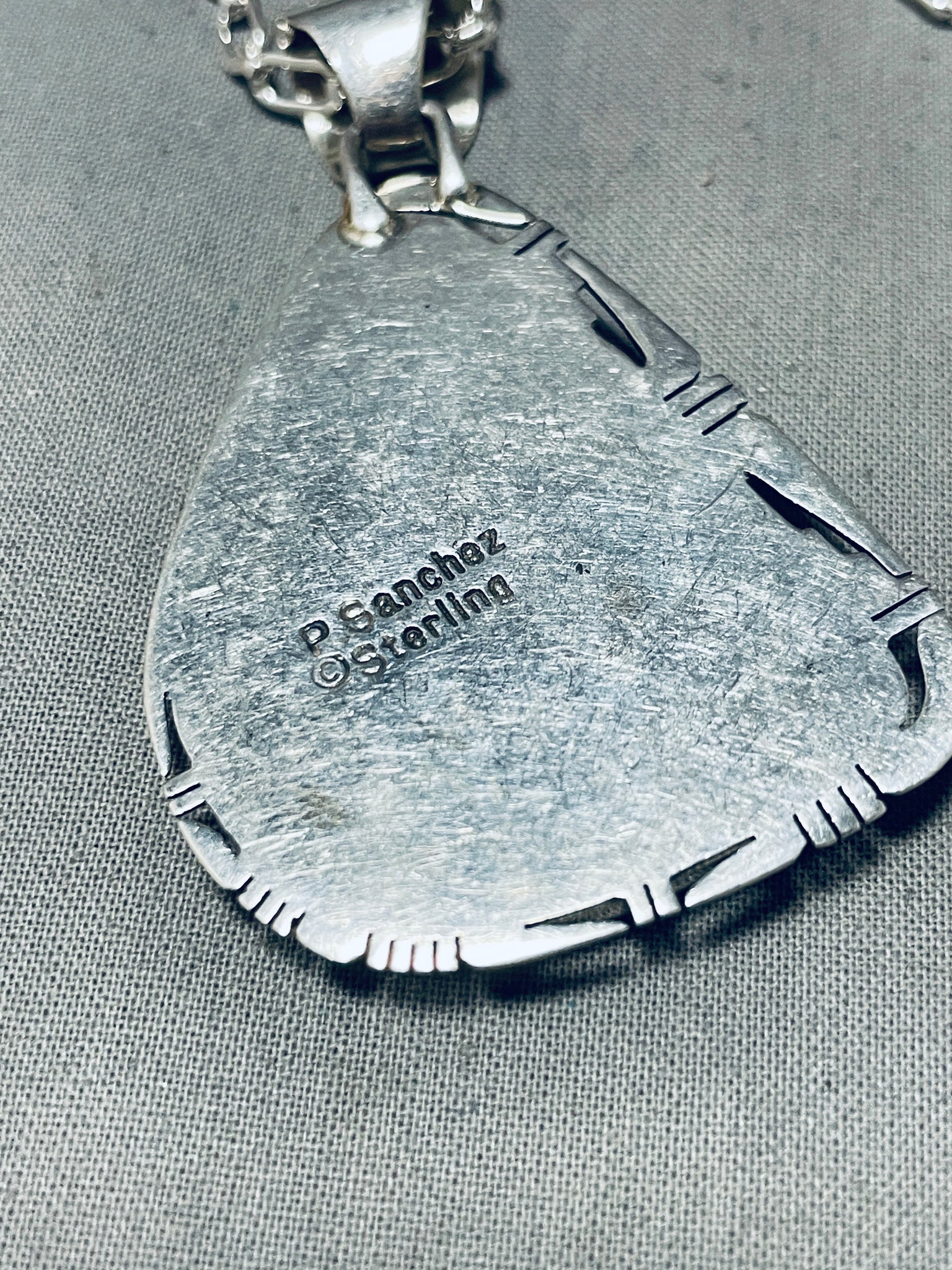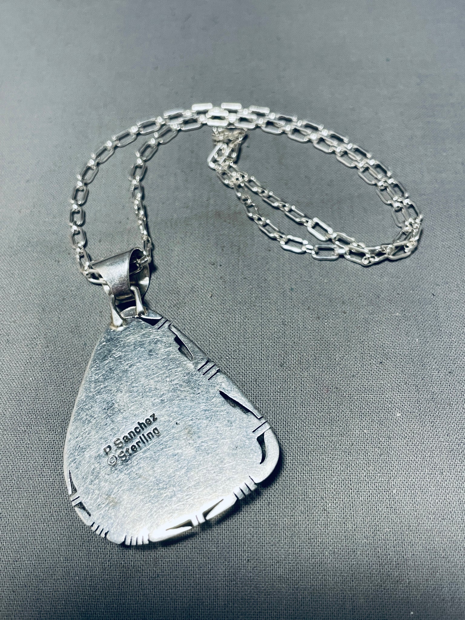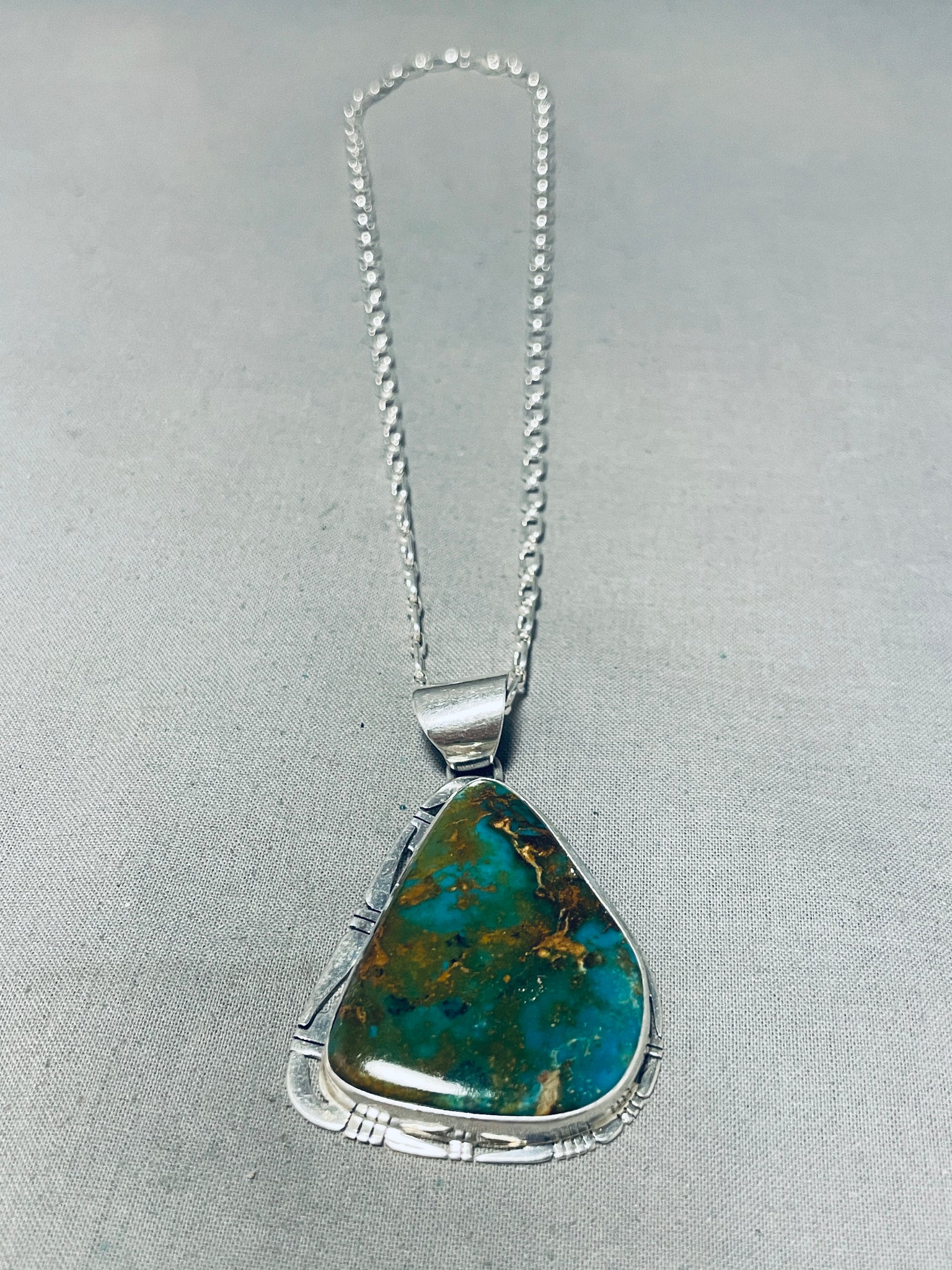 Nestled within the rugged landscape of Nevada, the Royston turquoise mine stands as a testament to nature's artistic prowess. Revered for its remarkable spectrum of colors ranging from vivid blues to earthy greens, accented by striking golden-brown matrix, Royston turquoise is celebrated for its unique and captivating beauty. With a history steeped in Native American tradition and mining lore, this mine has captivated artisans and collectors for generations, each stone bearing the unmistakable mark of its desert origins. Despite the challenges posed by the harsh desert environment, the Royston mine continues to yield stones of exceptional quality and character, each a testament to the enduring allure of the American Southwest. As a cherished symbol of resilience and natural splendor, Royston turquoise holds a special place in the hearts of those who appreciate the timeless beauty of handcrafted treasures from the earth. Sterling silver, marked. Signed by Navajo artist, P. Sanchez. The length of the necklace measures around 22". Sturdy 33 grams.