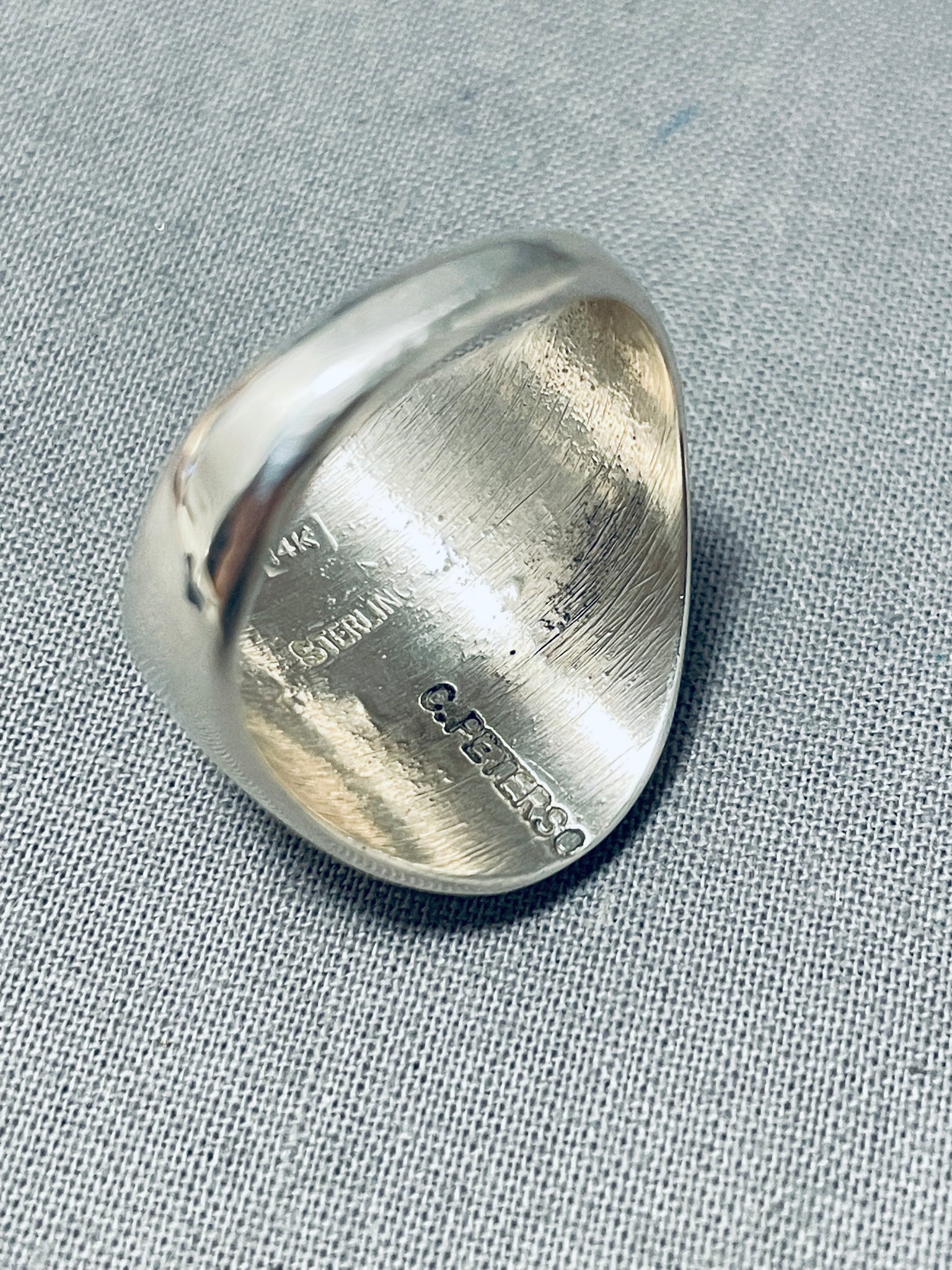 This is an exceptional Navajo ring featuring a handcarved 14k gold kokopelli on a graduated solid silver band! So Superb! The ring face measures around 7/8" x 5/8". Signed by Navajo artist, C. Peterson. The ring size is around 10. 14k gold and sterling silver, marked. Sturdy 12 grams.