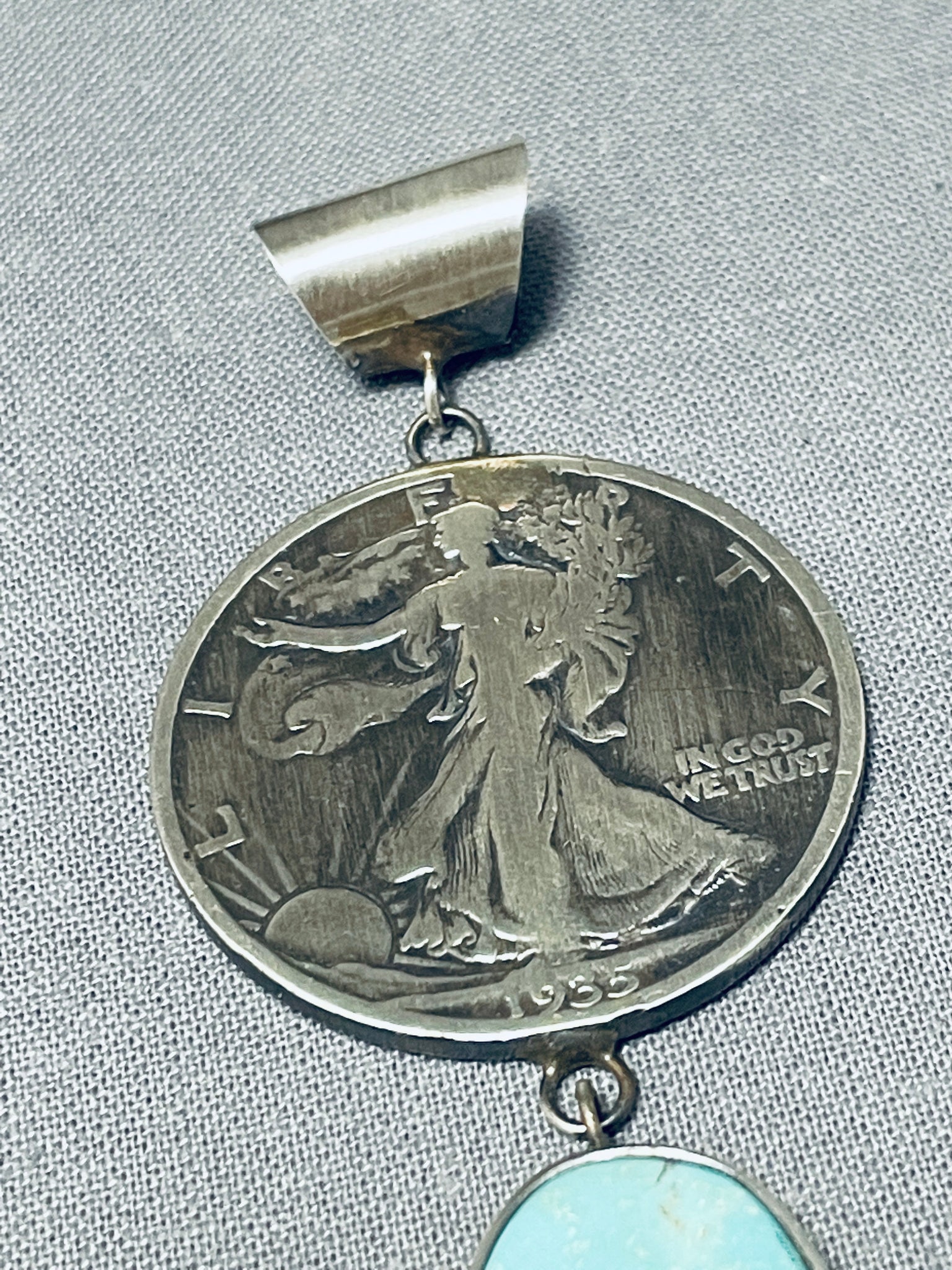 Signed Native American Navajo Turquoise Sterling Silver Coin Feather Pendant