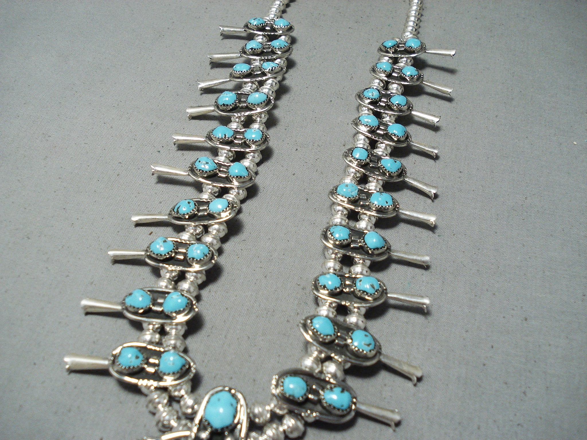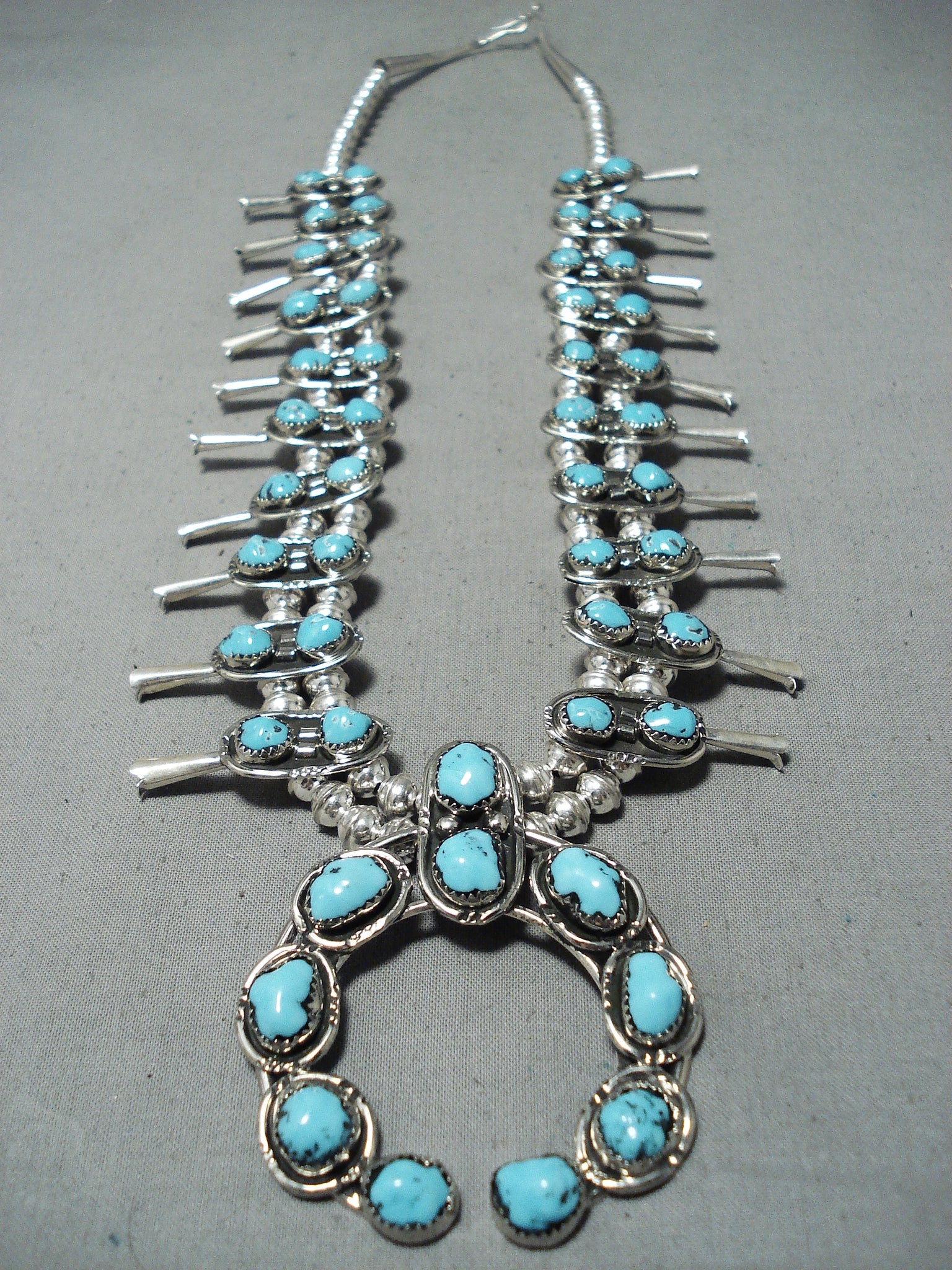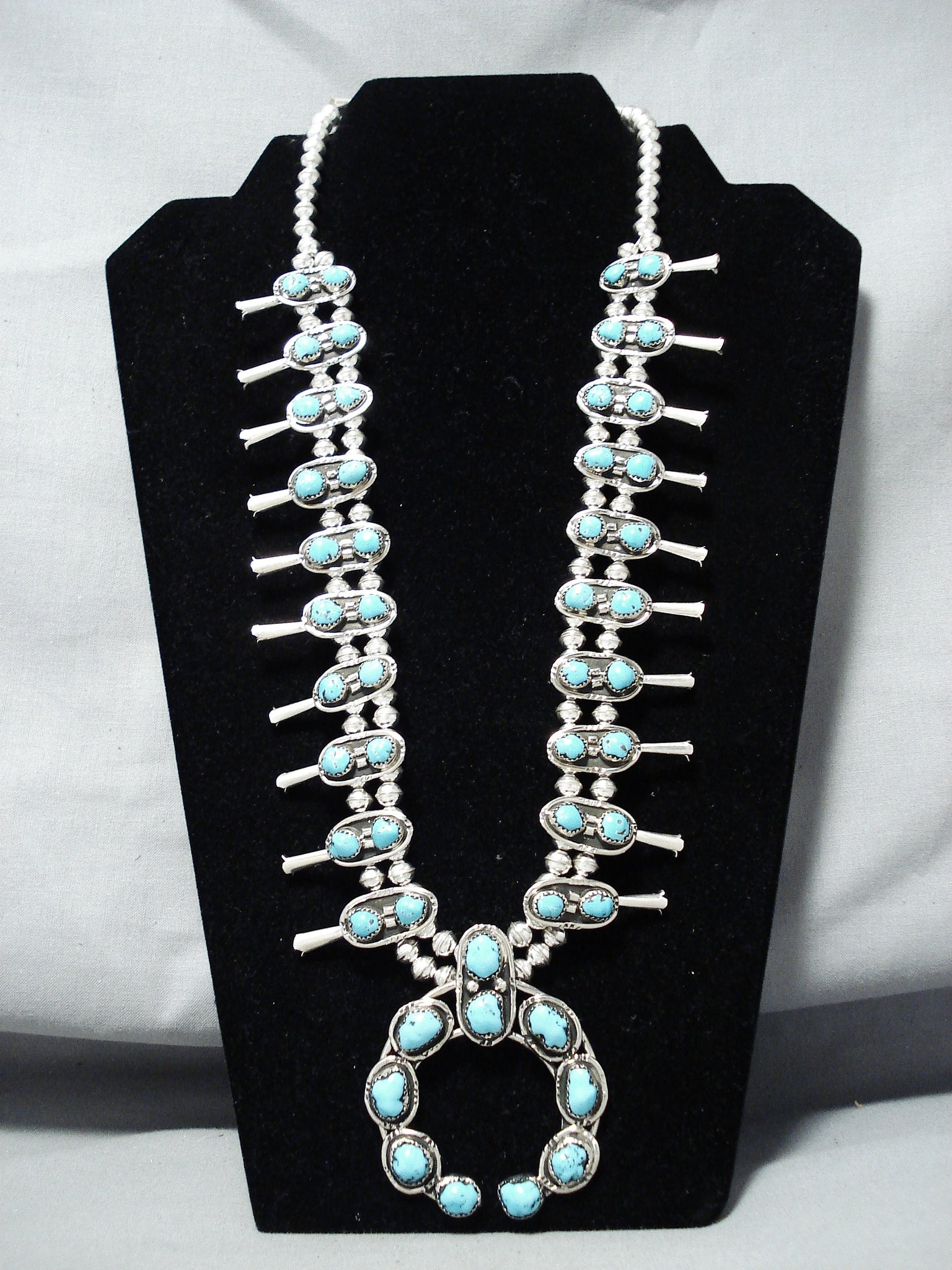 Signed Native American Navajo Turquoise Sterling Silver Squash Blossom Necklace