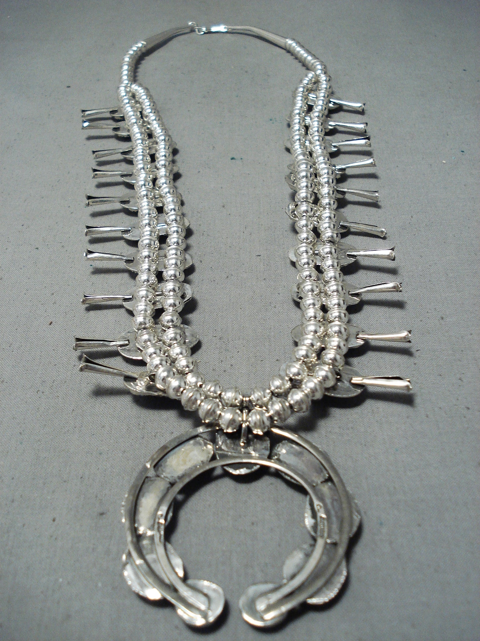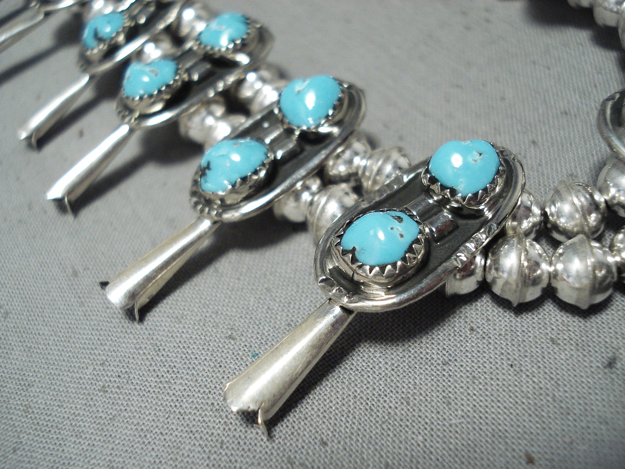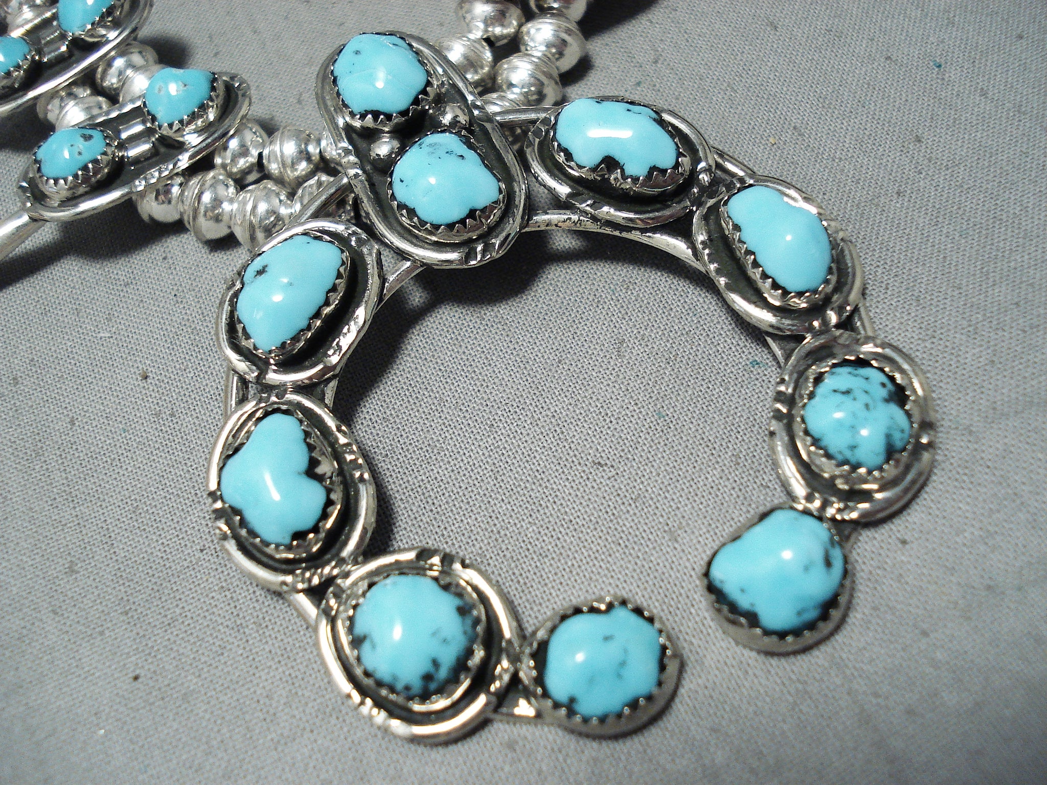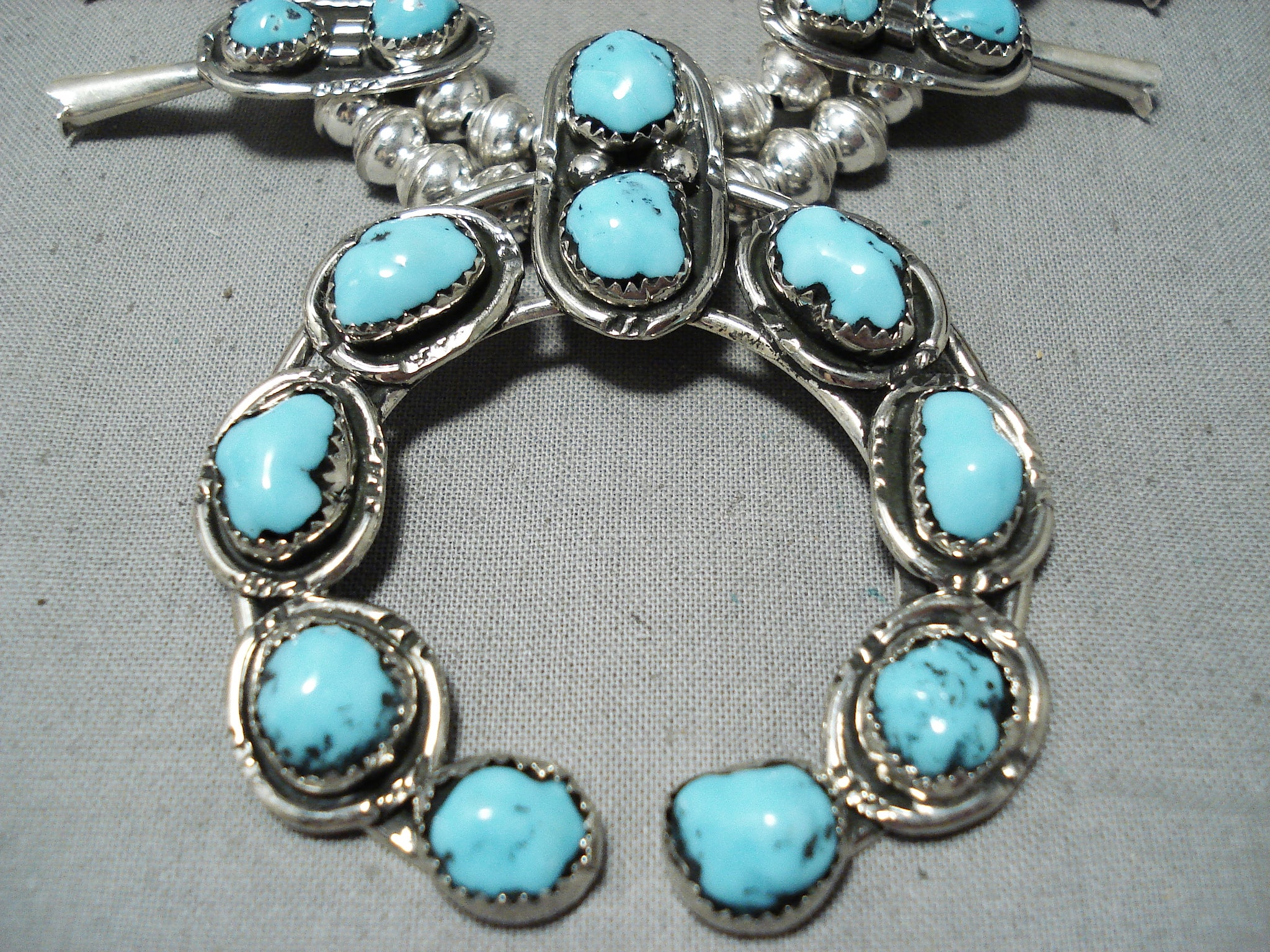 Signed Native American Navajo Turquoise Sterling Silver Squash Blossom Necklace