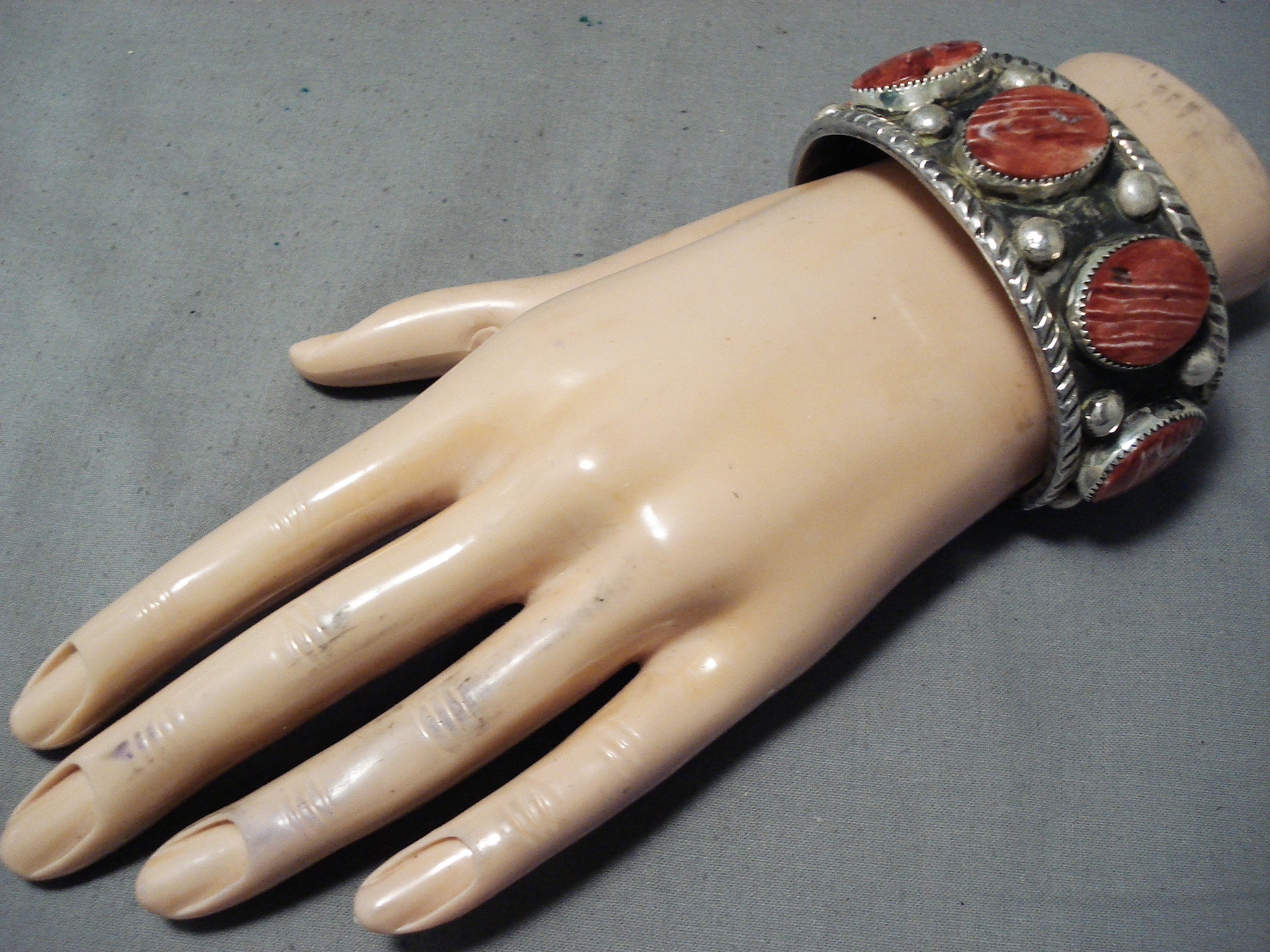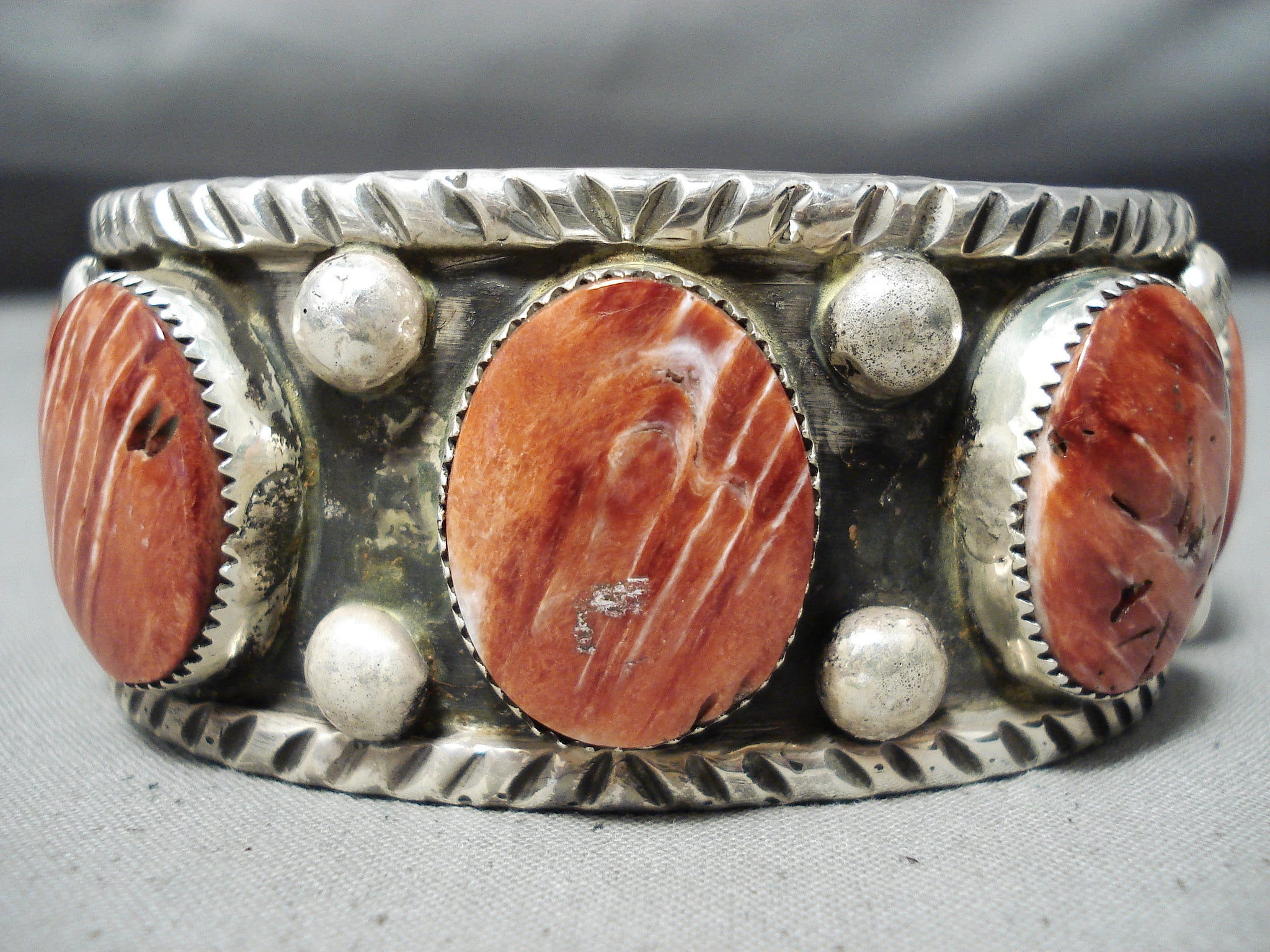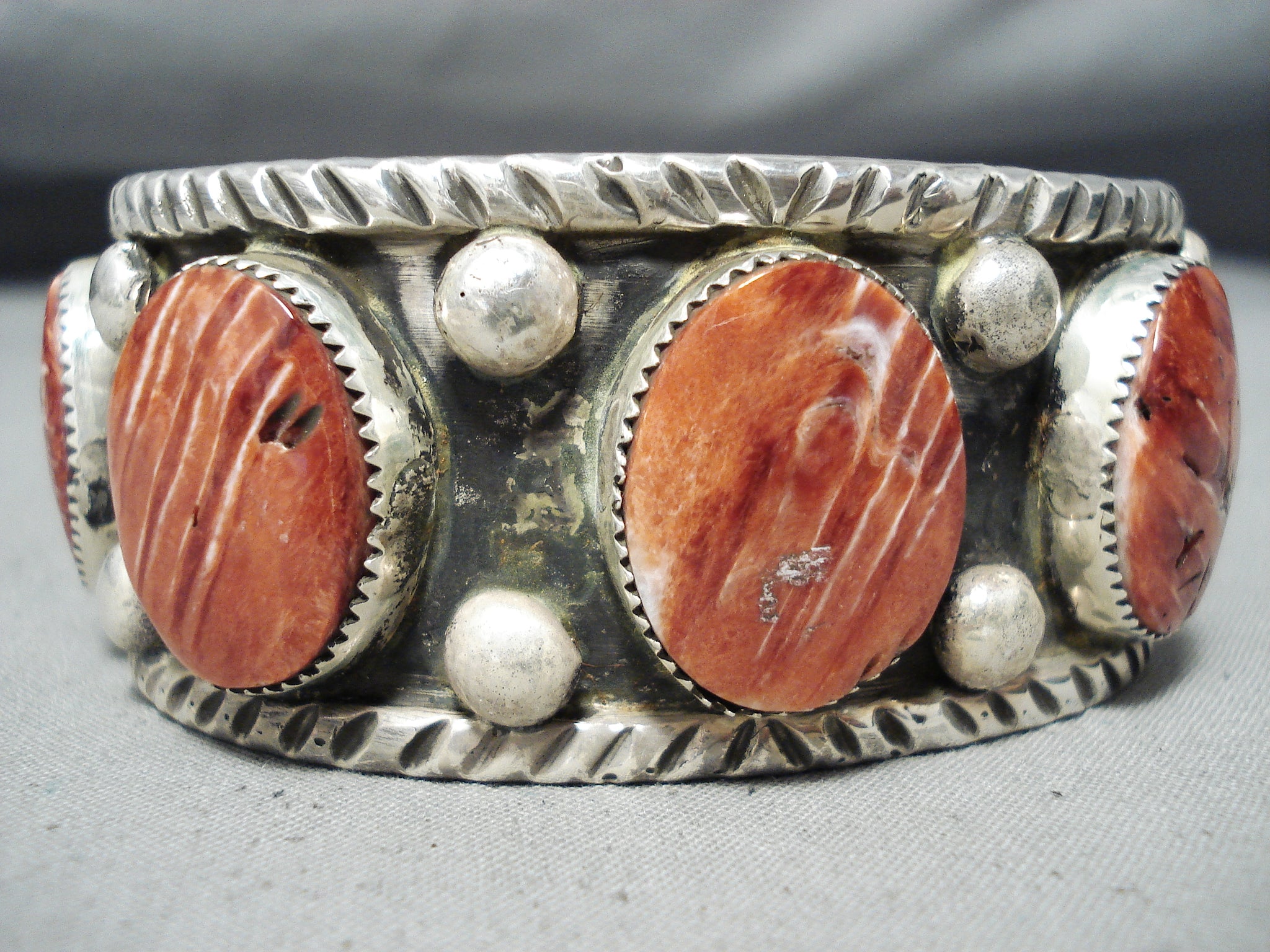 Signed Navajo Red Spiny Oyster Sterling Silver Bracelet Native American