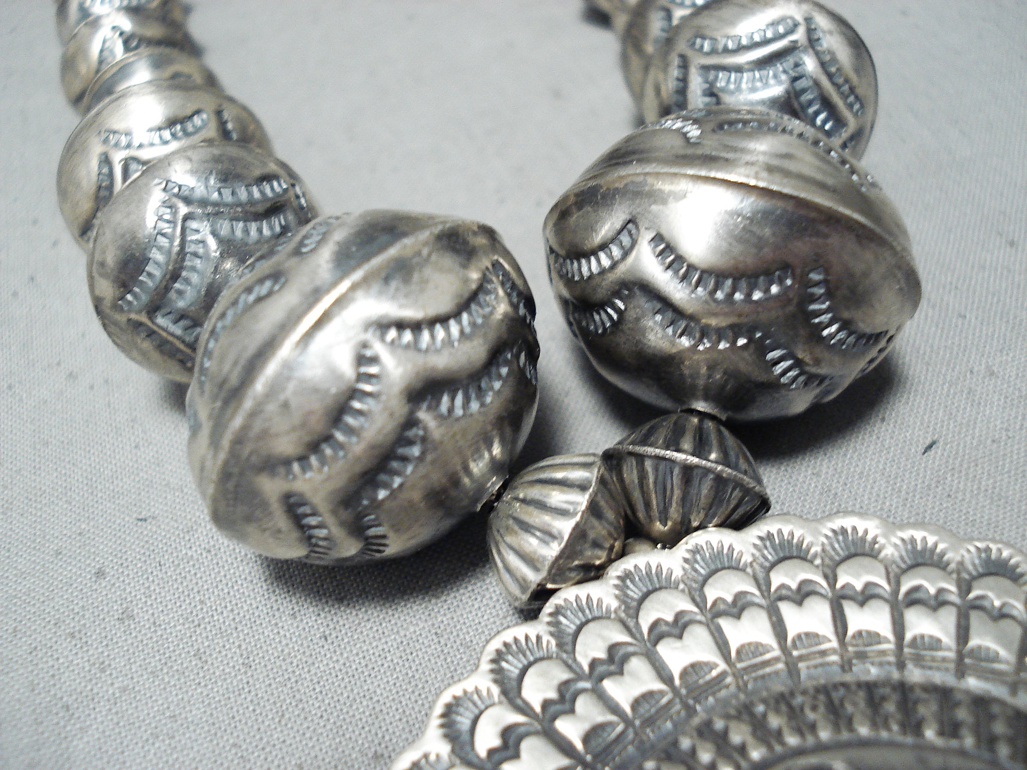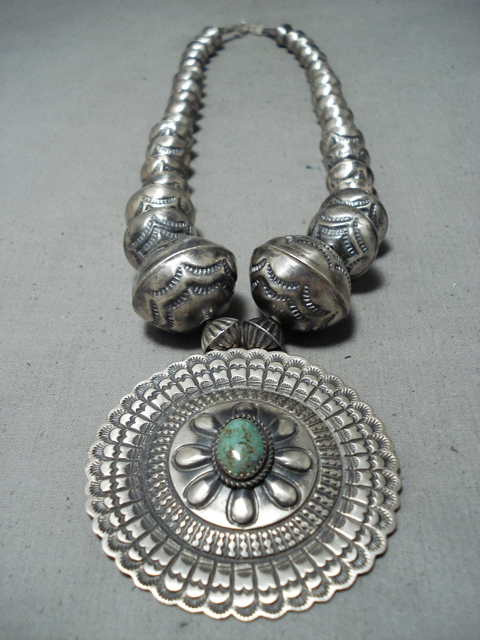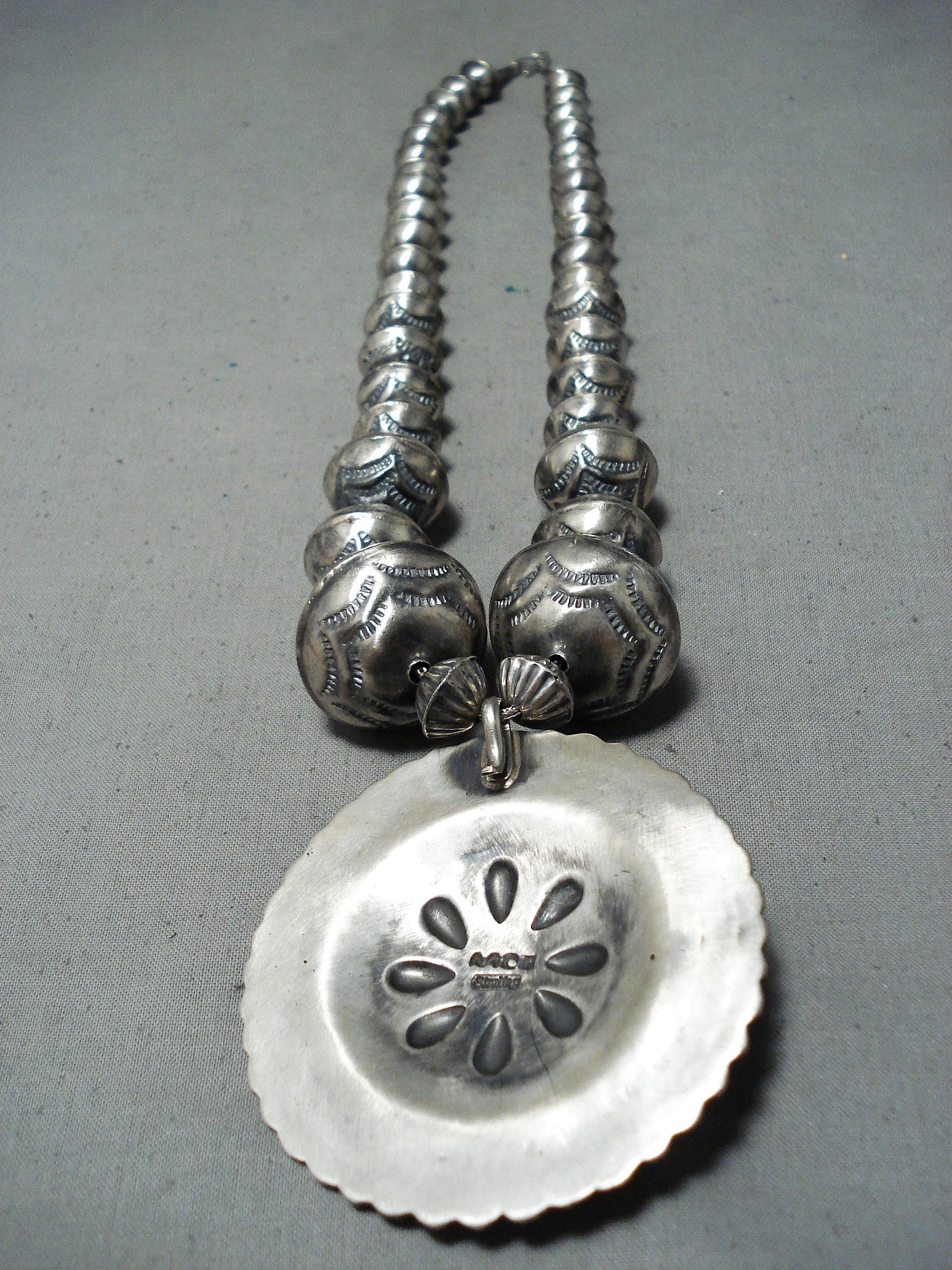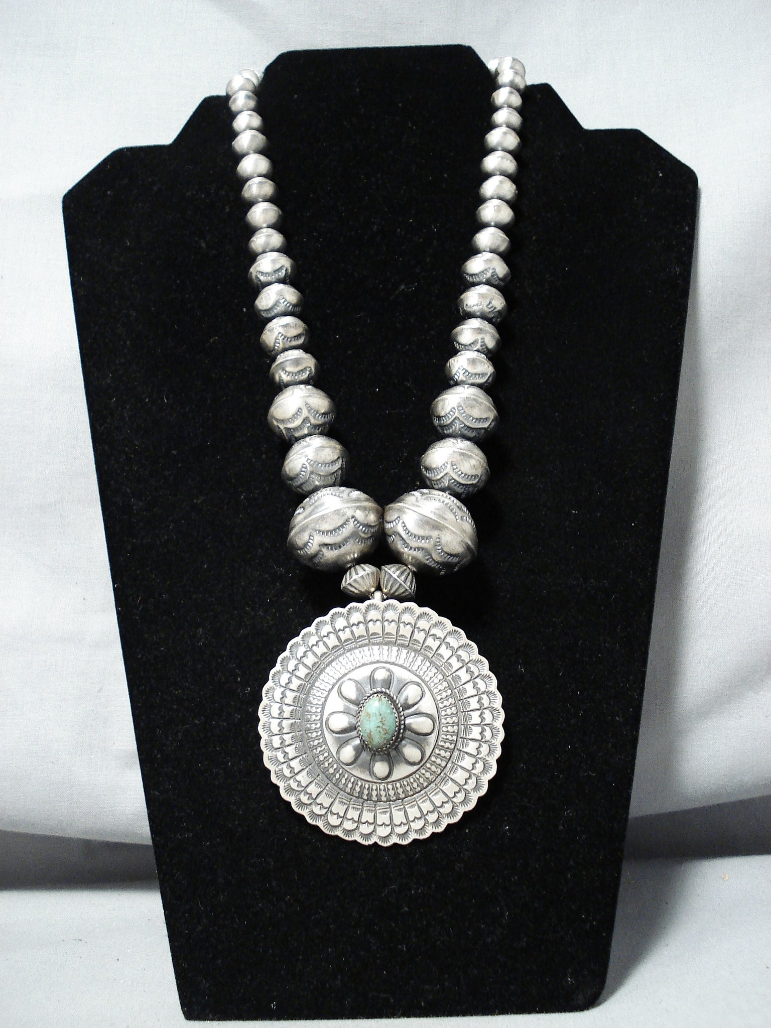 We are proud to offer this striking Navajo silver necklace. This necklace really has so many exceptional attributes to it! The beads of the necklace graduate in size, with the larger ones also decorated with beautiful handstampings! And attached at the center is the round scalloped handstamped 2-1/2" pendant with repousse designs surrounding the beautiful ½" x 3/8" Royston turquoise stone in the very center! Enough said! Sterling silver, marked. Signed by Navajo artist, Marynne Cayaditto. The length of the necklace measures around 25". Sturdy 96 grams.