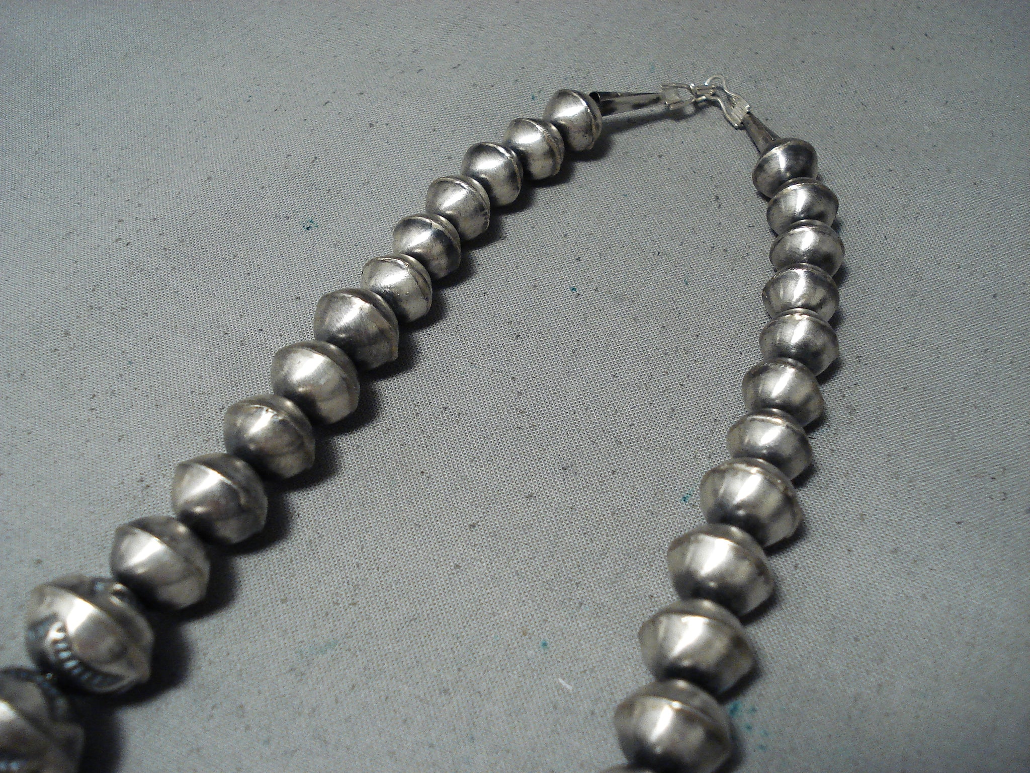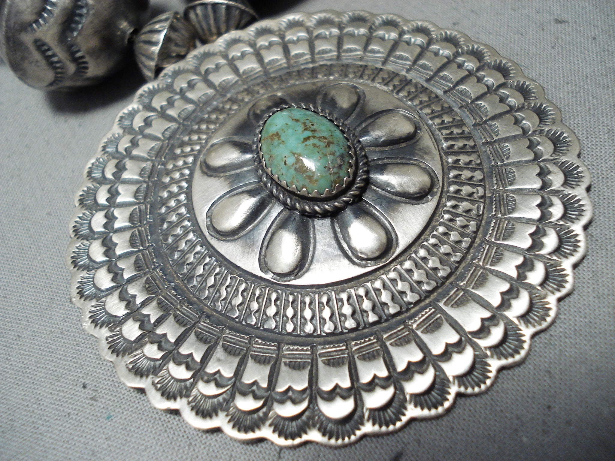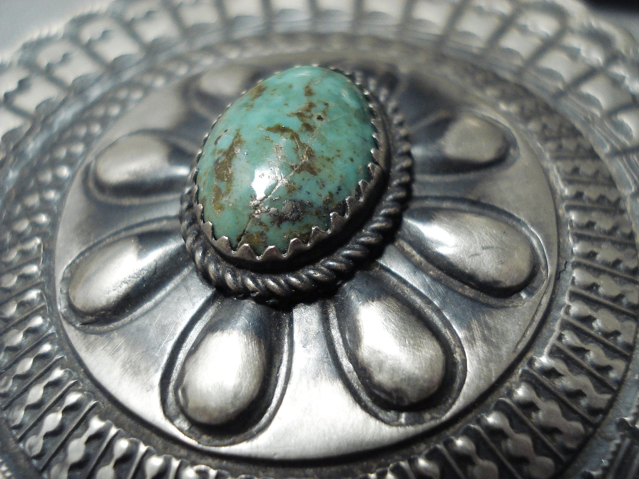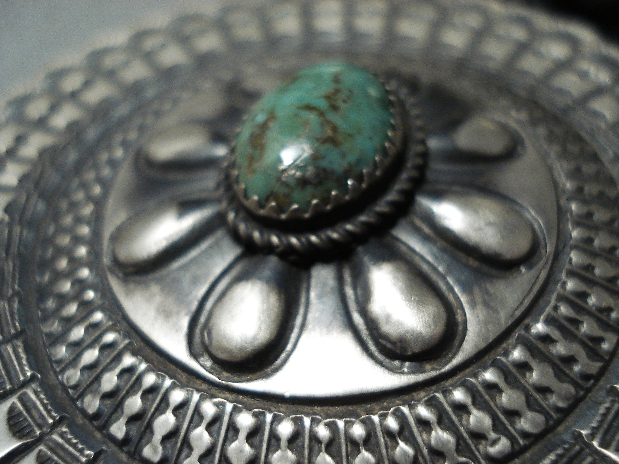 We are proud to offer this striking Navajo silver necklace. This necklace really has so many exceptional attributes to it! The beads of the necklace graduate in size, with the larger ones also decorated with beautiful handstampings! And attached at the center is the round scalloped handstamped 2-1/2" pendant with repousse designs surrounding the beautiful ½" x 3/8" Royston turquoise stone in the very center! Enough said! Sterling silver, marked. Signed by Navajo artist, Marynne Cayaditto. The length of the necklace measures around 25". Sturdy 96 grams.
