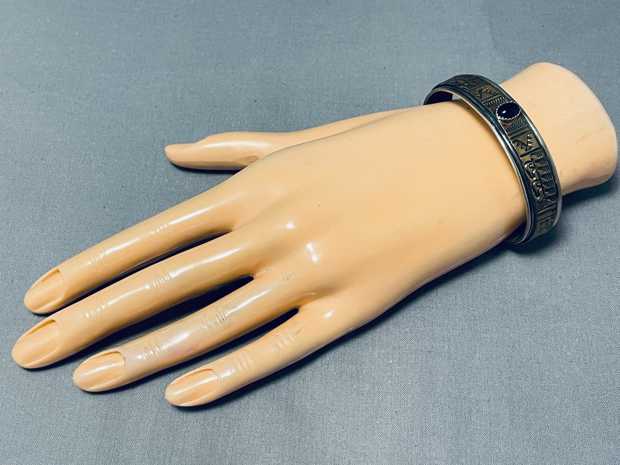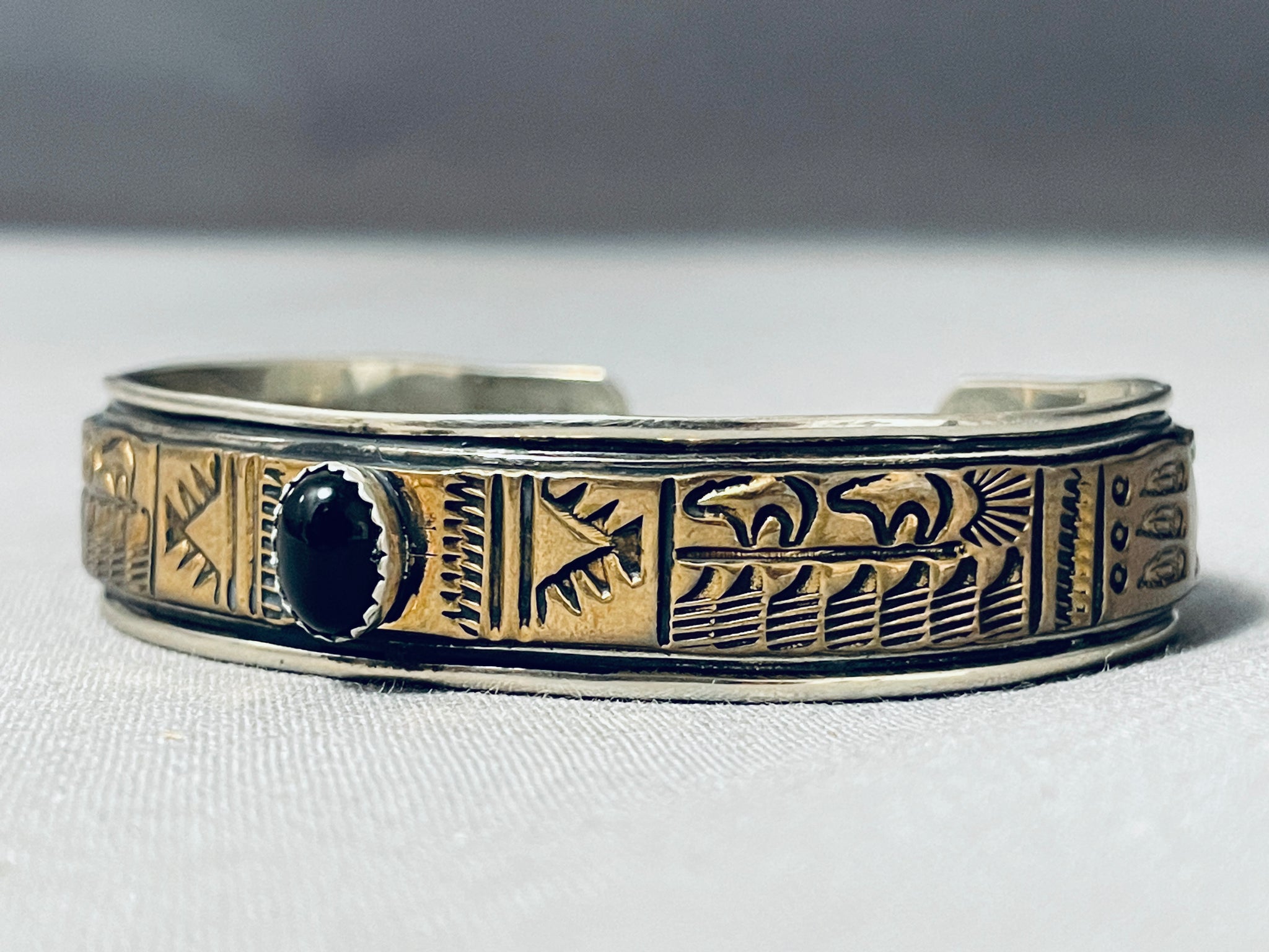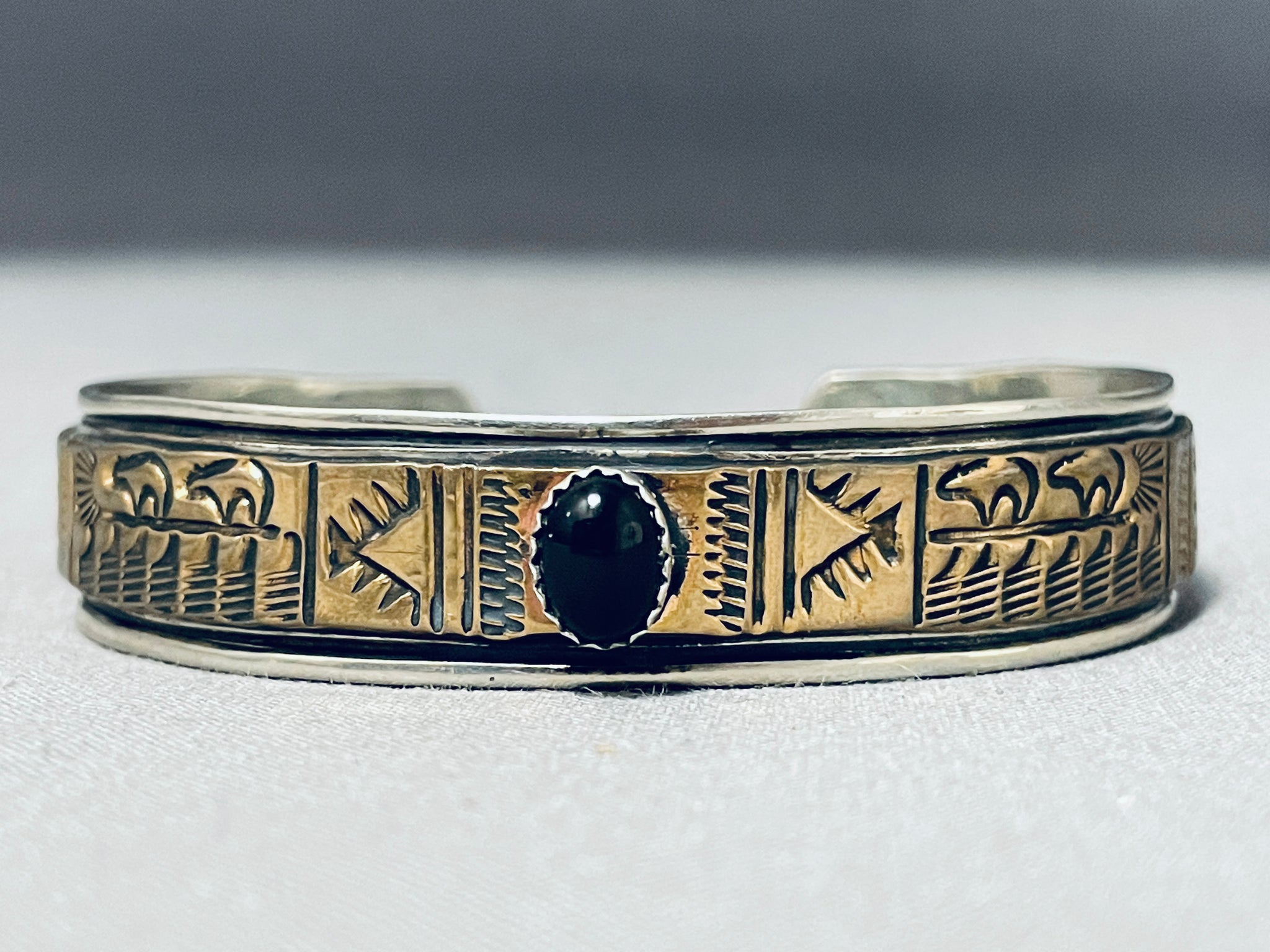 Signed Vintage Native American Navajo Black Onyx Sterling Silver Bracelet