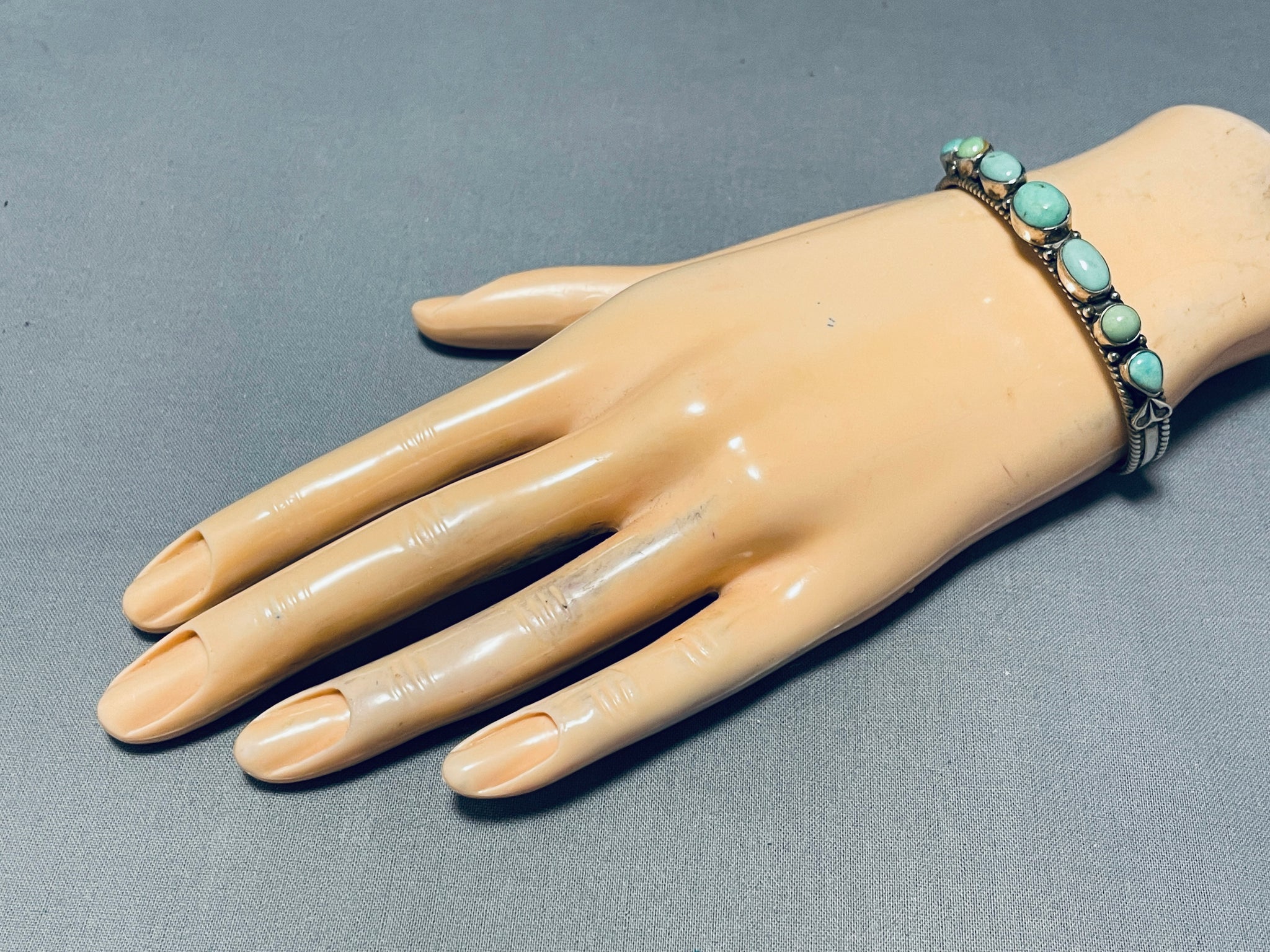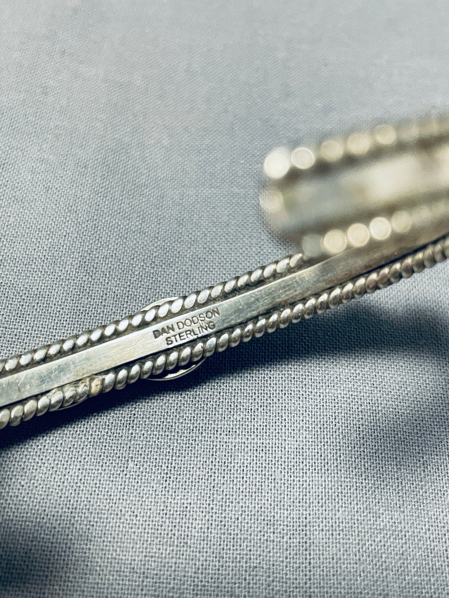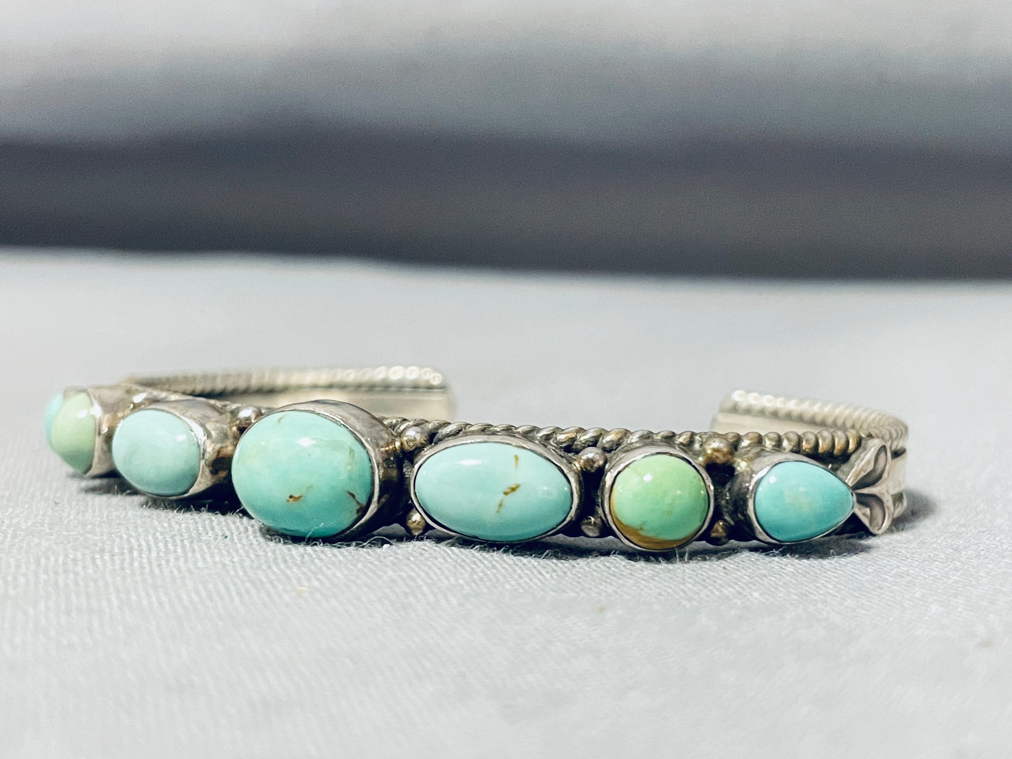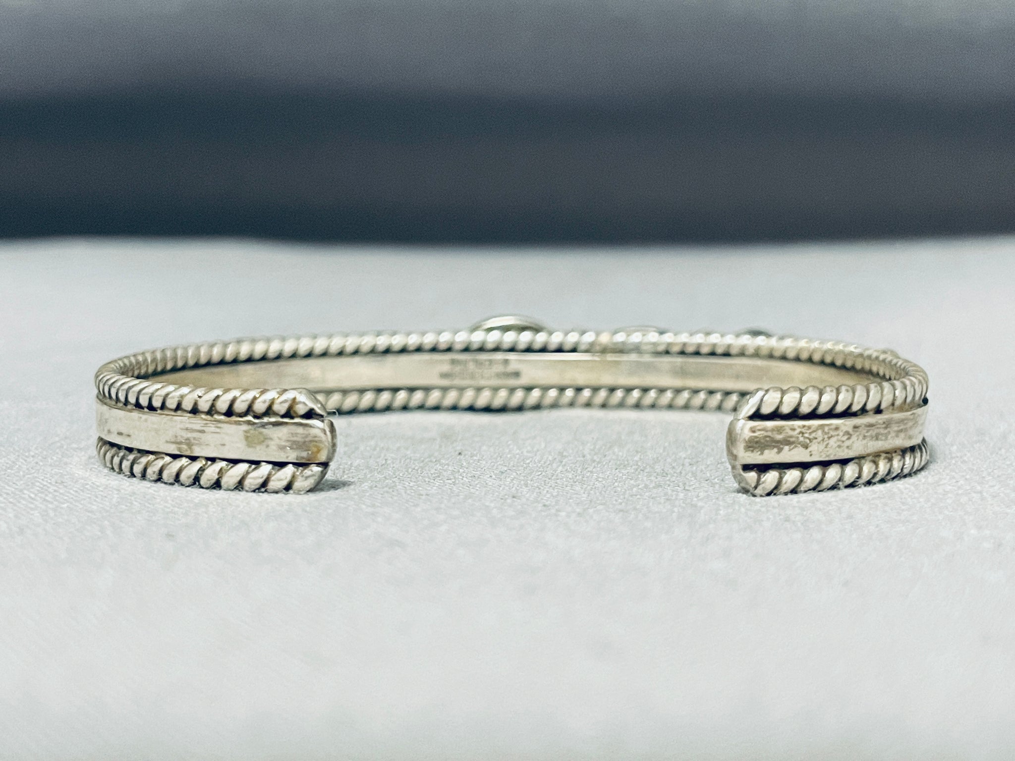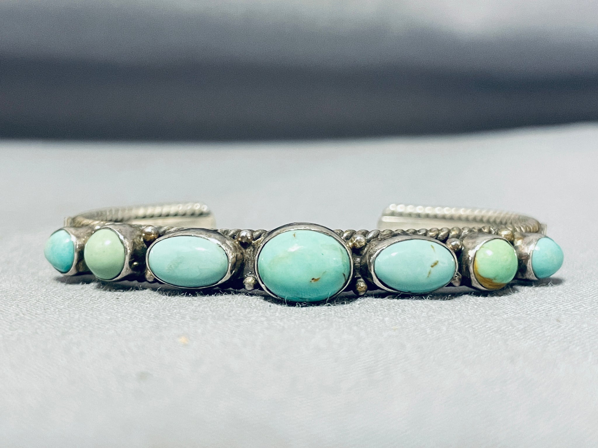 Here we have an exquisite vintage Navajo bracelet featuring 7 green turquoise stones, and silver beads, on a solid silver cuff with handcarved rope borders! Truly Enticing! The center stone measures around 3/8" x 3/8". The width of the bracelet measures around 1/4". Signed by Navajo artist, Dan Dodson. Sterling silver, marked. The inside end to end measures around 5-1/4" with an additional 1-1/4" gap. Sturdy 21 grams.