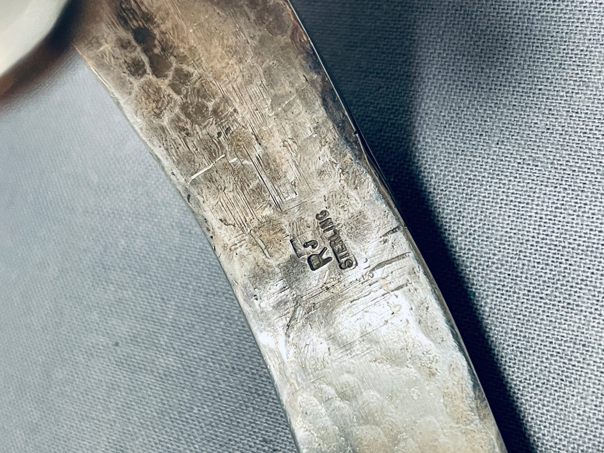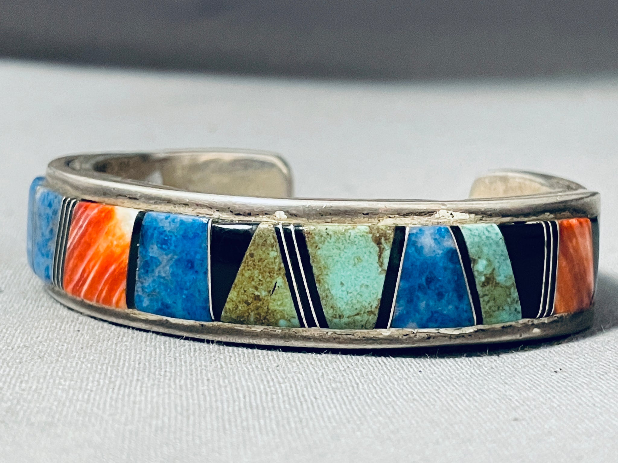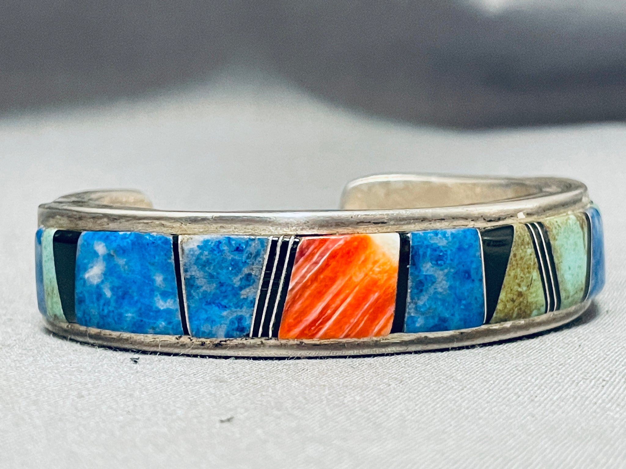 Signed Vintage Native American Navajo Intricate Turquoise Sterling Silver Inlay Bracelet