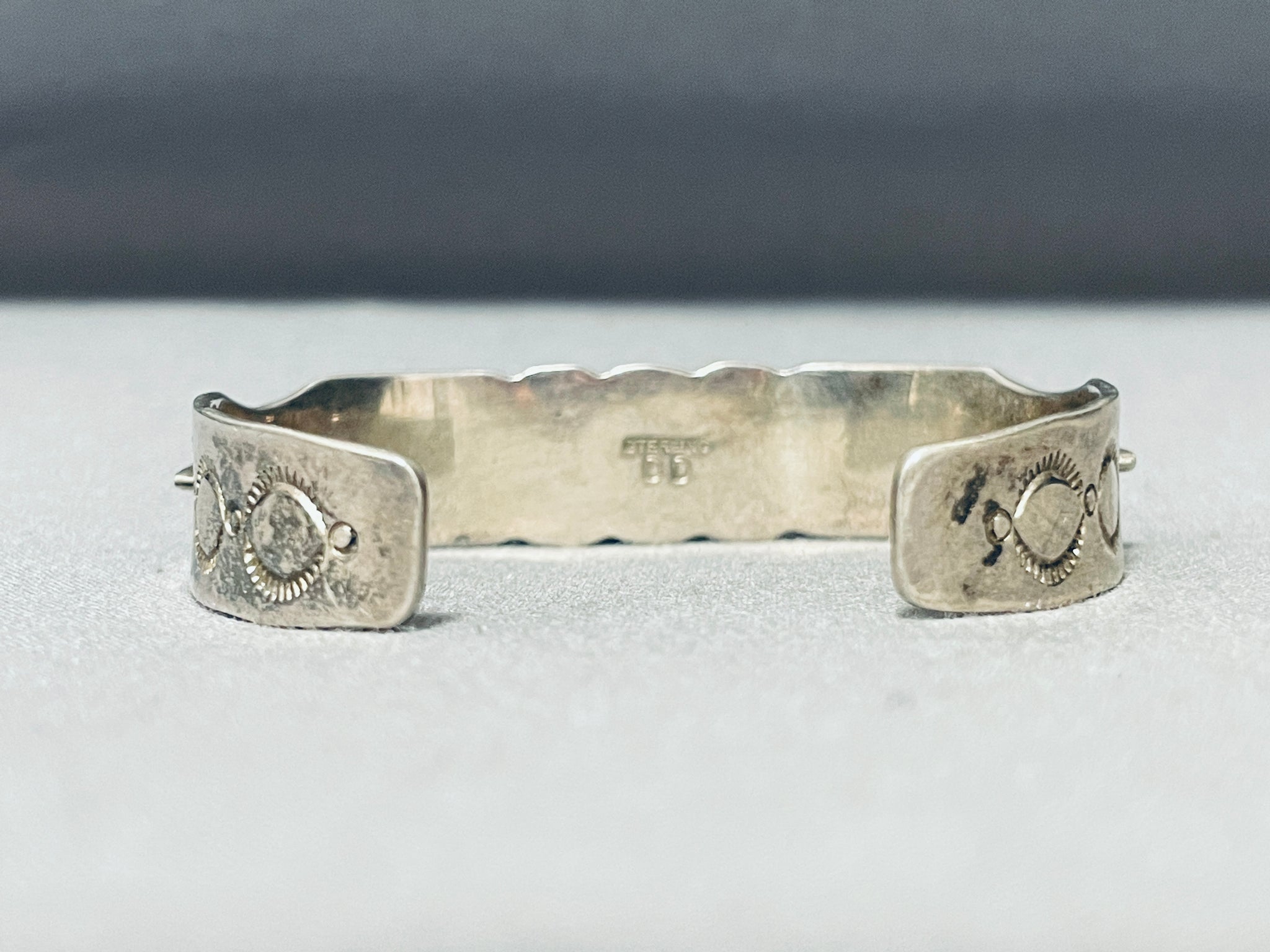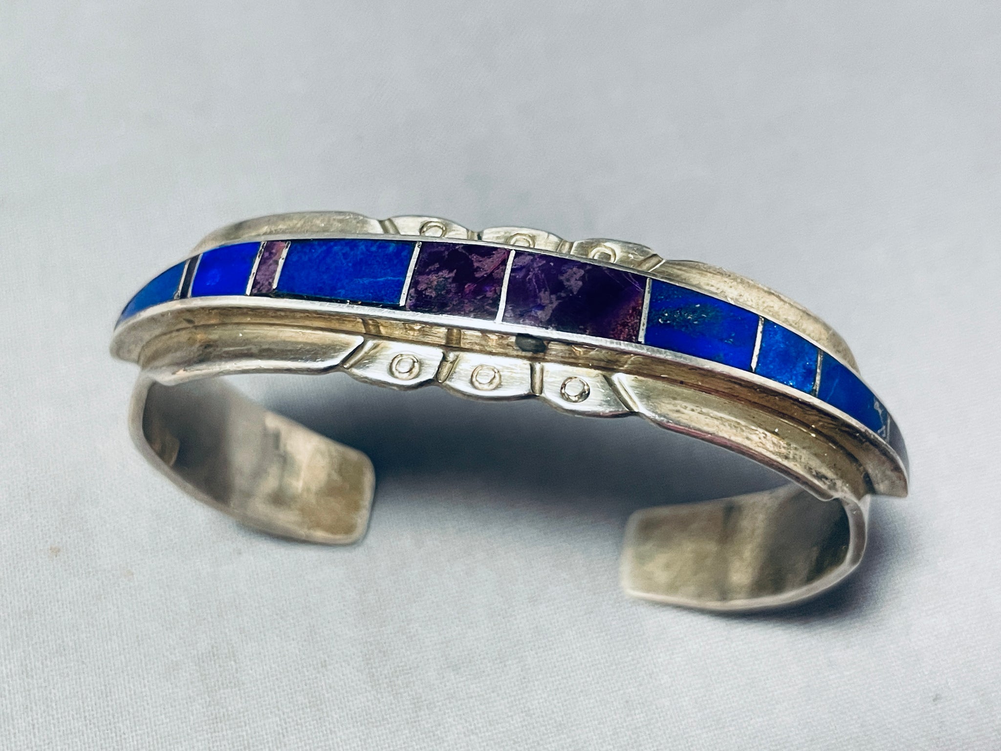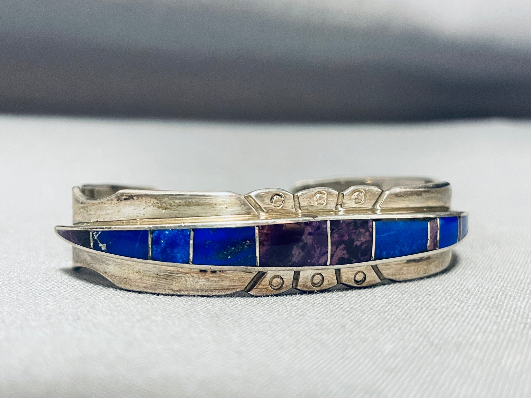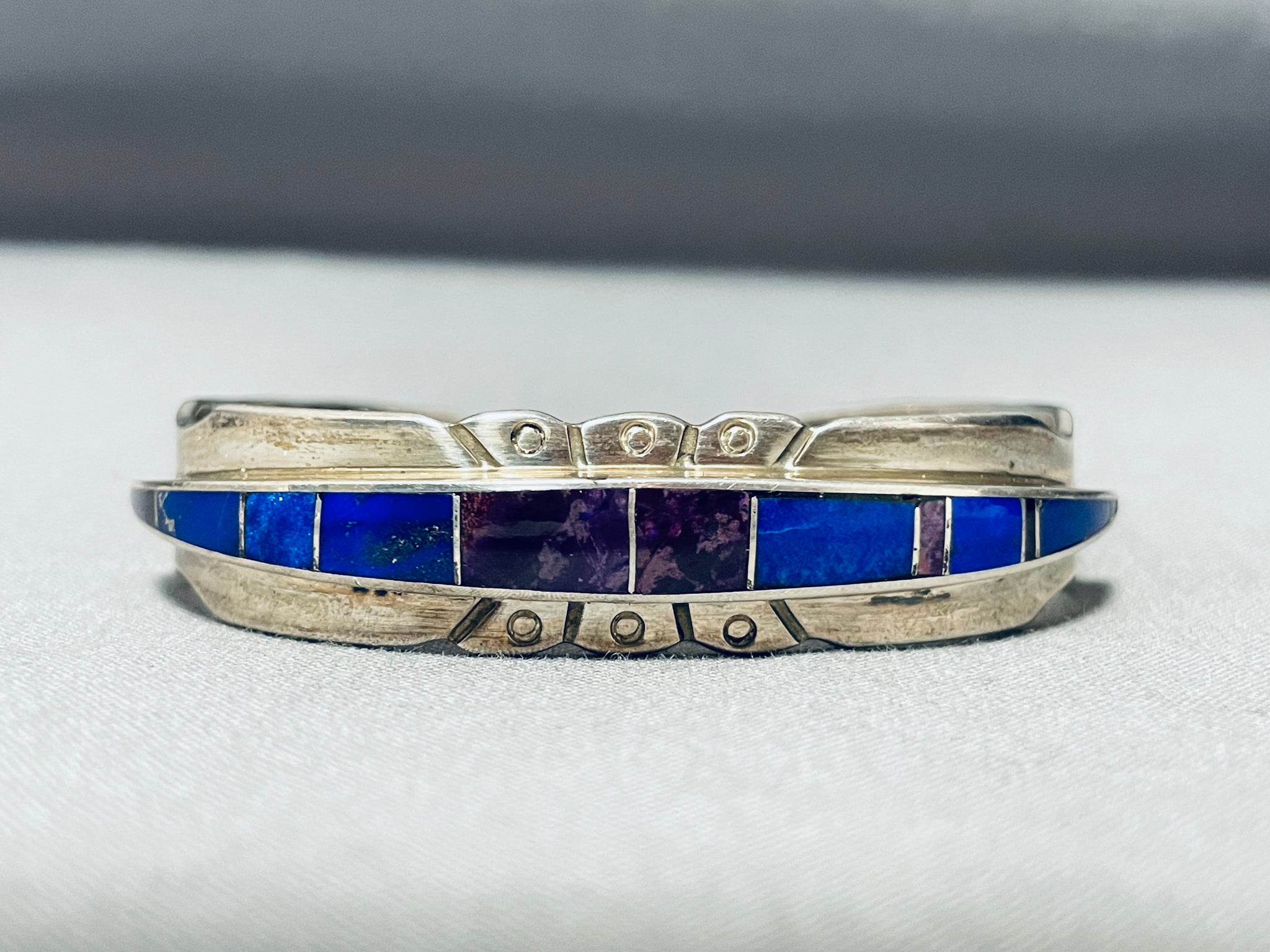 Signed Vintage Native American Navajo Lapis Sugulite Sterling Silver Inlay Bracelet