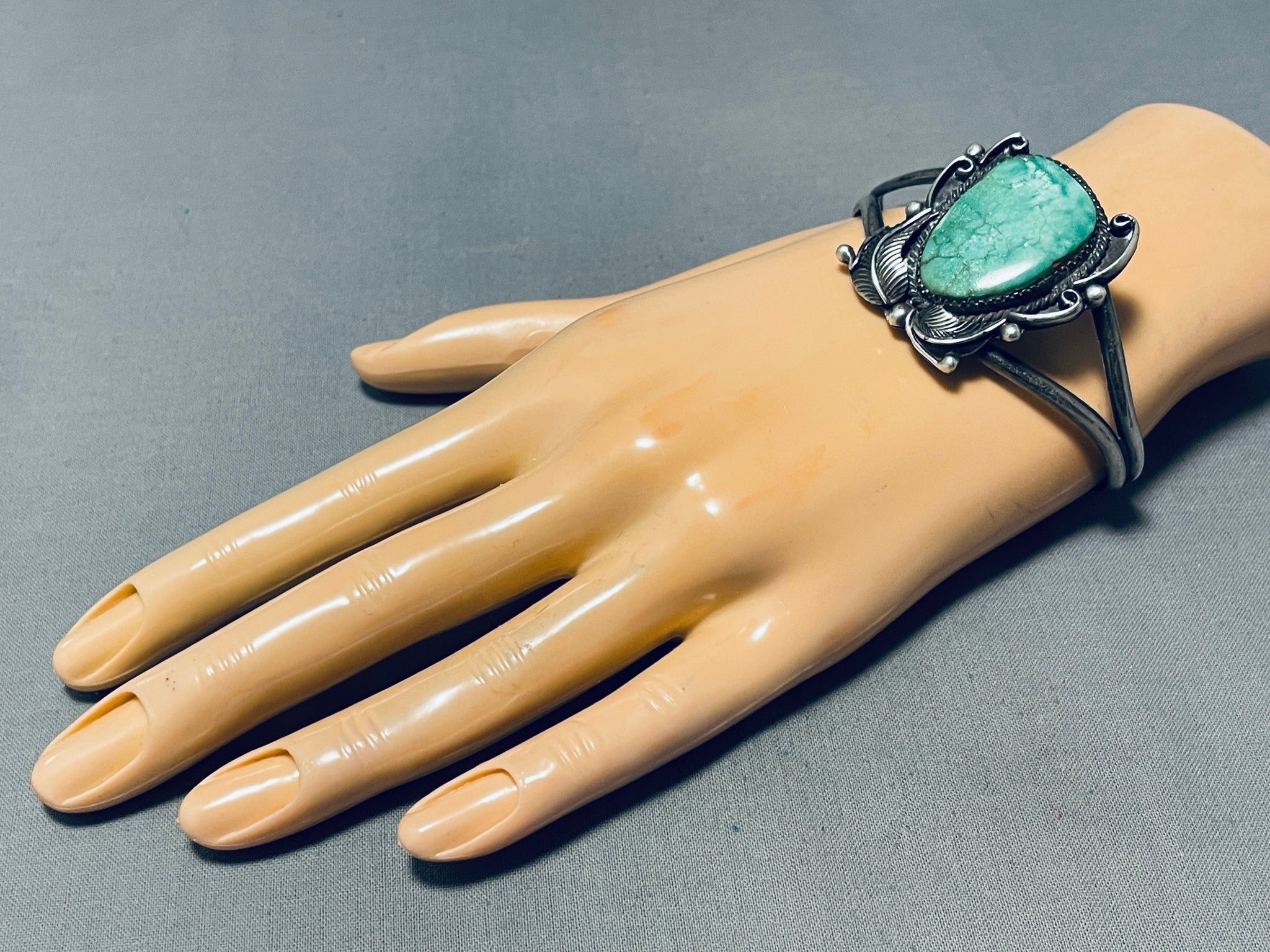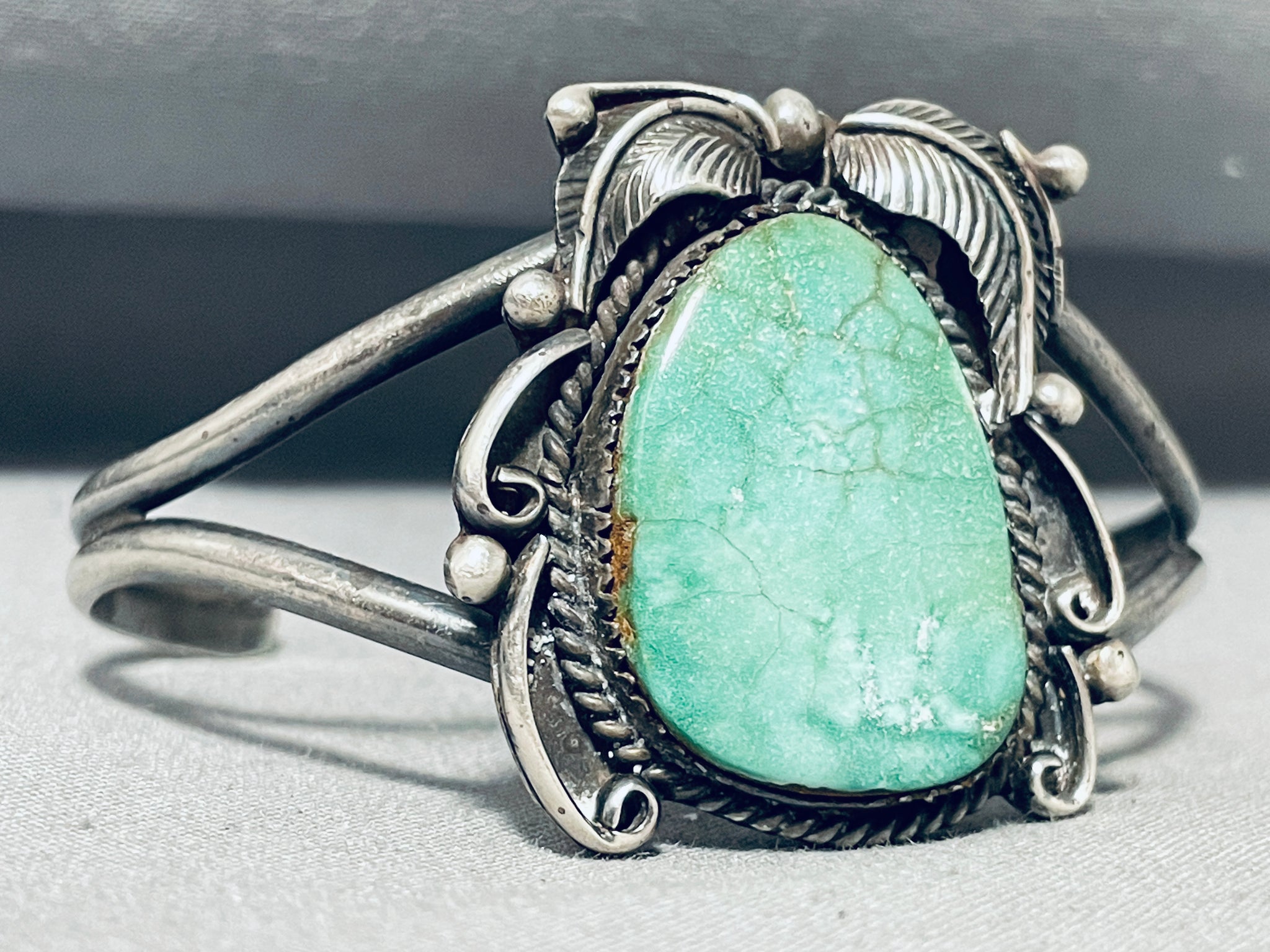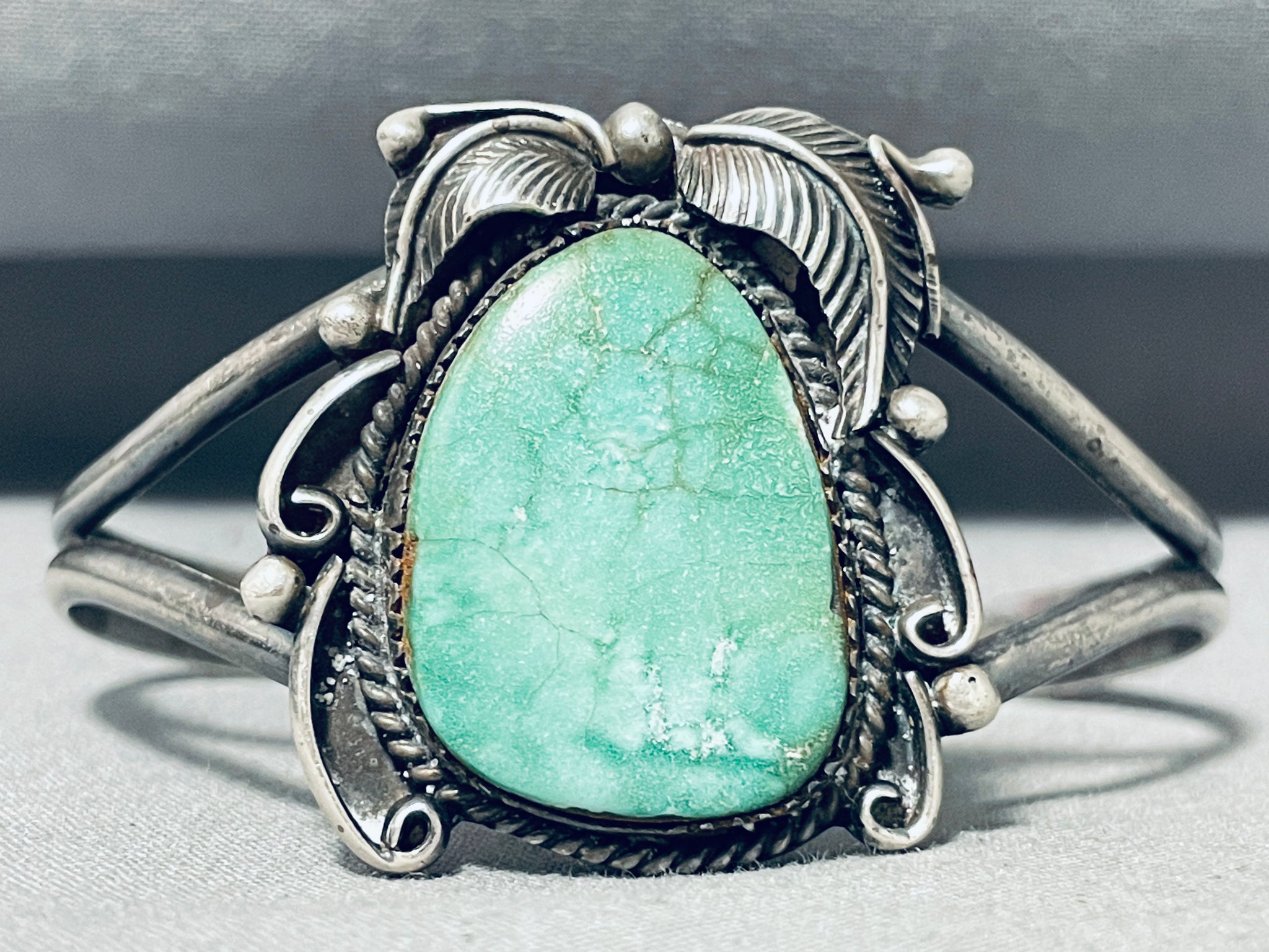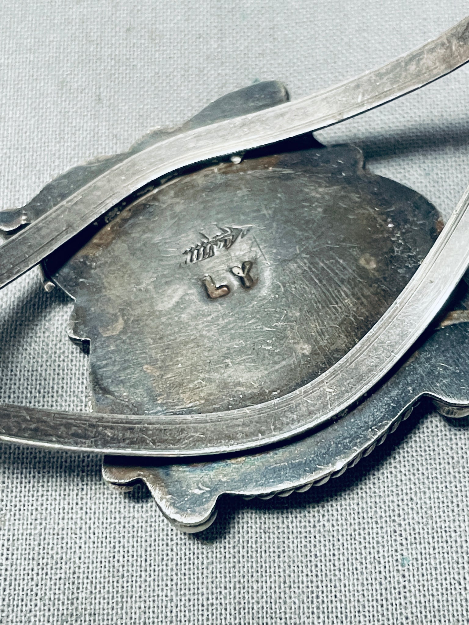 The Royston turquoise mine, located in the rugged hills of Esmeralda County, Nevada, is renowned for producing some of the most diverse and sought-after varieties of turquoise in the world. This historic mine has been in operation since the early 1900s and has garnered a reputation for its exceptional range of colors and distinctive matrix patterns. Royston turquoise can exhibit shades ranging from vibrant blues and greens to deeper, earthier tones, often interwoven with intricate brown or golden matrix, creating a visually captivating effect. Mined from a series of interconnected pits and tunnels, the Royston deposit is known for its relative hardness, making it highly suitable for intricate lapidary work. The mine's turquoise has been cherished by artisans and collectors for its versatility and unique aesthetic qualities. Today, Royston turquoise remains a cornerstone of American turquoise production, cherished for its enduring beauty and rich cultural heritage. The center stone measures around 1-1/8" x 3/4". The width of the bracelet measures around 1-3/8". Signed by Navajo artist, L.Y. Sterling silver. The inside end to end measures around 5-1/4" with an additional 1-5/8" gap. Sturdy 26 grams.