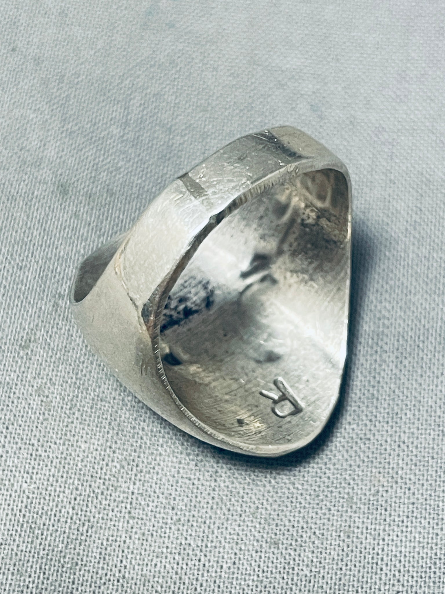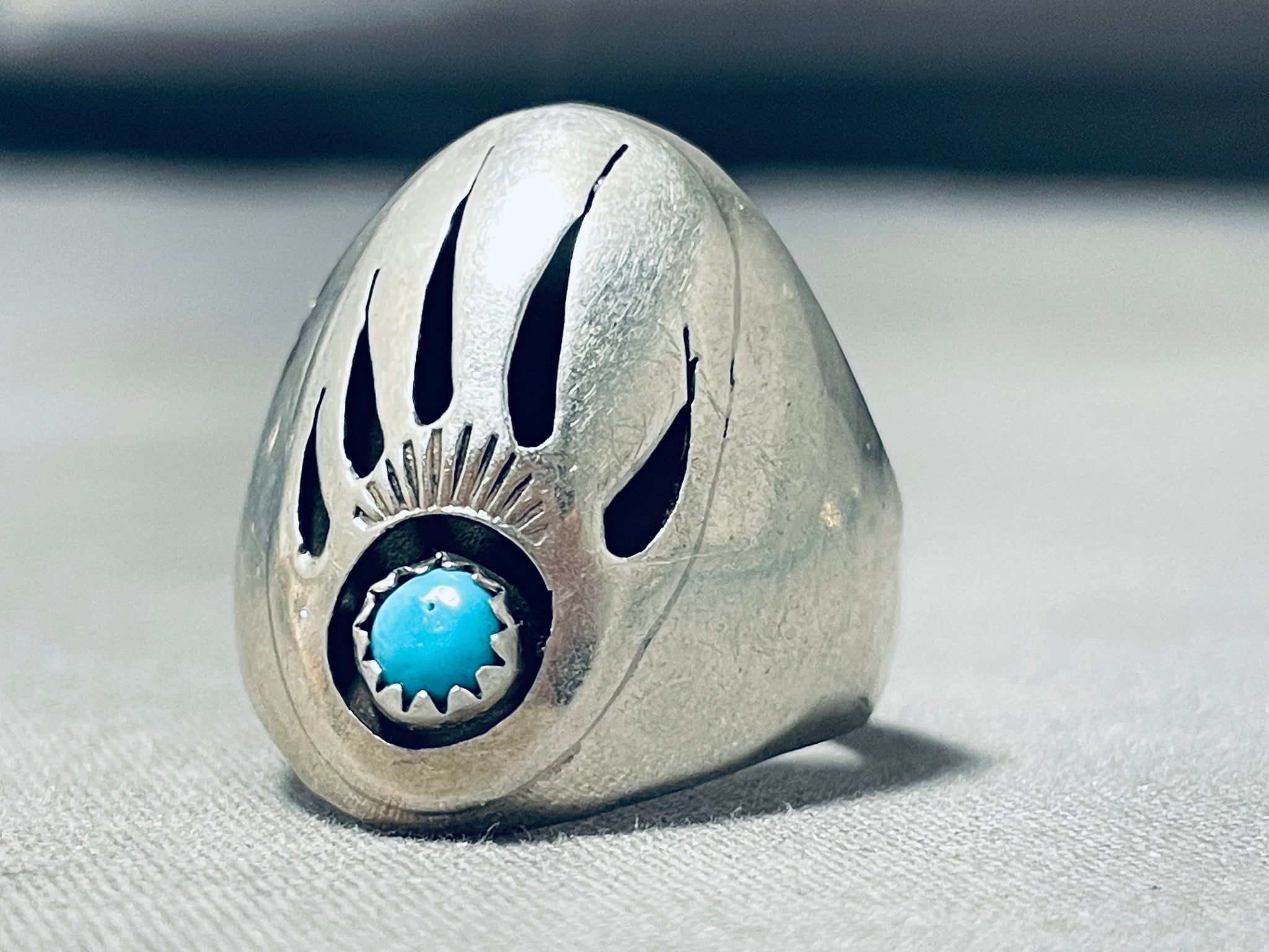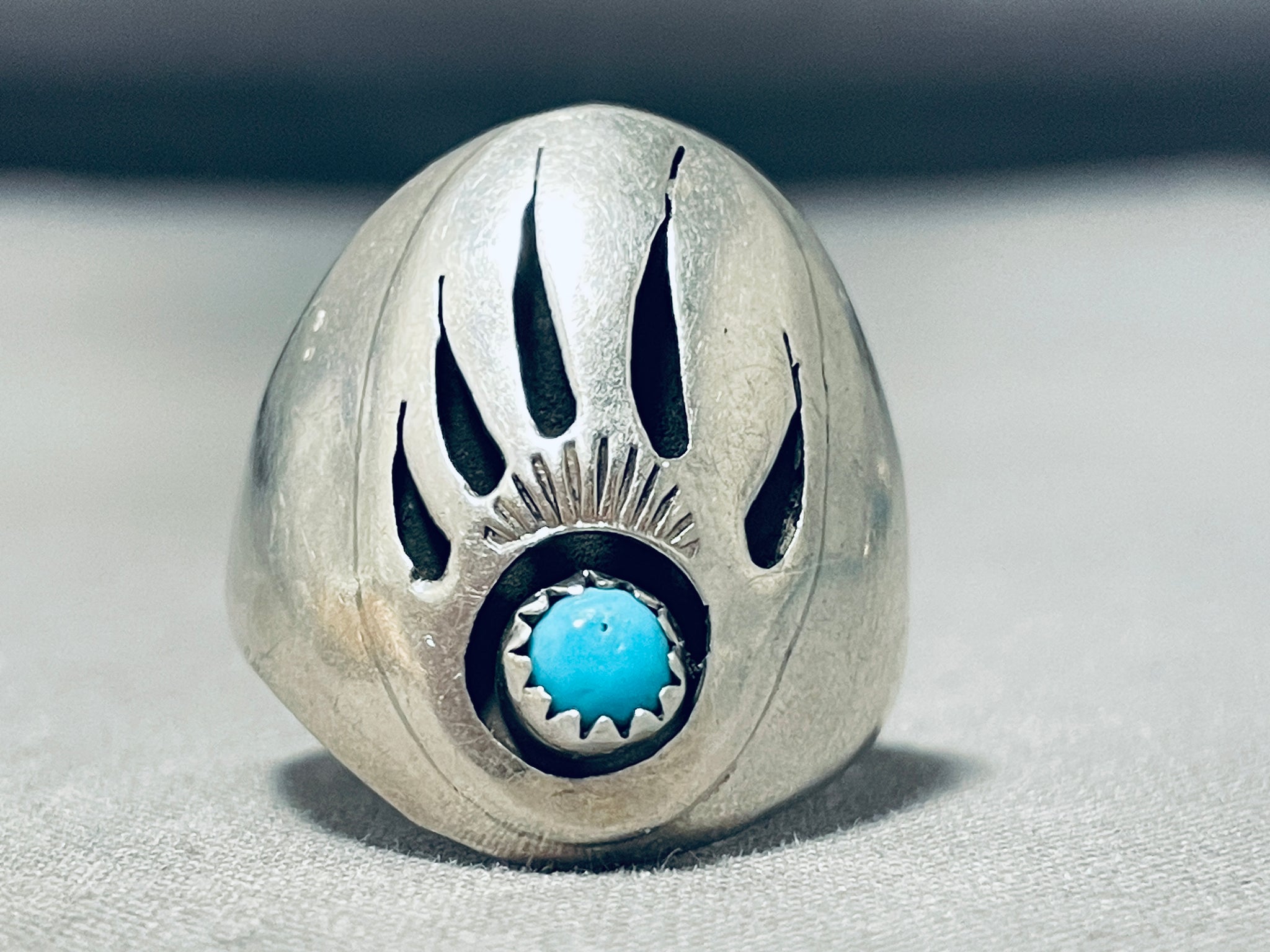 Signed Vintage Native American Navajo Sleeping Beauty Turquoise Sterling Silver Bear Track Ring