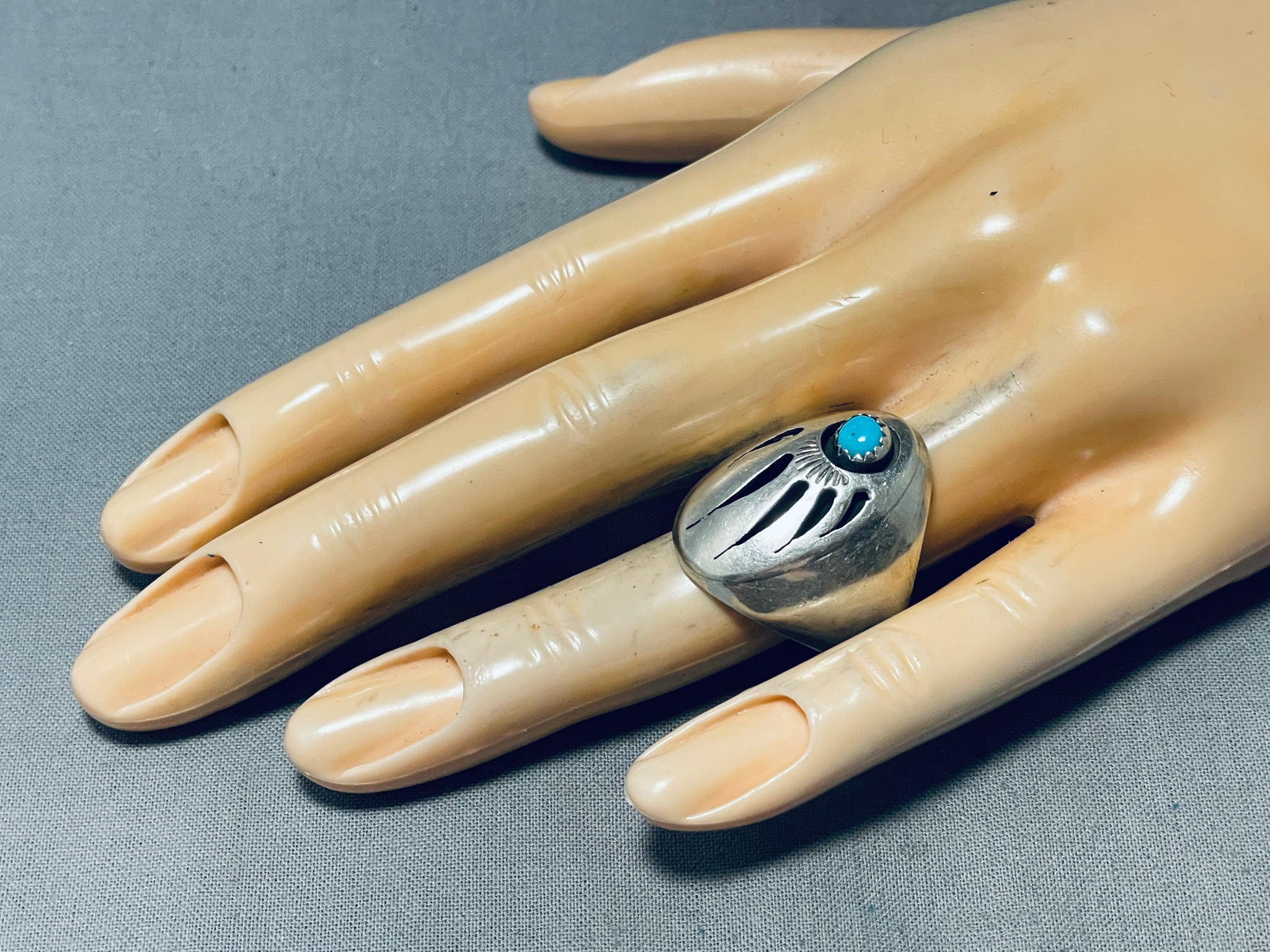 The ring features a hand carved silver overlay bear track with a Sleeping Beauty turquoise center, and a graduated solid silver band! The center stone measures around 3/16" x 3/16". The ring face measures around 1" x 5/8". Signed by Navajo artist, Richard Long. The ring size is around 10. Sterling silver, marked. Sturdy 14 grams.