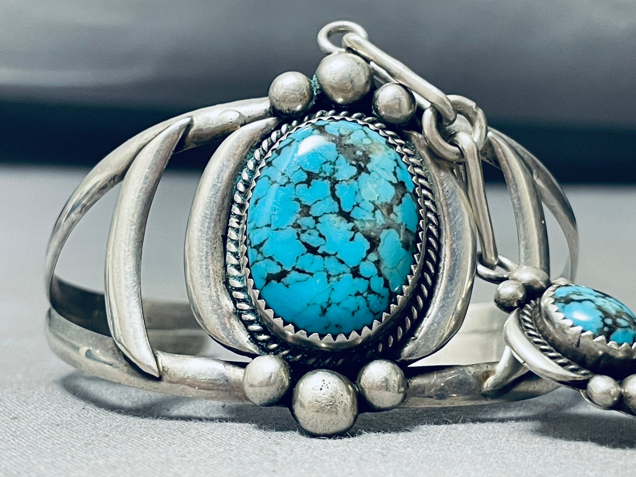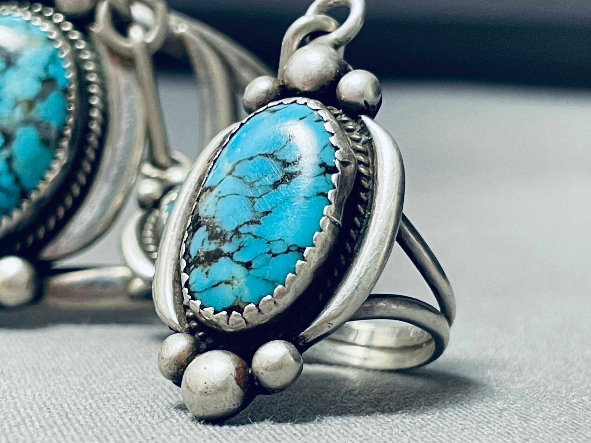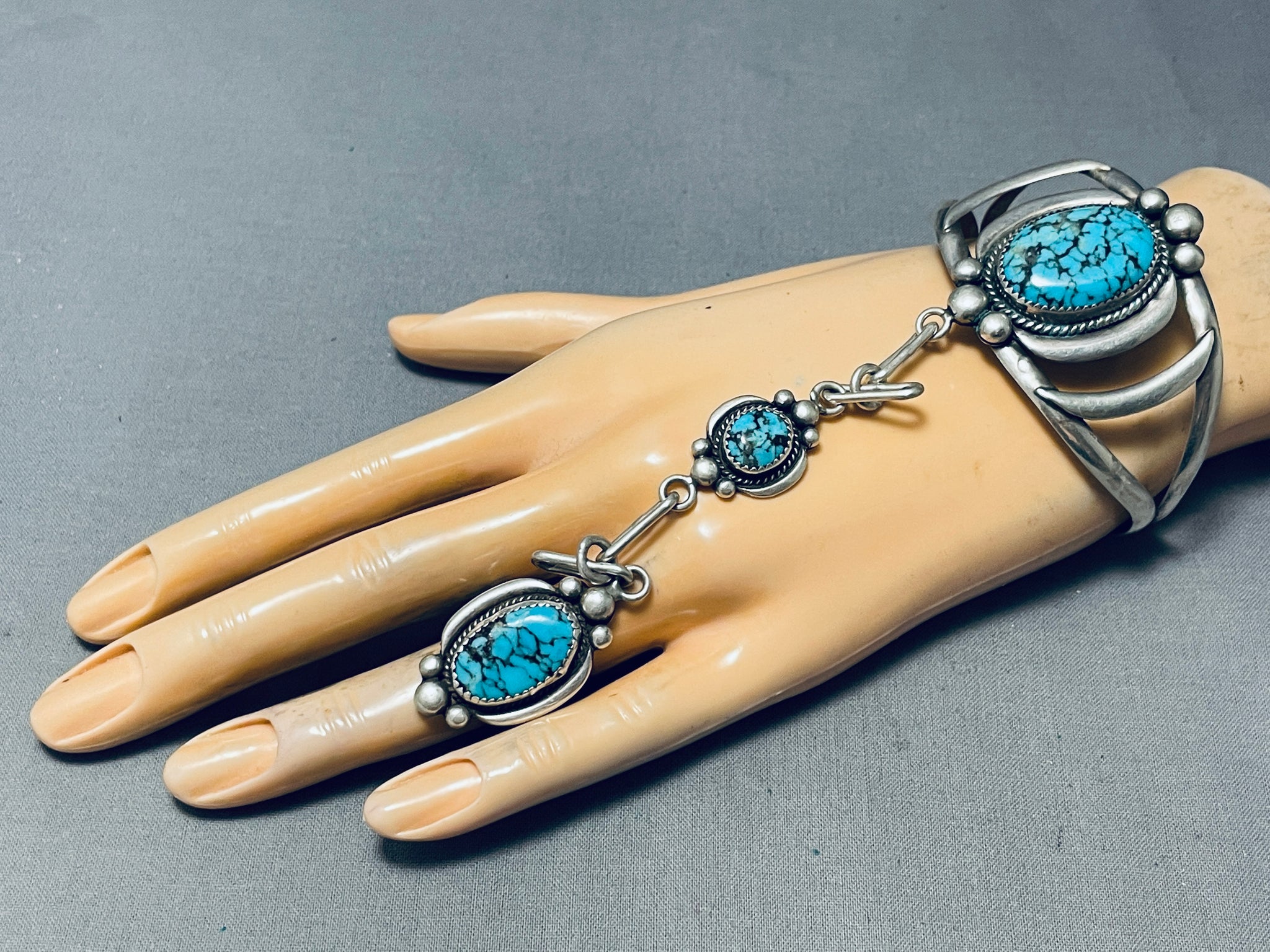 This is a superior vintage Navajo turquoise silver slave bracelet. This wonderful bracelet contains a marvelous bracelet, accenting turquoise silver section and a beautiful turquoise silver ring. Such a remarkable bracelet. Surrounding the stones are amazing silver raindrops with accenting ropes and stems. The double silver shank bracelet measures to be a size 6-3/4" and the ring measures to be a size 7.5. The largest stone measures around 1" x 5/8". The width of the bracelet measures around 1-3/4". Signed by Navajo artist, HJ. Sterling silver, marked. Cir. 1970's+. Sturdy 41 grams.