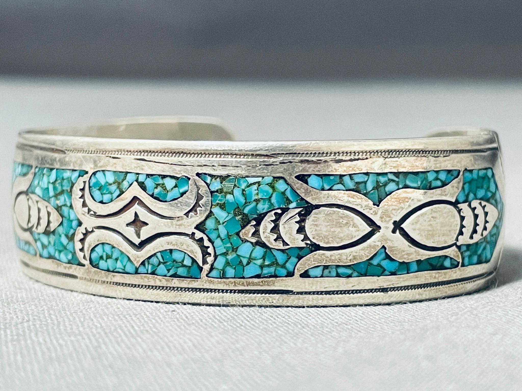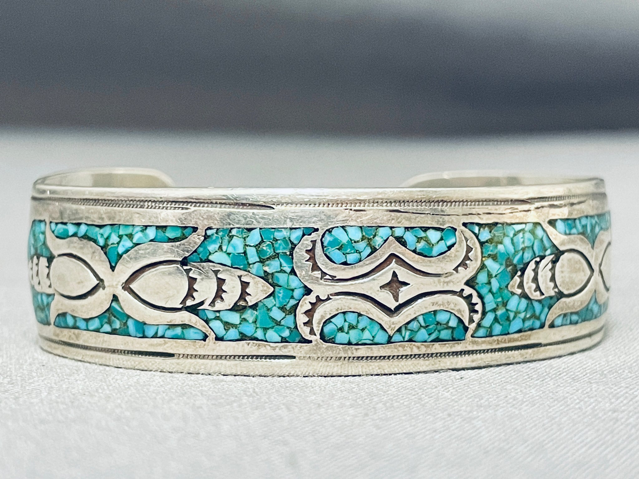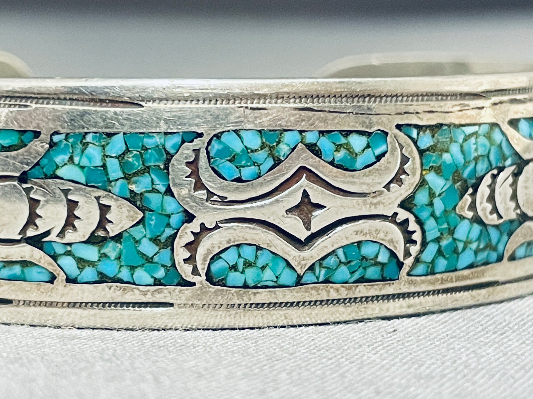 Signed Vintage Native American Navajo Turquoise Chip Inlay Sterling Silver Bracelet