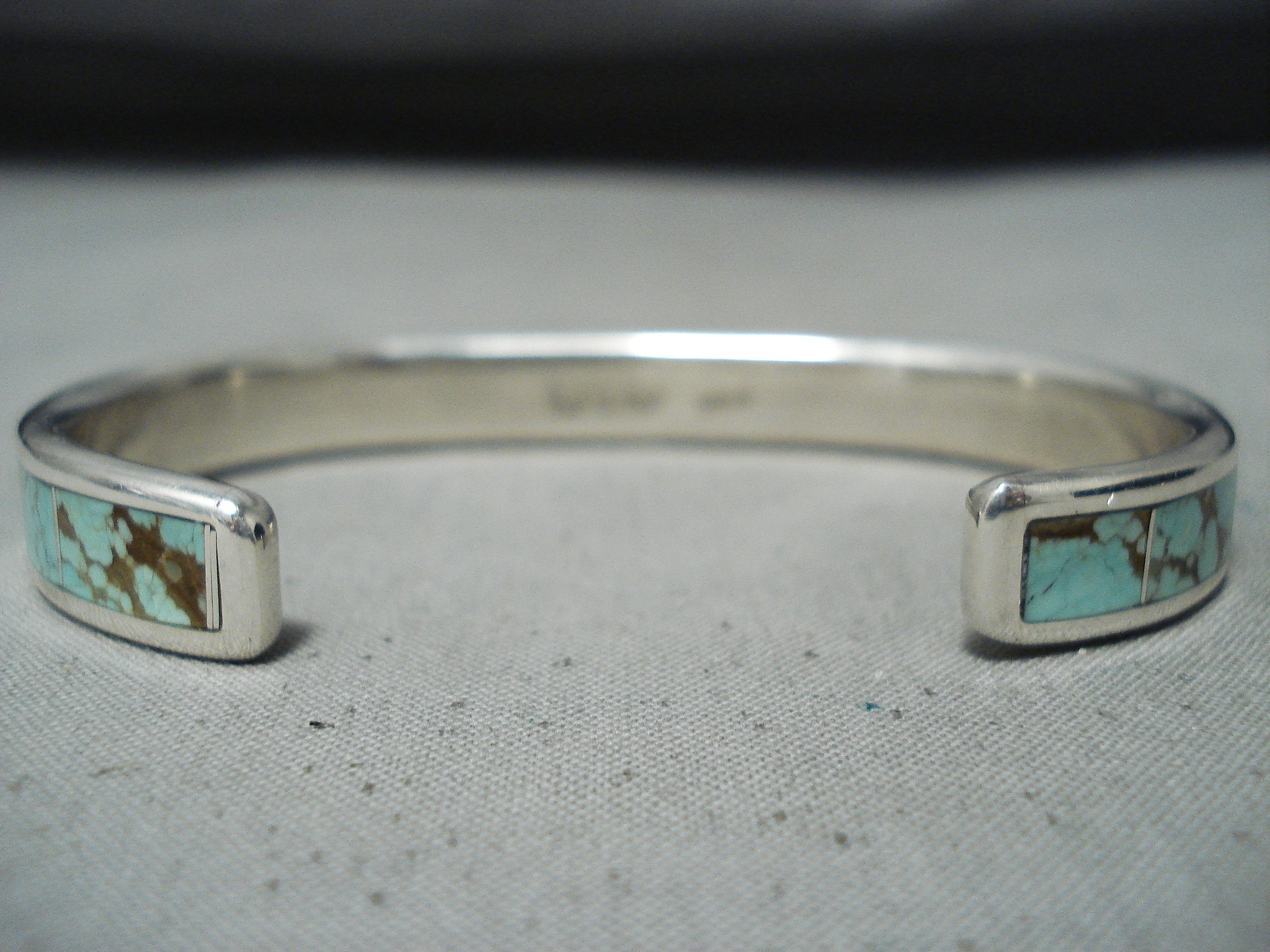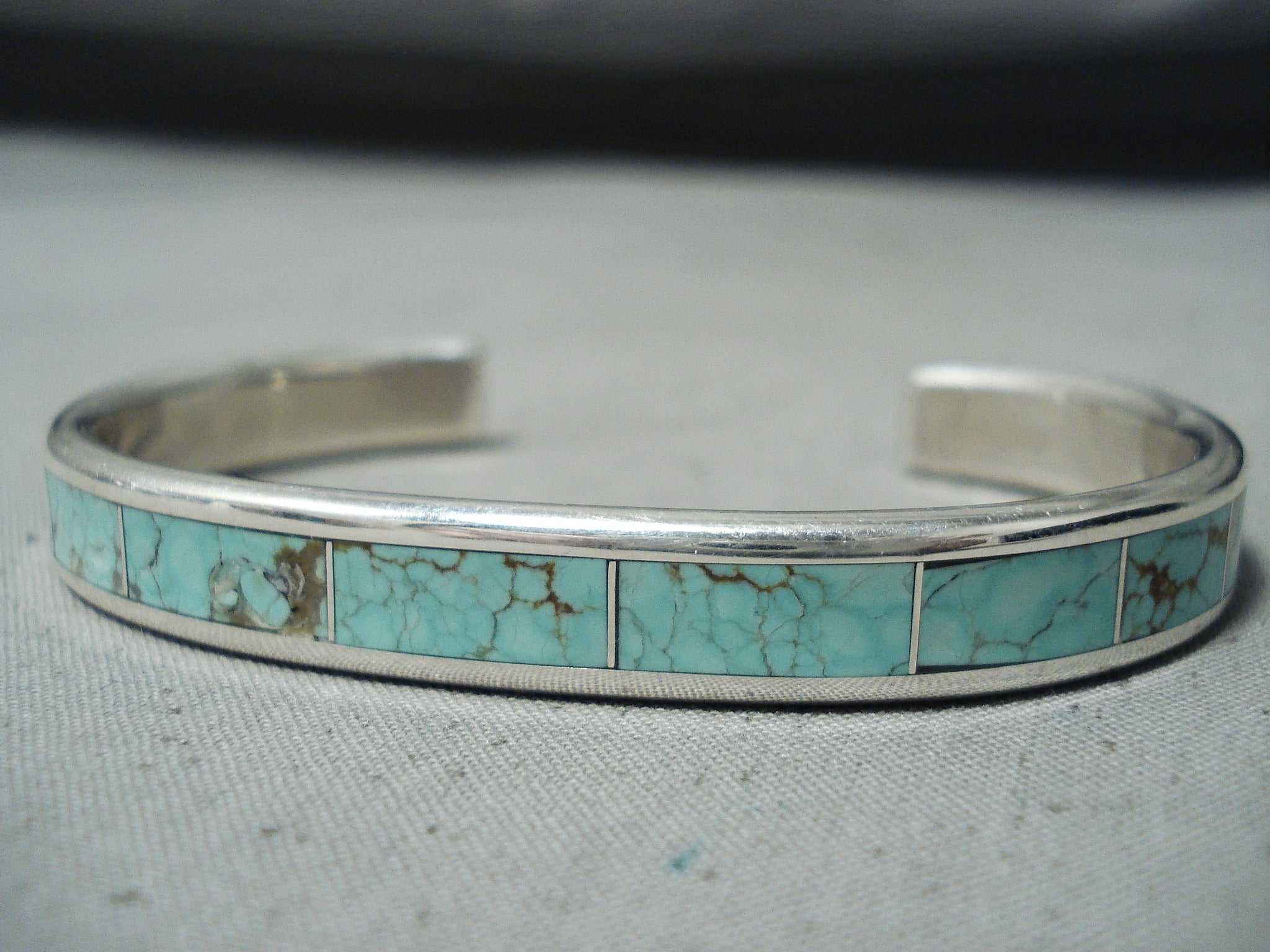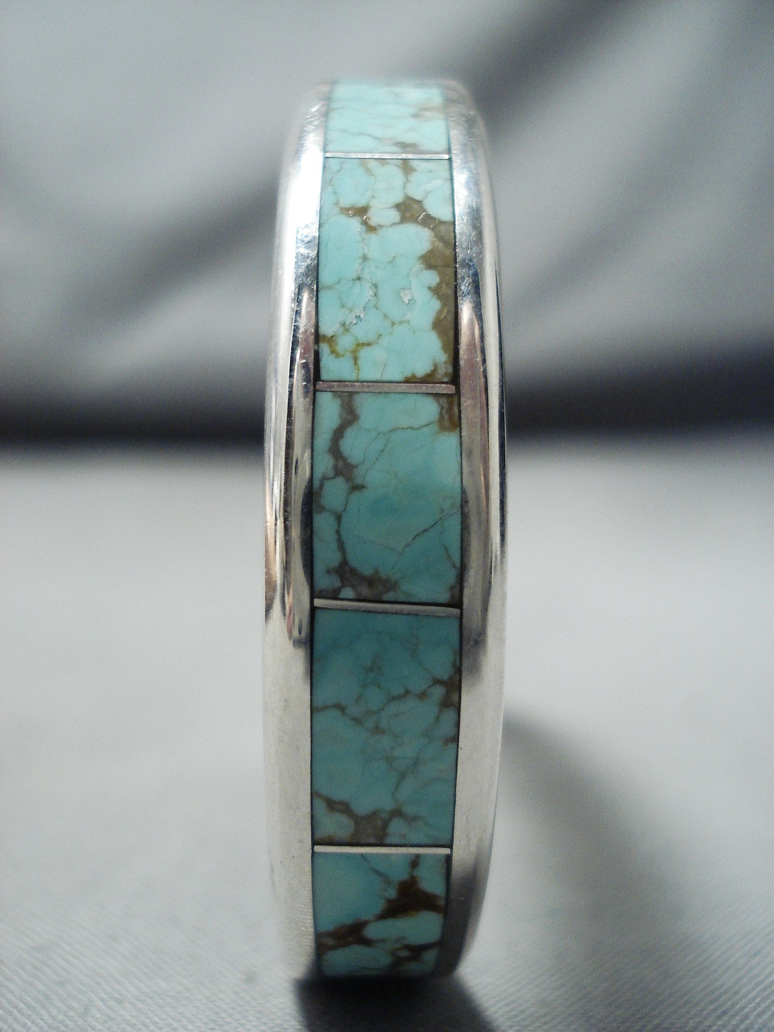 Signed Zuni Native American 8 Turquoise Inlay Sterling Silver Bracelet