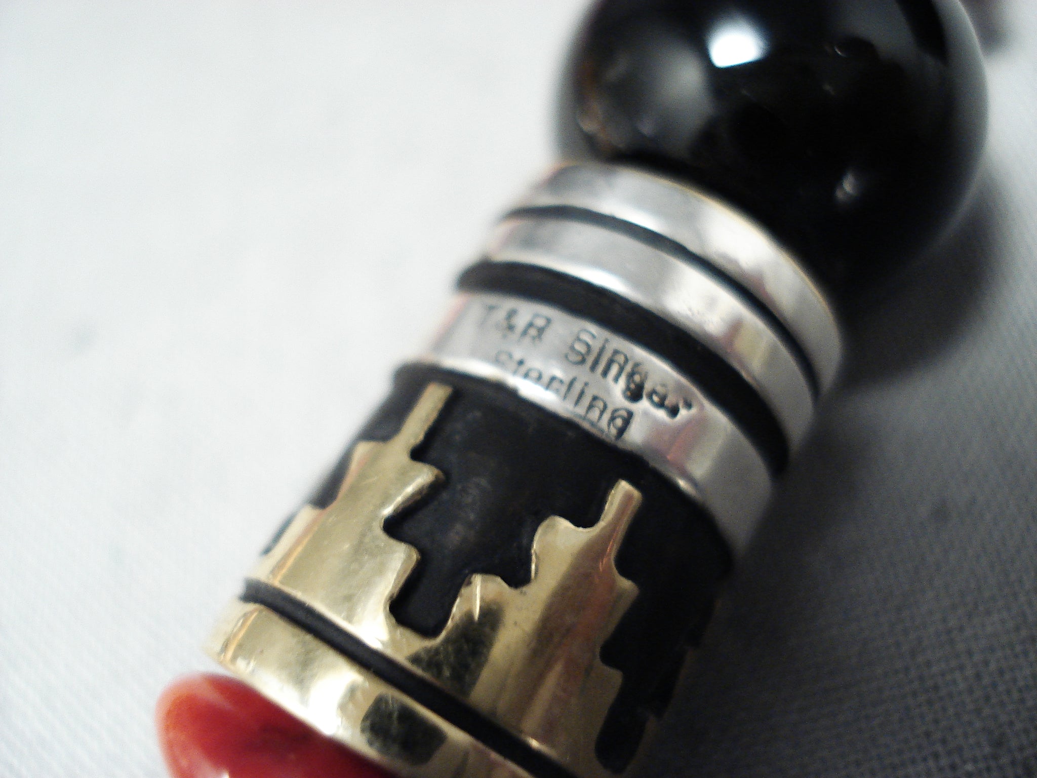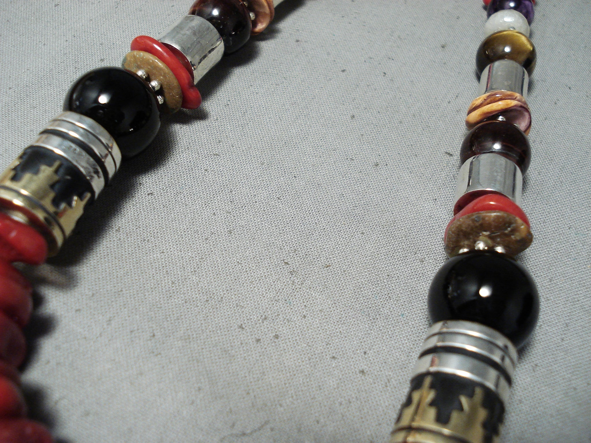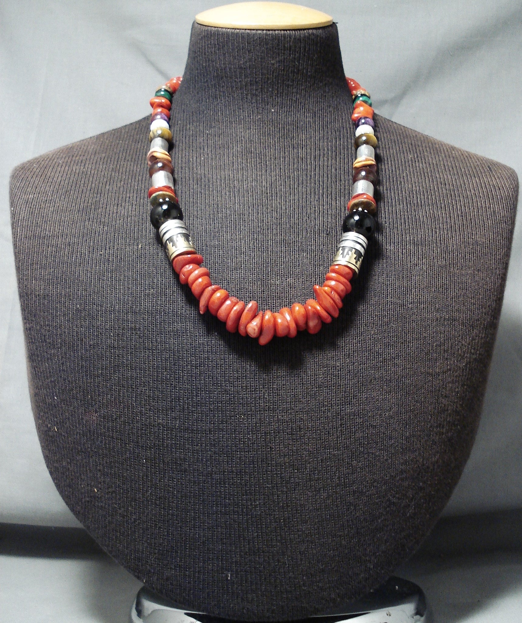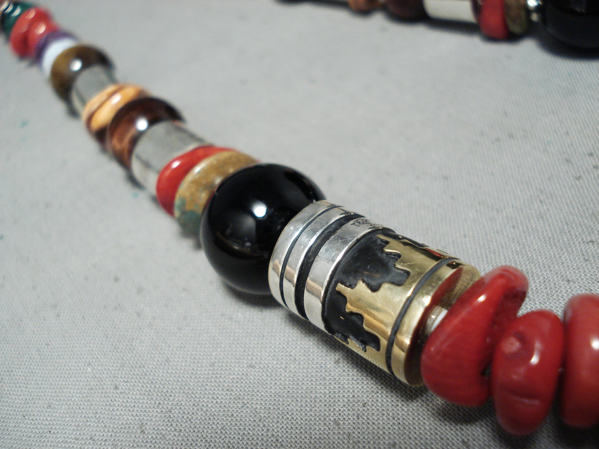 Up for sale is this tremendous Navajo silver necklace. This is such a vibrant, colorful necklace! The dominant stones are the gorgeous coral stones - but they are enhanced by stones that include tigers eye, amethyst, malachite and more that include the impressive silver beads - like the 2-tone ones with rug designs that are ¾" x ½"! Splendid! Sterling silver, marked. Signed by Navajo artist, Rose Singer. The length of the necklace measures around 21". Sturdy 104 grams.