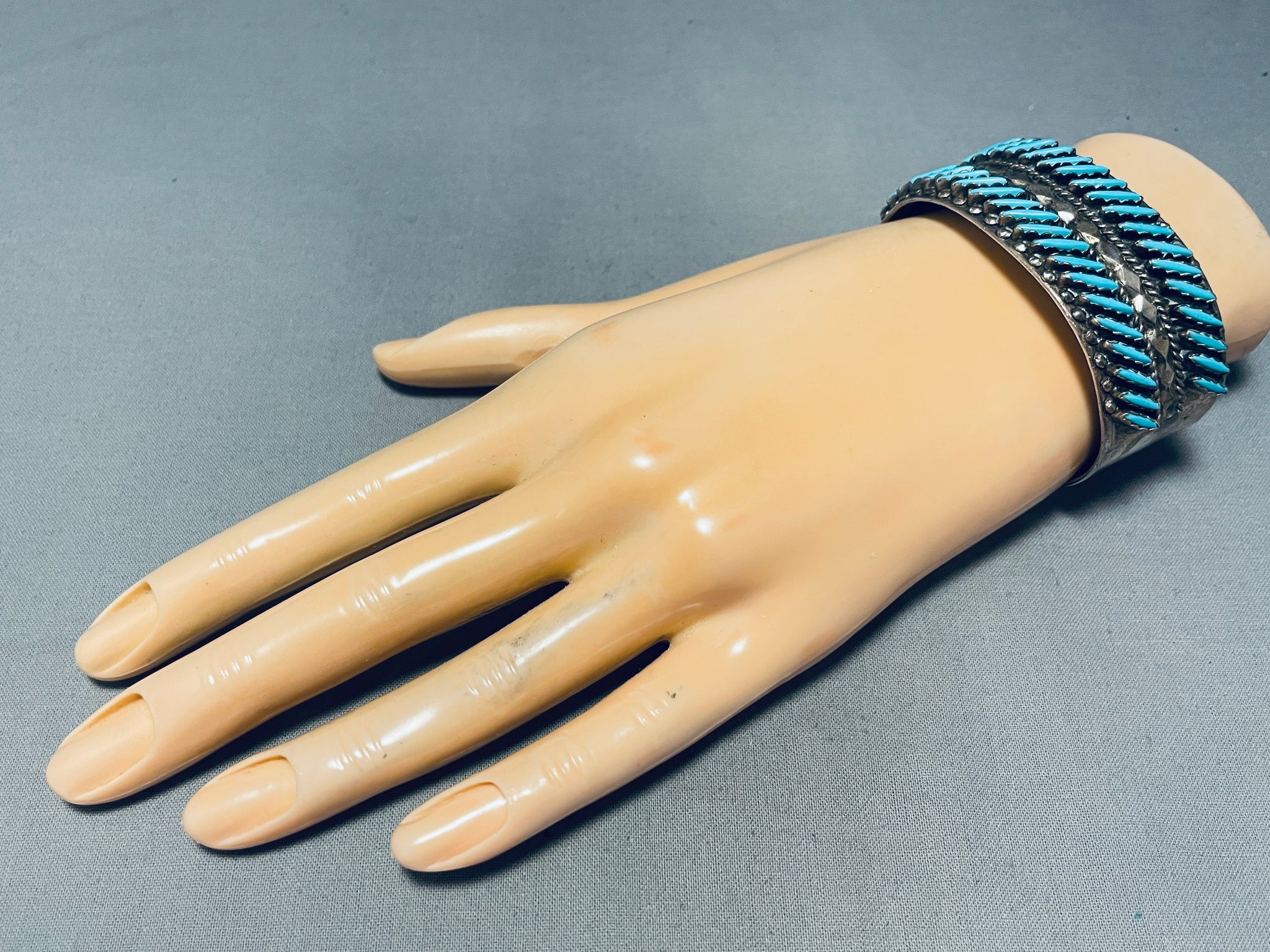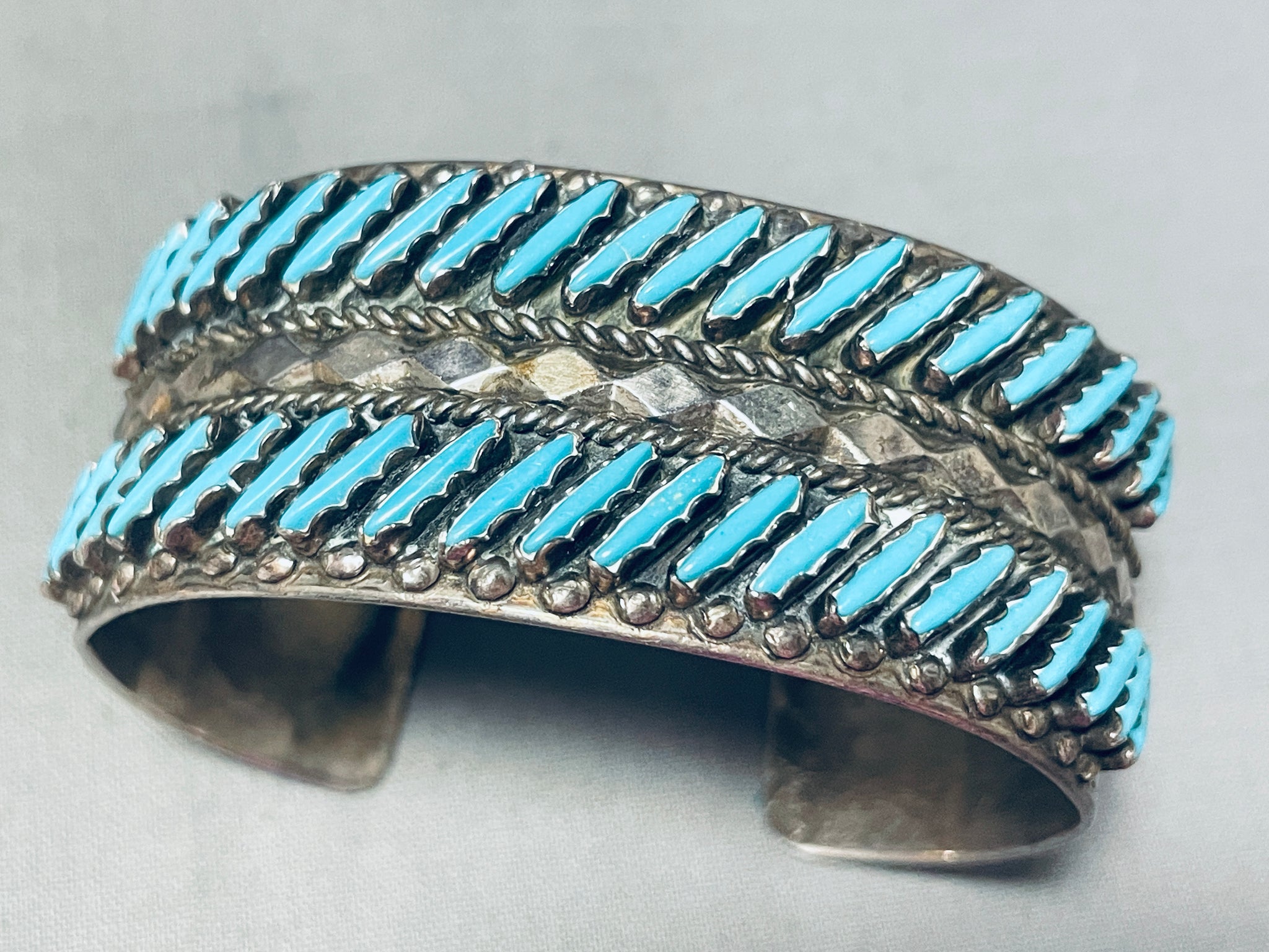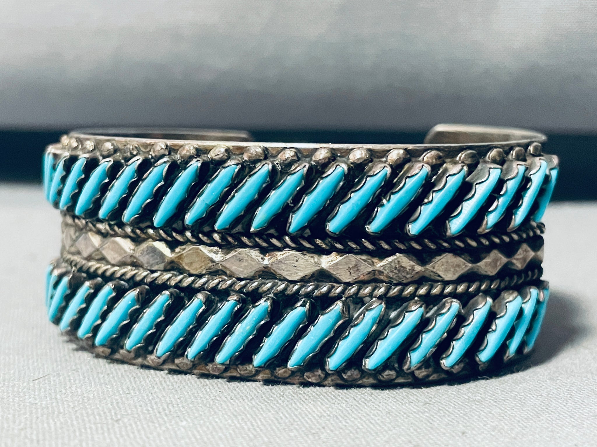 Slanted Turquoise!! Vintage Native American Zuni Sterling Silver Row Bracelet Cuff