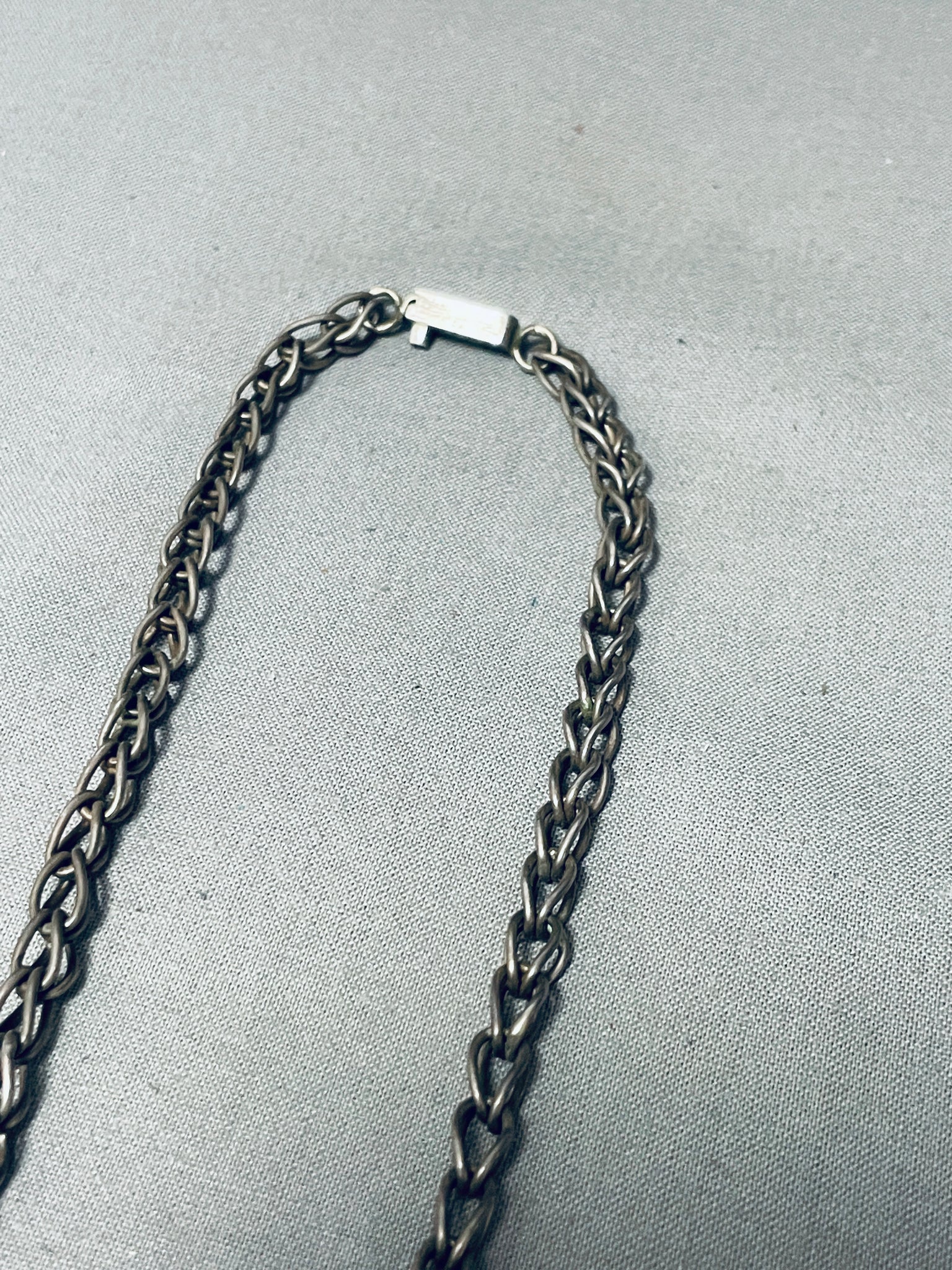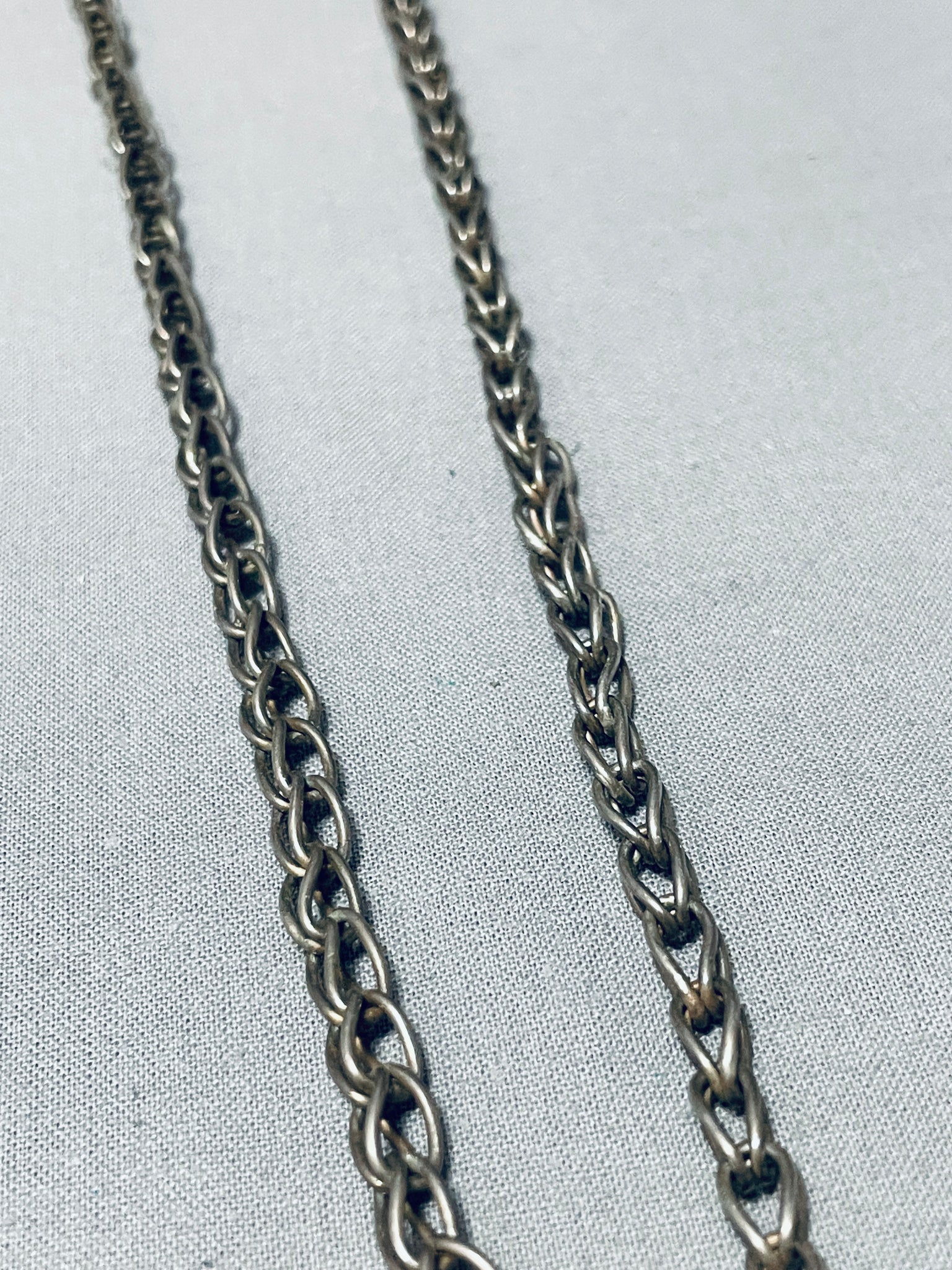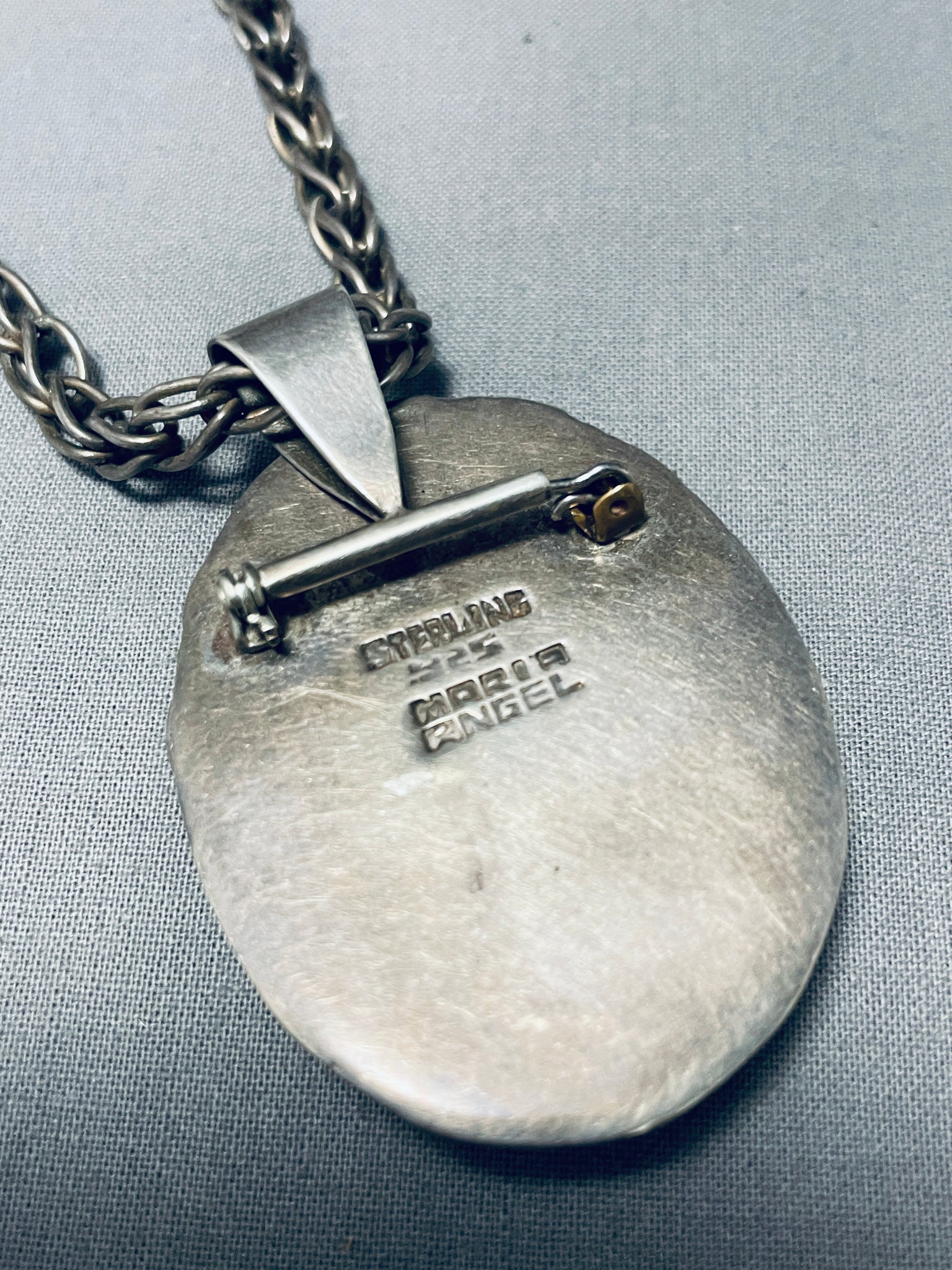 This is a striking vintage single stone pendant silver necklace. This necklace is amazing as the pendant is thick and sturdy consisting of a center Blue Gem turquoise stone with surrounding silver circular patterns. The pendant measures around 2-1/8" X 1-1/2". The chain on this necklace is absolutely unique and contains an interwoven silver link chain with a unique clasp. I love the detailing on this necklace. The center stone measures around 1" X 5/8". What is extra unique about this necklace is that the pendant can be removed and worn as a pin if desired. Sterling silver. Cir. 1960's+. Signed by artist, Maria Angel . The length of the necklace measures around 29". Sturdy 58 grams.