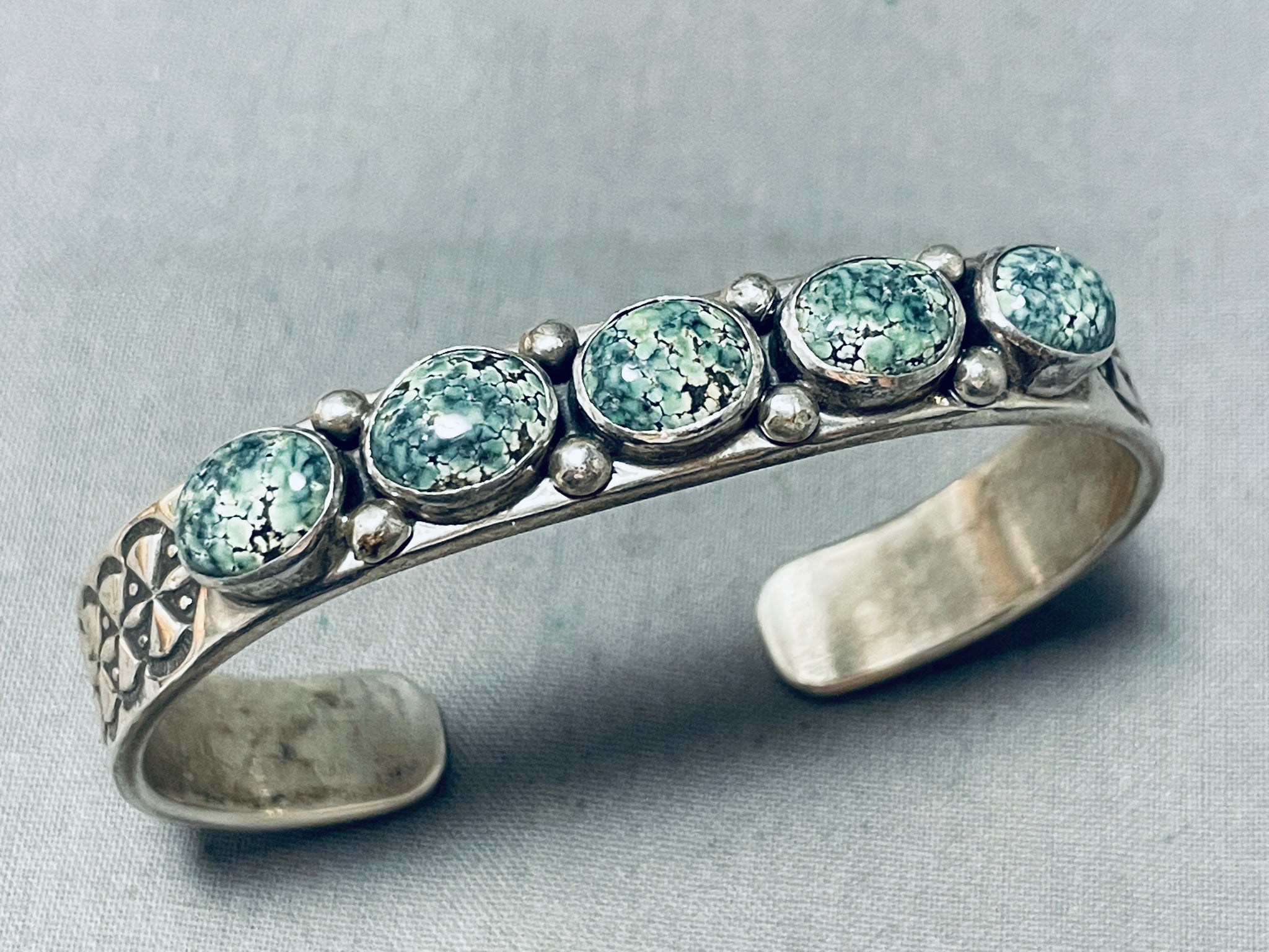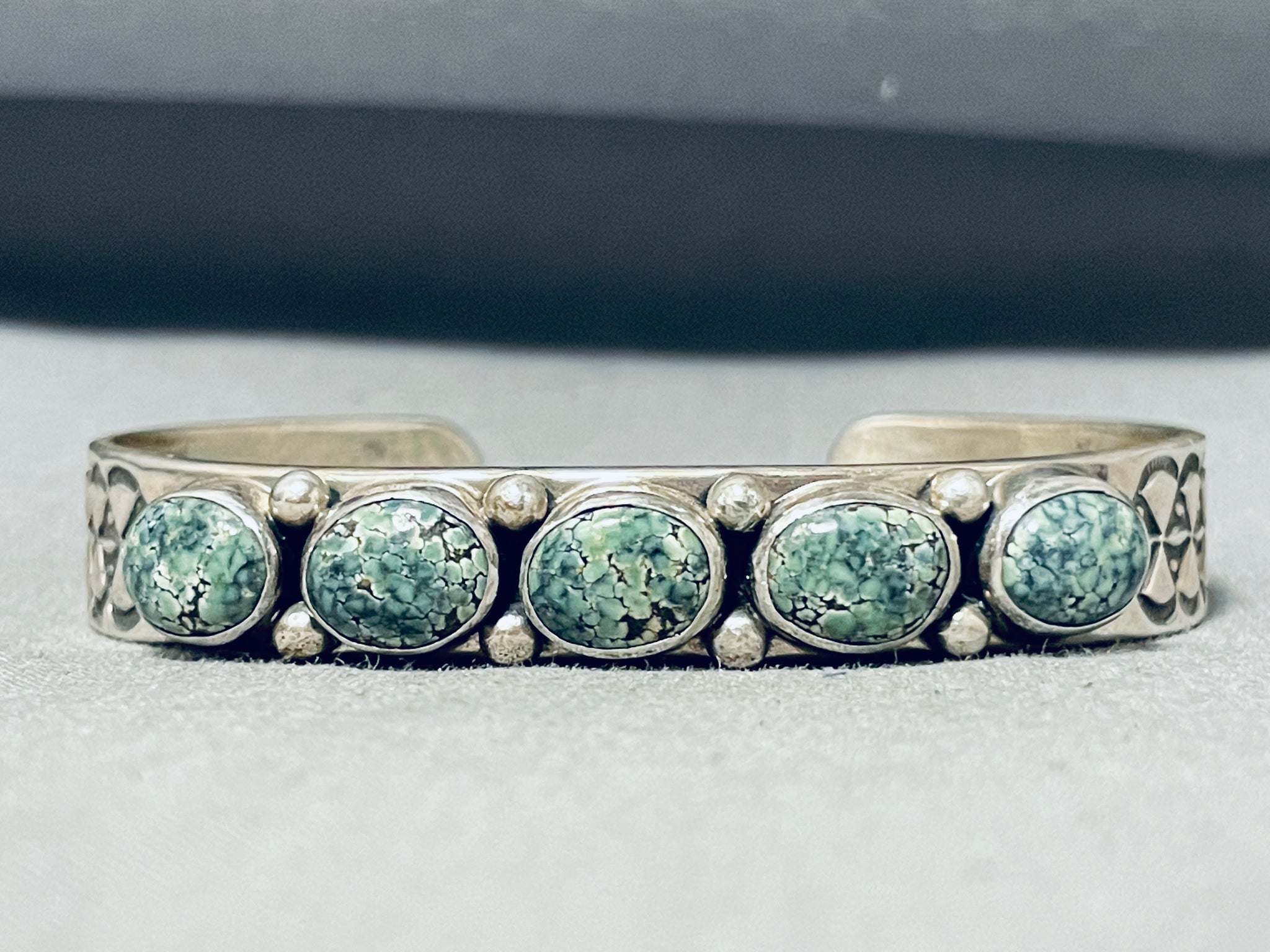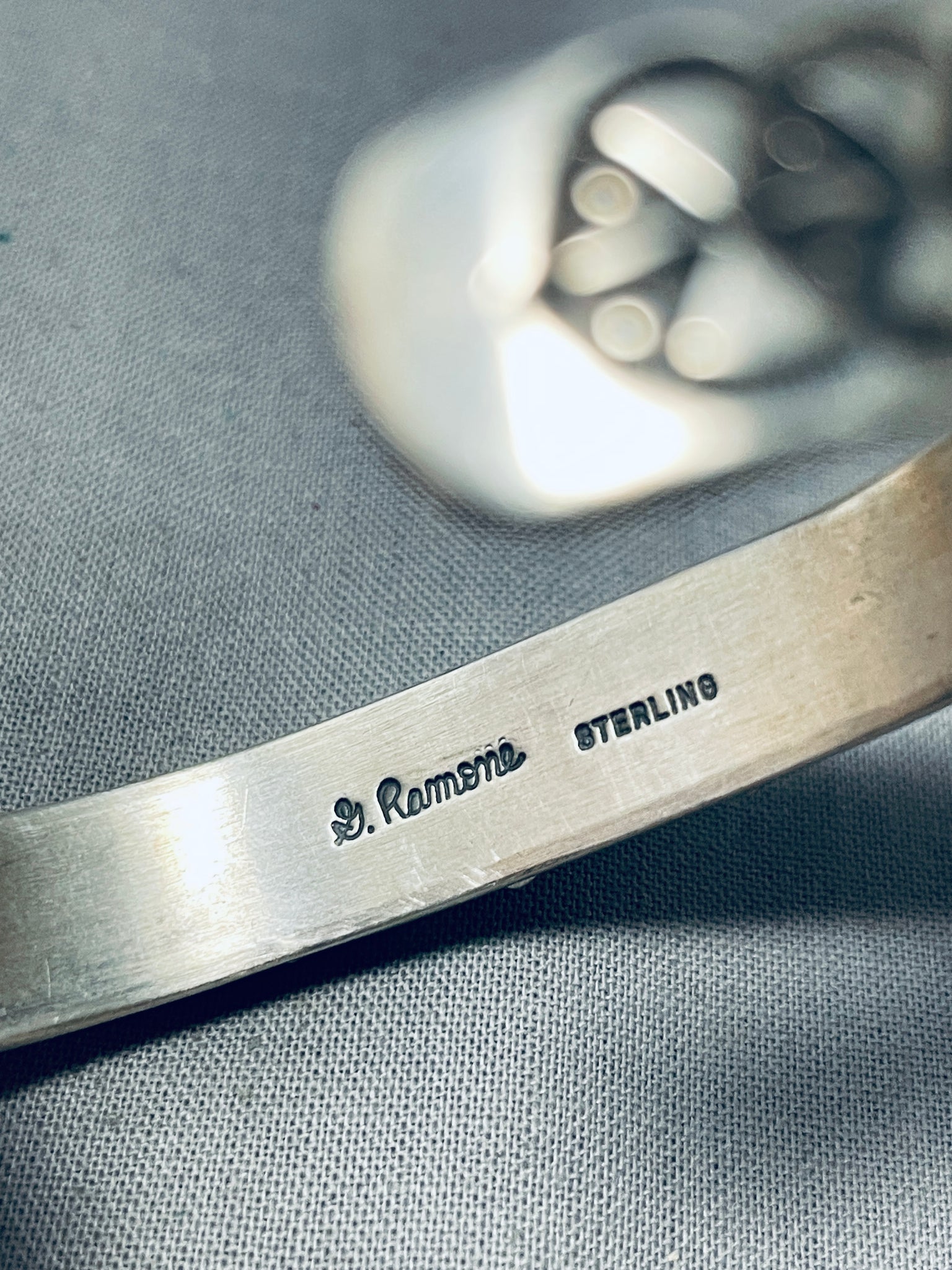 We are excited to auction off this gorgeous San Felipe bracelet! It features 5 green turquoise stones, hand carved silver beads, and a solid silver cuff! Impressive Artistry! The center stone measures around 3/8" x 1/4". The width of the bracelet measures around 3/8". Signed by San Felipe artist, G. Ramone. Sterling silver, marked. The inside end to end measures around 5-1/2" with an additional 7/8" gap. Sturdy 33 grams.