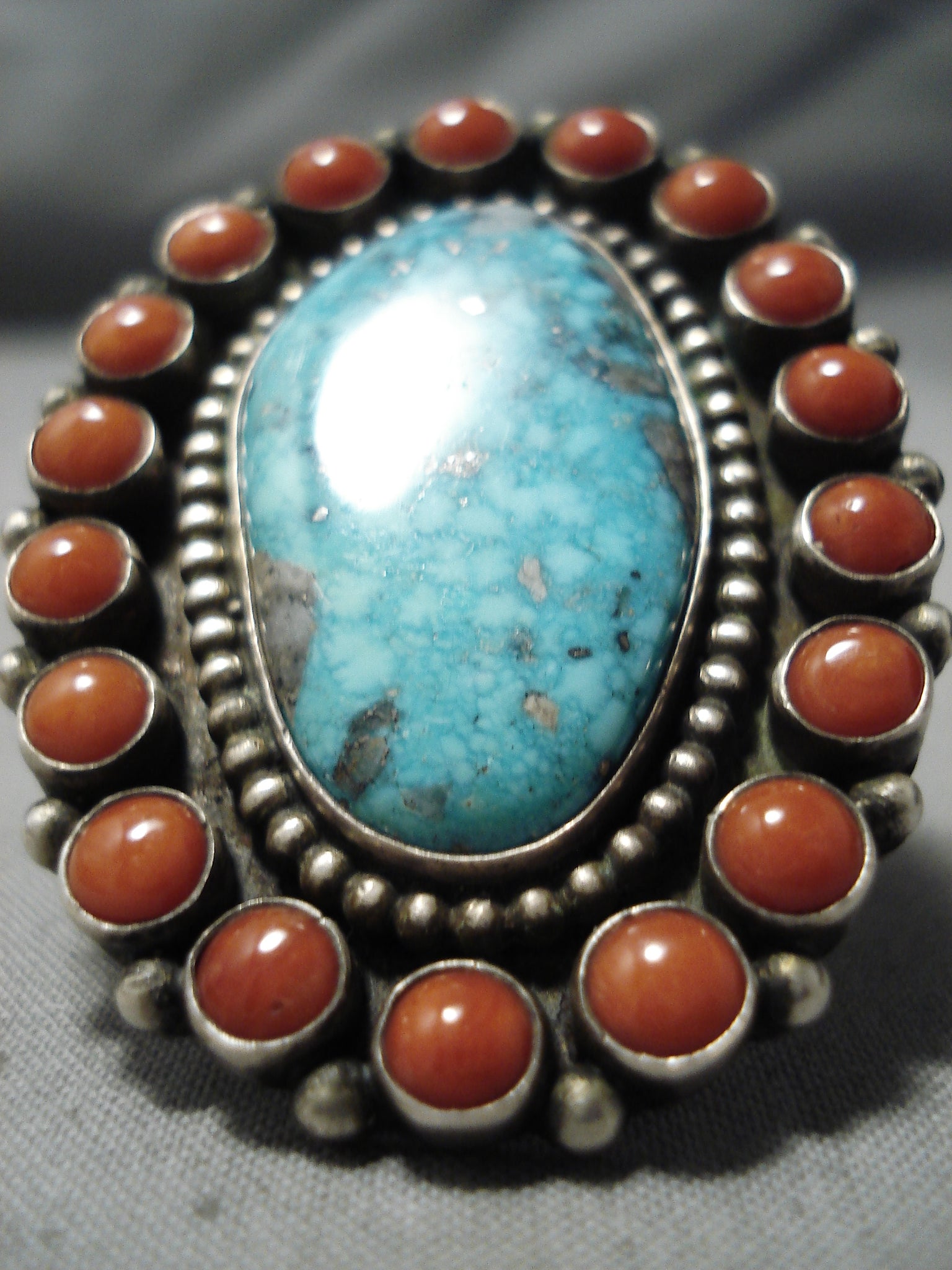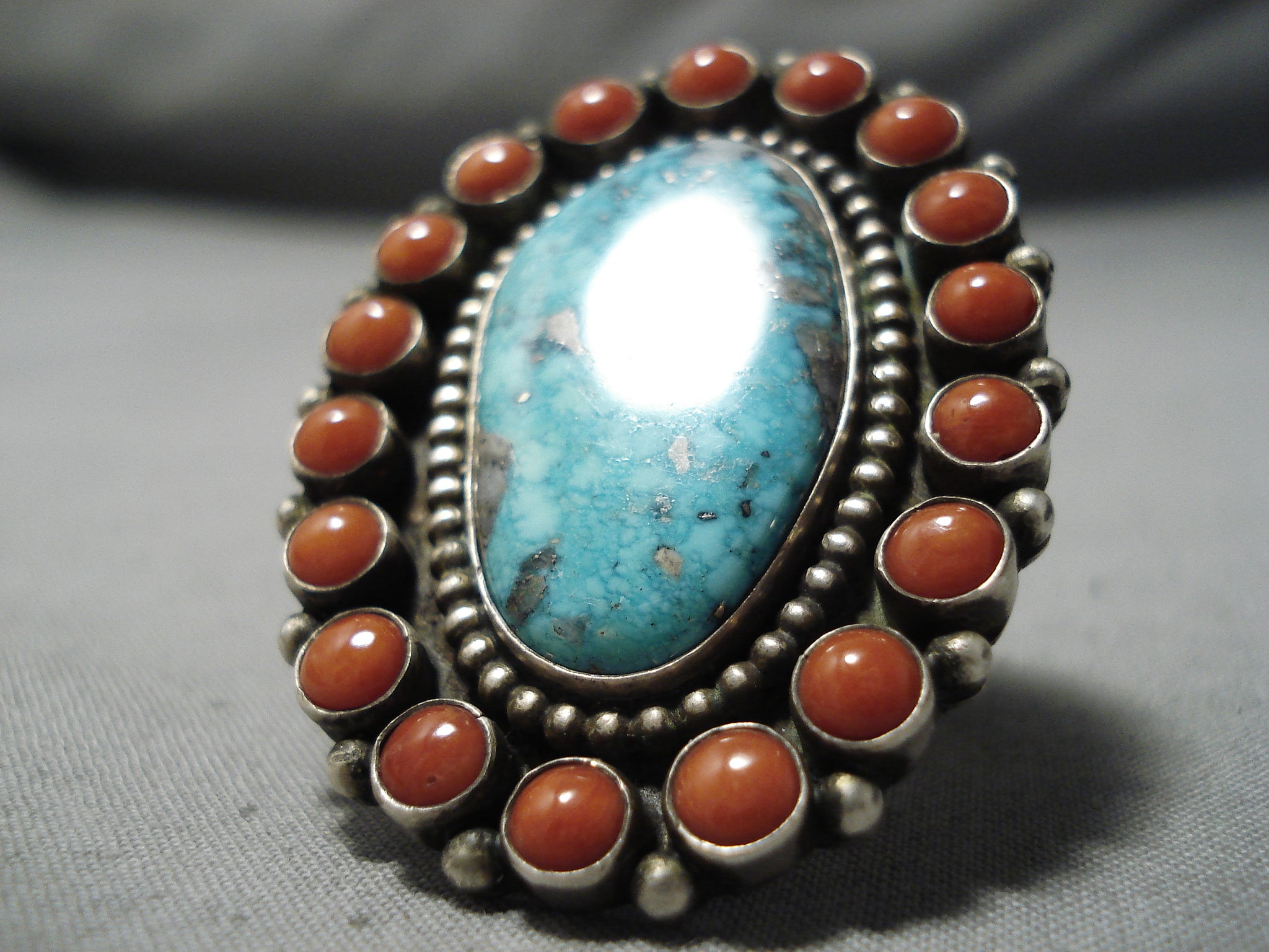 This is an astounding vintage Navajo silver ring. The huge, mesmerizing Kingman turquoise stone sets at the heart of this large incredible ring – surrounded with silver beads and the colorful circle of 3/16” round vibrant corals! Such a dynamic ring! The center stone measures around 1-1/4" x 3/4". The ring face measures around 2" x 1-1/2". Signed by Navajo artist, Terry Martinez. The ring size is around 9-1/2. Sterling silver, marked. Sturdy 32 grams.