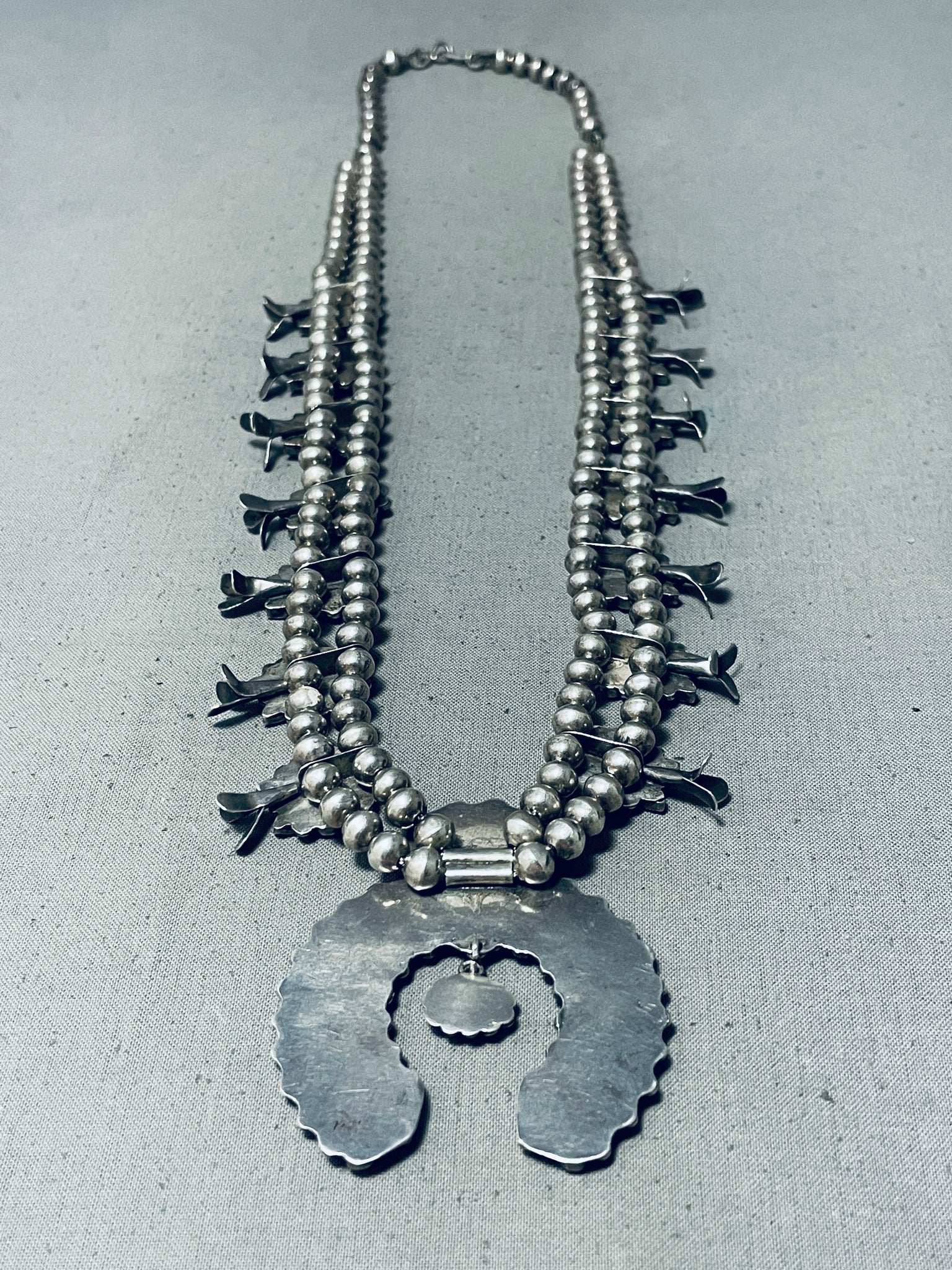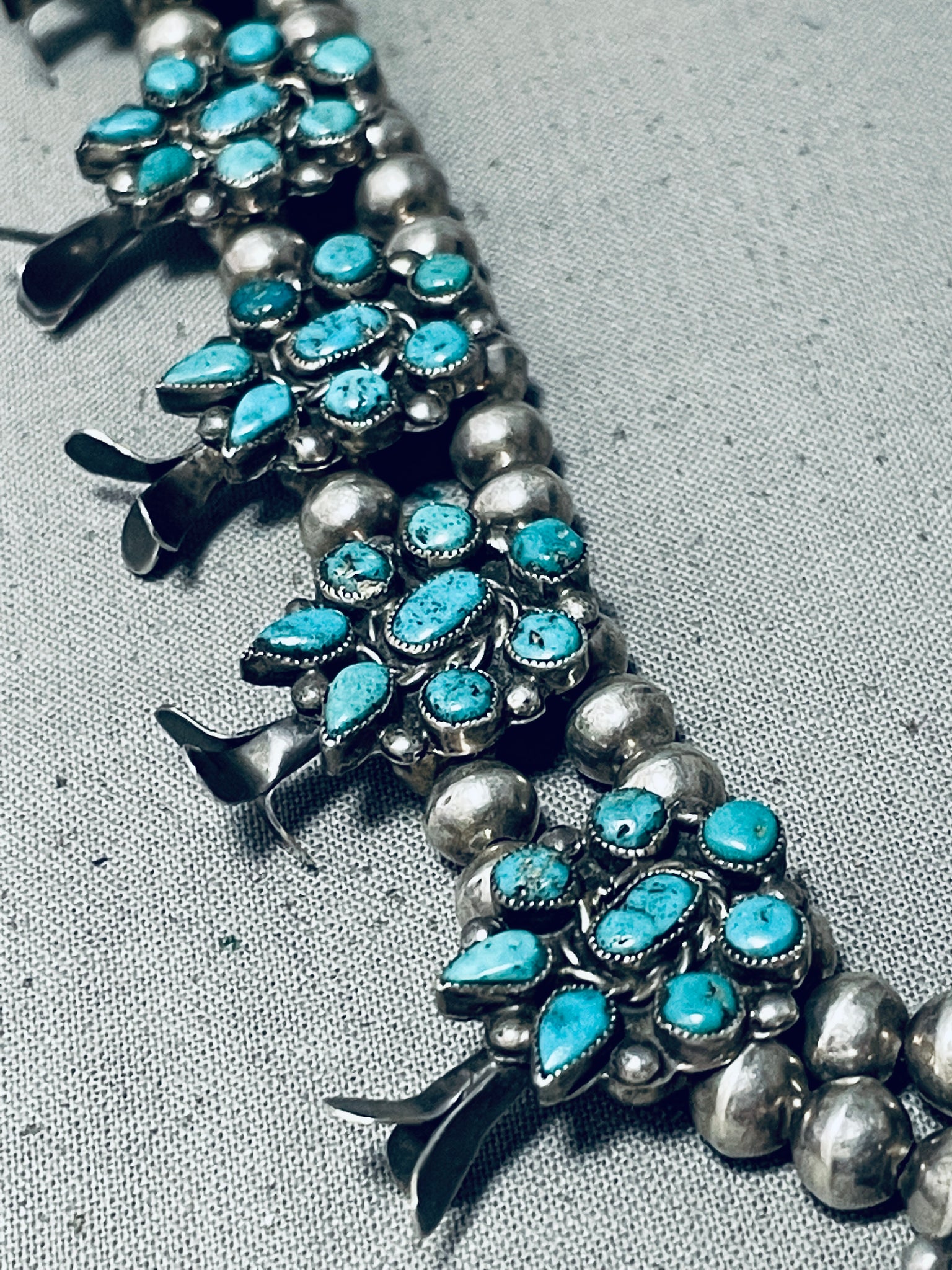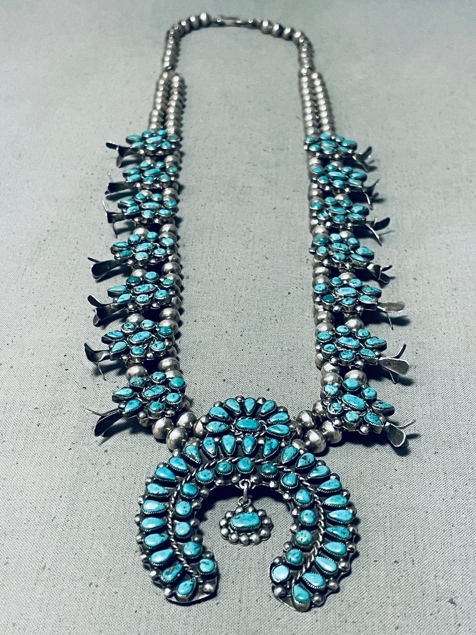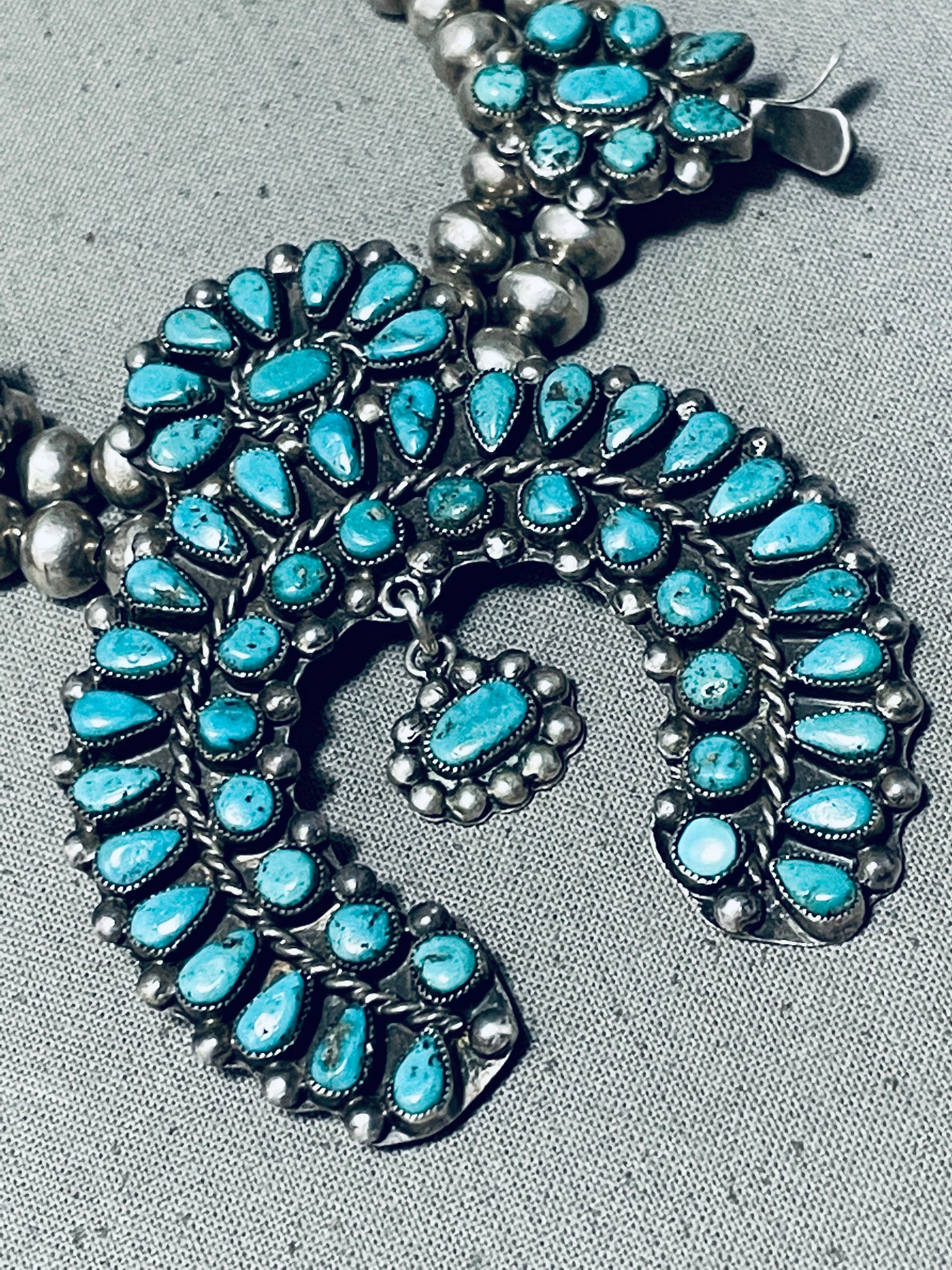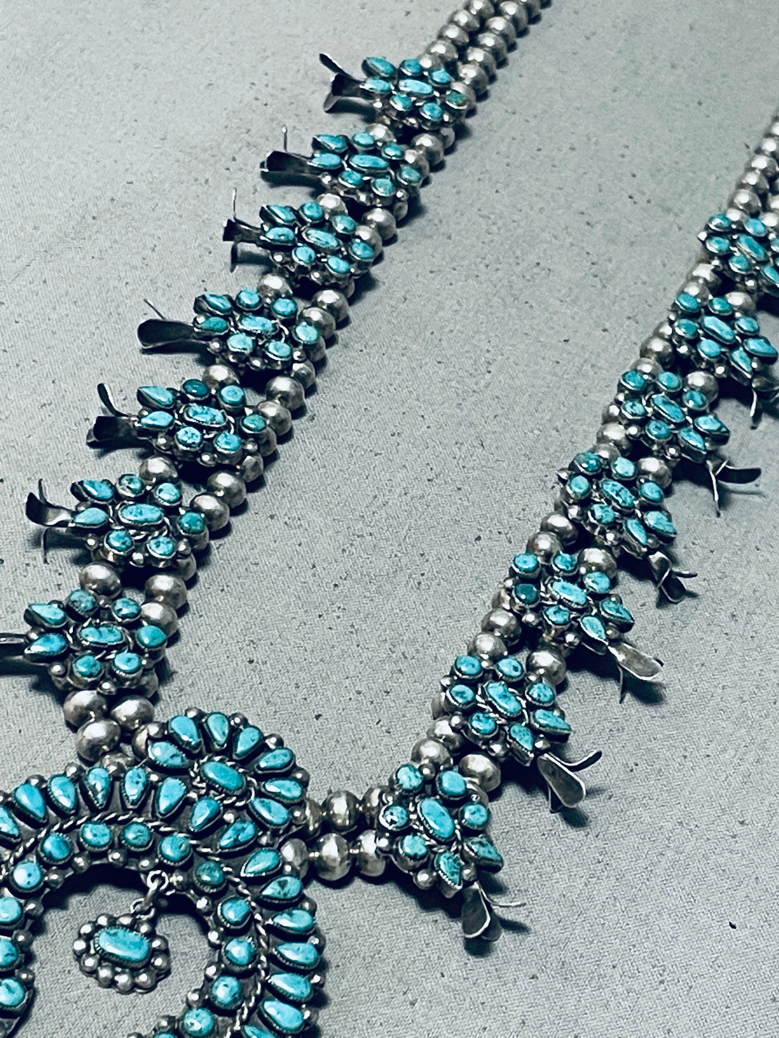 Spectacular Vintage Native American Zuni Turquoise Sterling Silver Squash Blossom Necklace