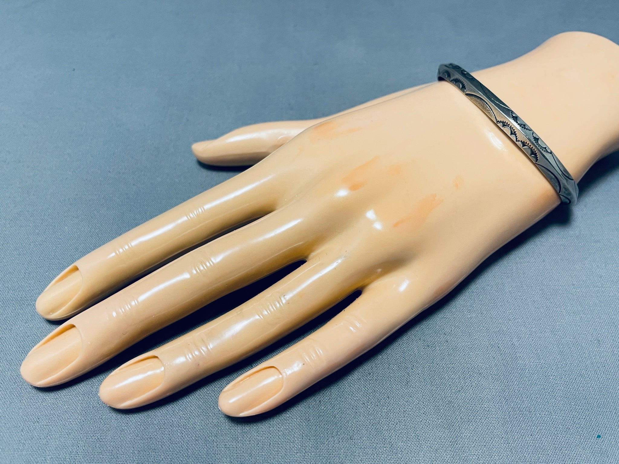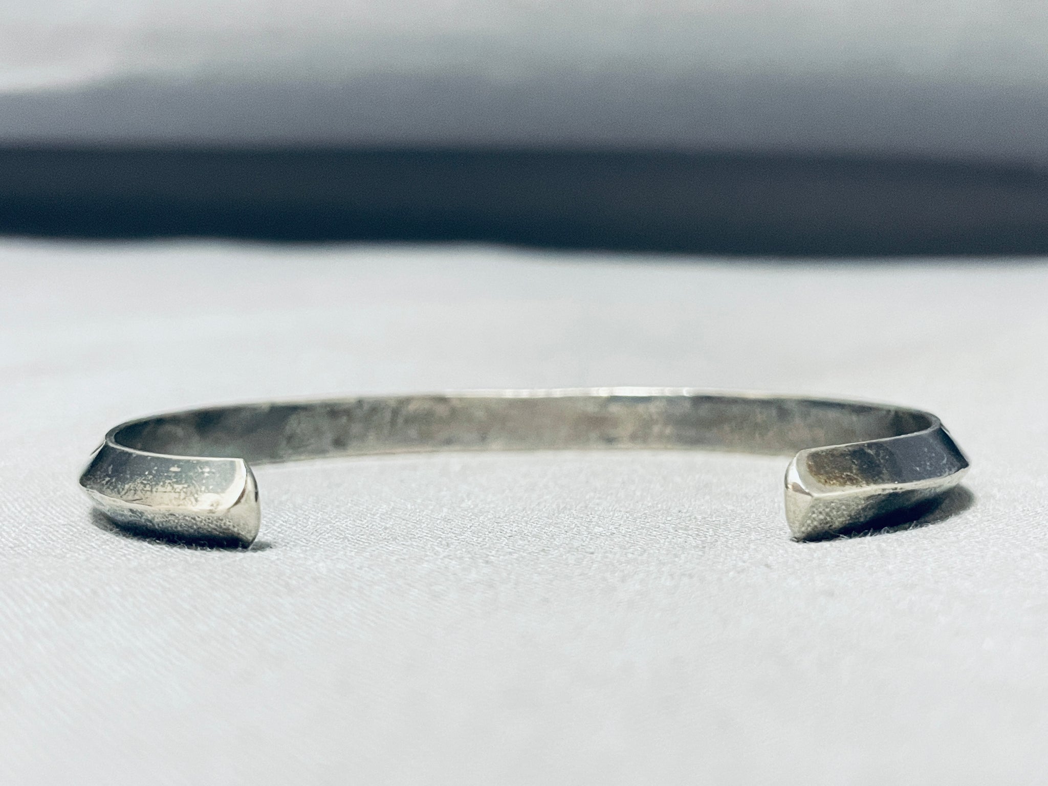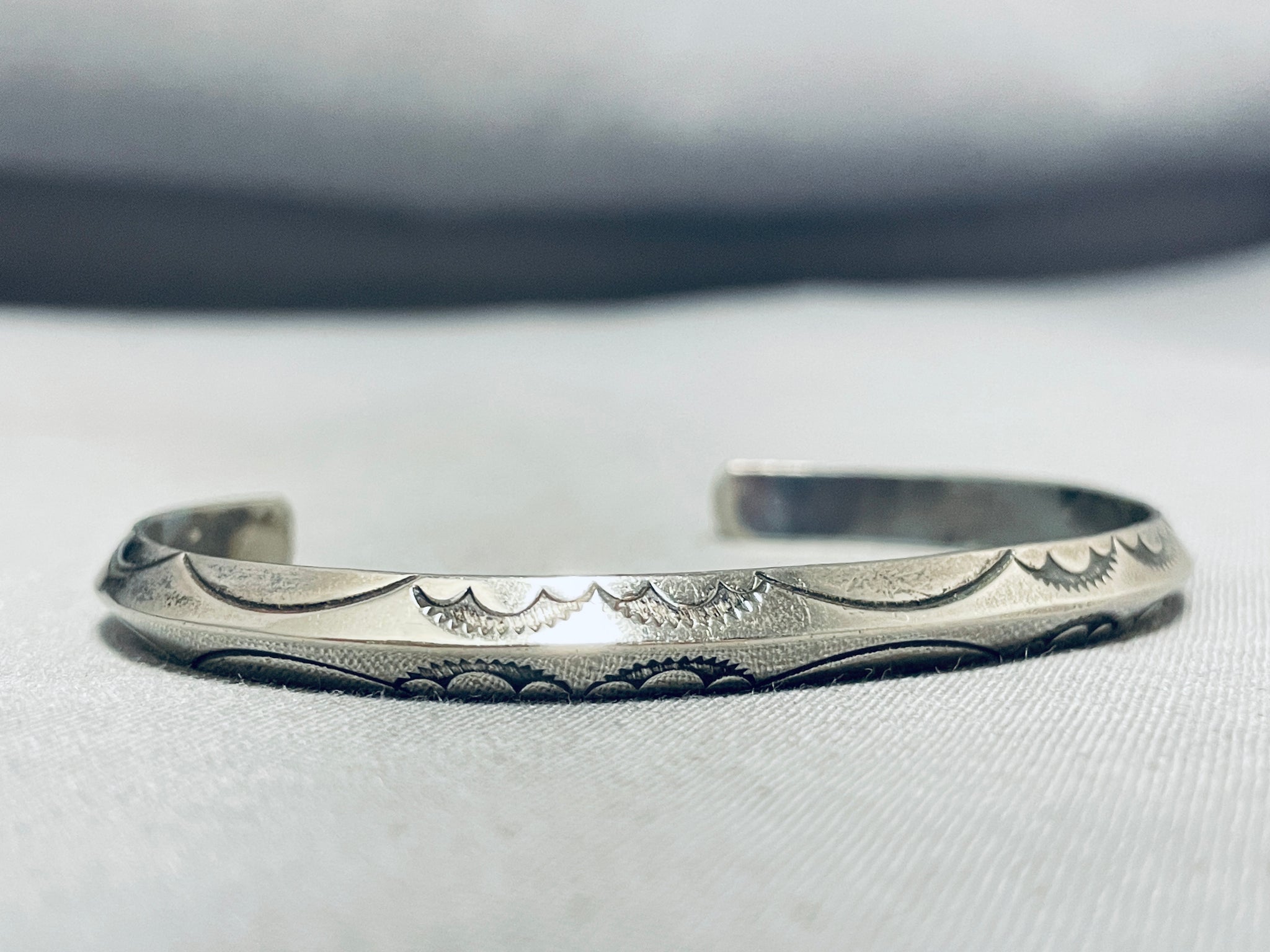 This is a superior vintage Navajo all silver bracelet. This incredible bracelet contains a remarkable triangular shaped silver shank. Located on the shank are wonderful superior sun and wave stamp works. The simplicity but yet detailing of the cuff is just amazing. The width of the bracelet measures around 1/4". Sterling silver. Cir. Mid century . The inside end to end measures around 5-1/2" with an additional 1-1/4" gap. Sturdy 13 grams.