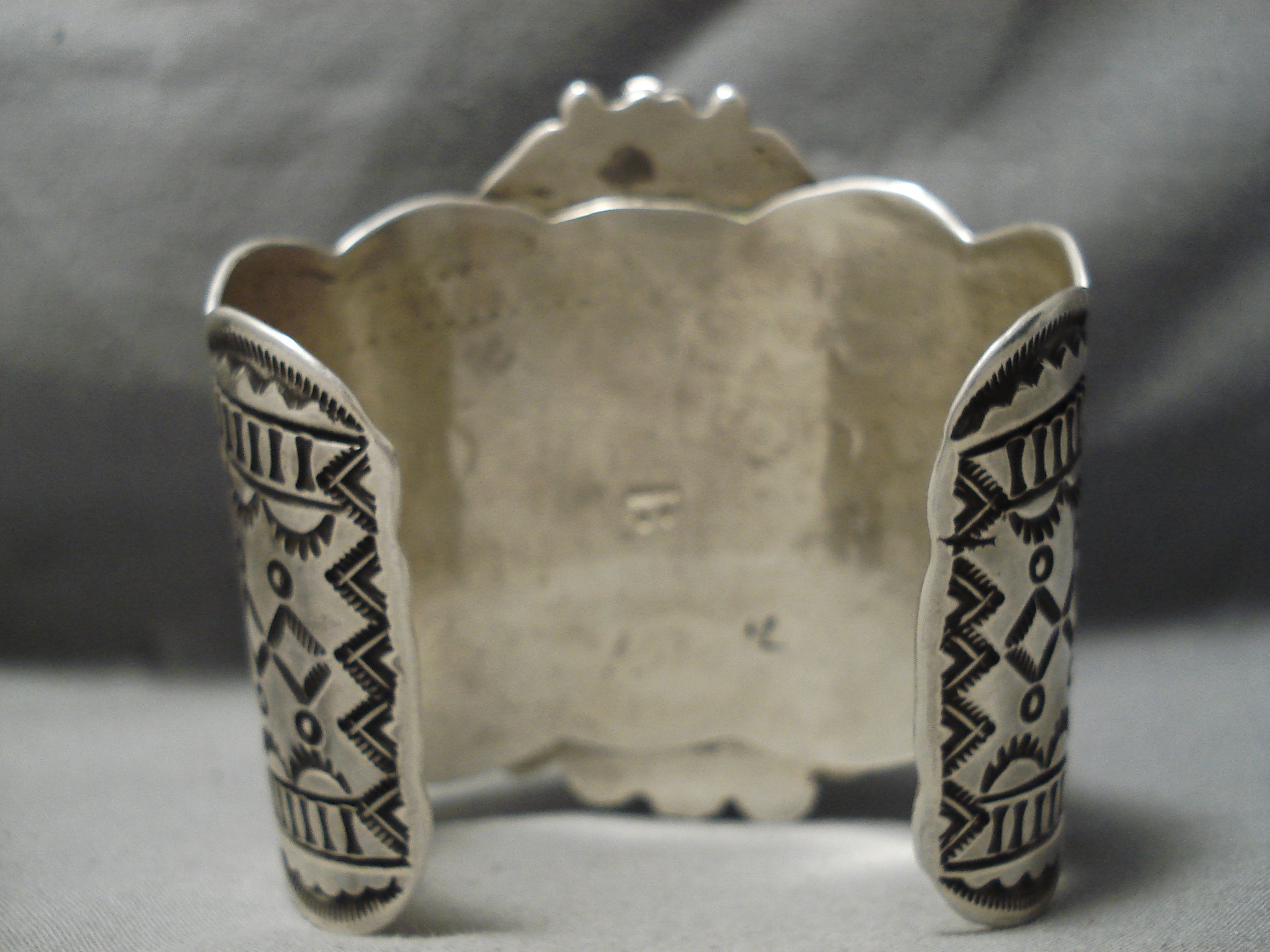 This is a museum quality vintage Navajo large single stone silver bracelet. This phenomenal piece contains a large blue turquoise stone with impeccable surrounding silver works. The silver works that surround the stone include hand carved leaves, flowers, shells, ropes, and stems. Running down both ends of the magnificent thick, sturdy and wide silver cuff are remarakble stampings containing sun works, diamons patterns, dotted patterns, teepees and channel works. The edges of the wide silver cuff amazingly wave from one end to the other. The center stone measures around 2-1/4" x 1-3/4". The width of the bracelet measures around 2-1/2". Signed by Navajo artist, Al McCabe . Sterling silver, marked. Cir. 1970's+. The inside end to end measures around 6-1/2" with an additional 1-1/2" gap. Sturdy 218 grams.