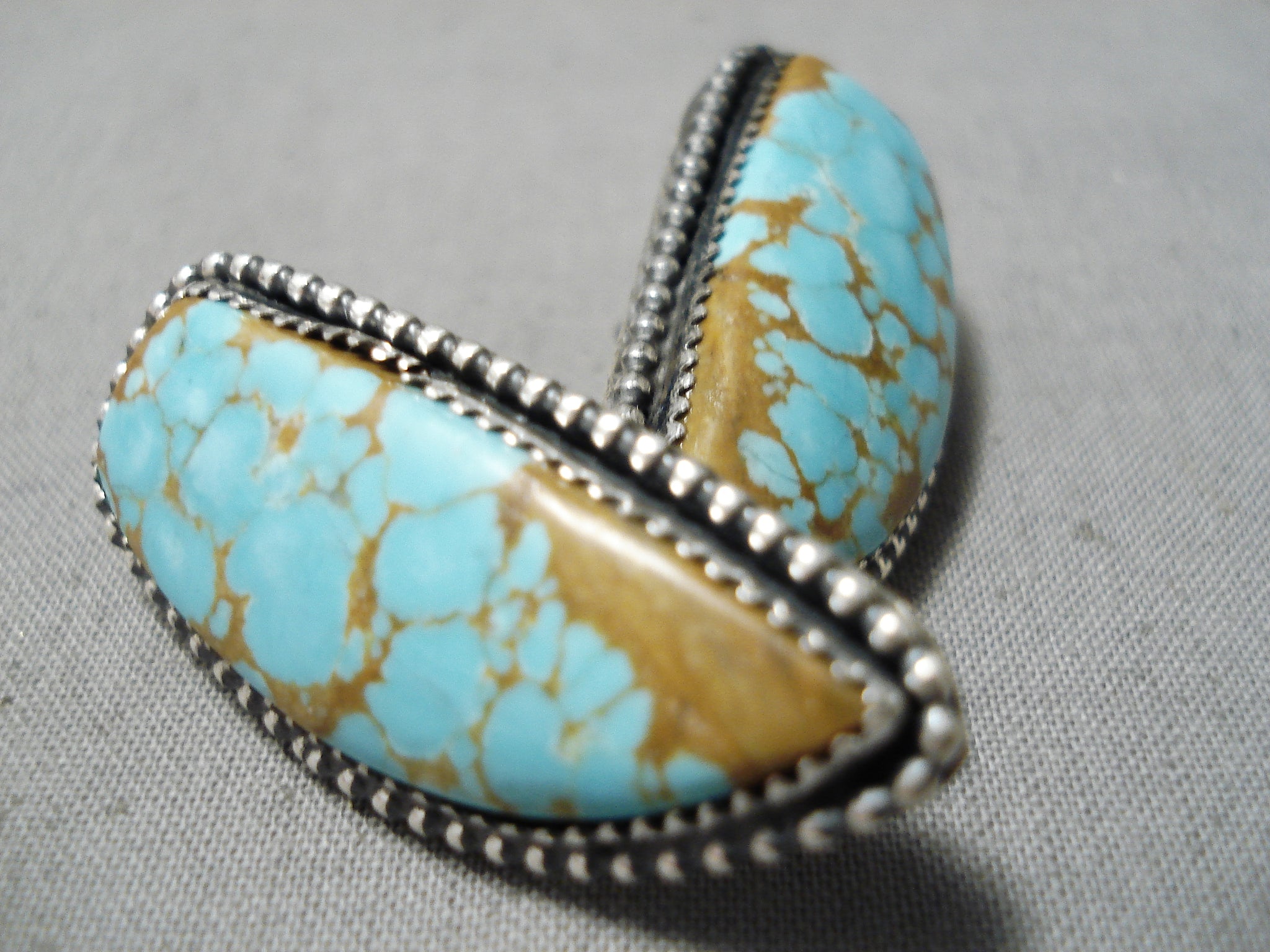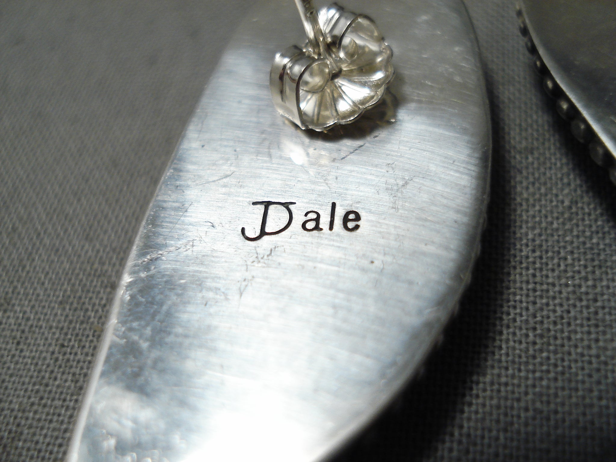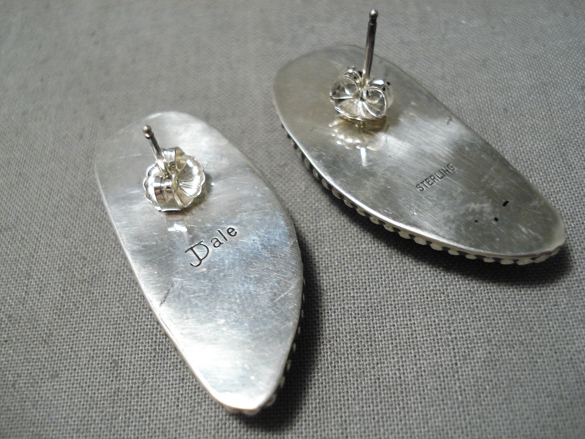 This is an exceptional vintage Navajo silver pair of earrings. Recognized for selecting expressive dynamic stones, this artist has once again chosen these huge teardrop shape #8 turquoise stones for these post pierced earrings. Each of the earrings is surrounded with a silver bead border and from top to bottom, they measure about 1-1/2” x 5/8”. So nice! Sterling silver, marked. Signed by Navajo artist, Jeanette Dale. The earrings weigh around 16 grams.