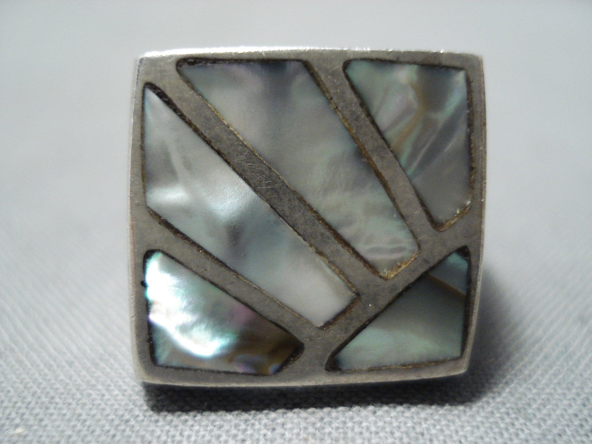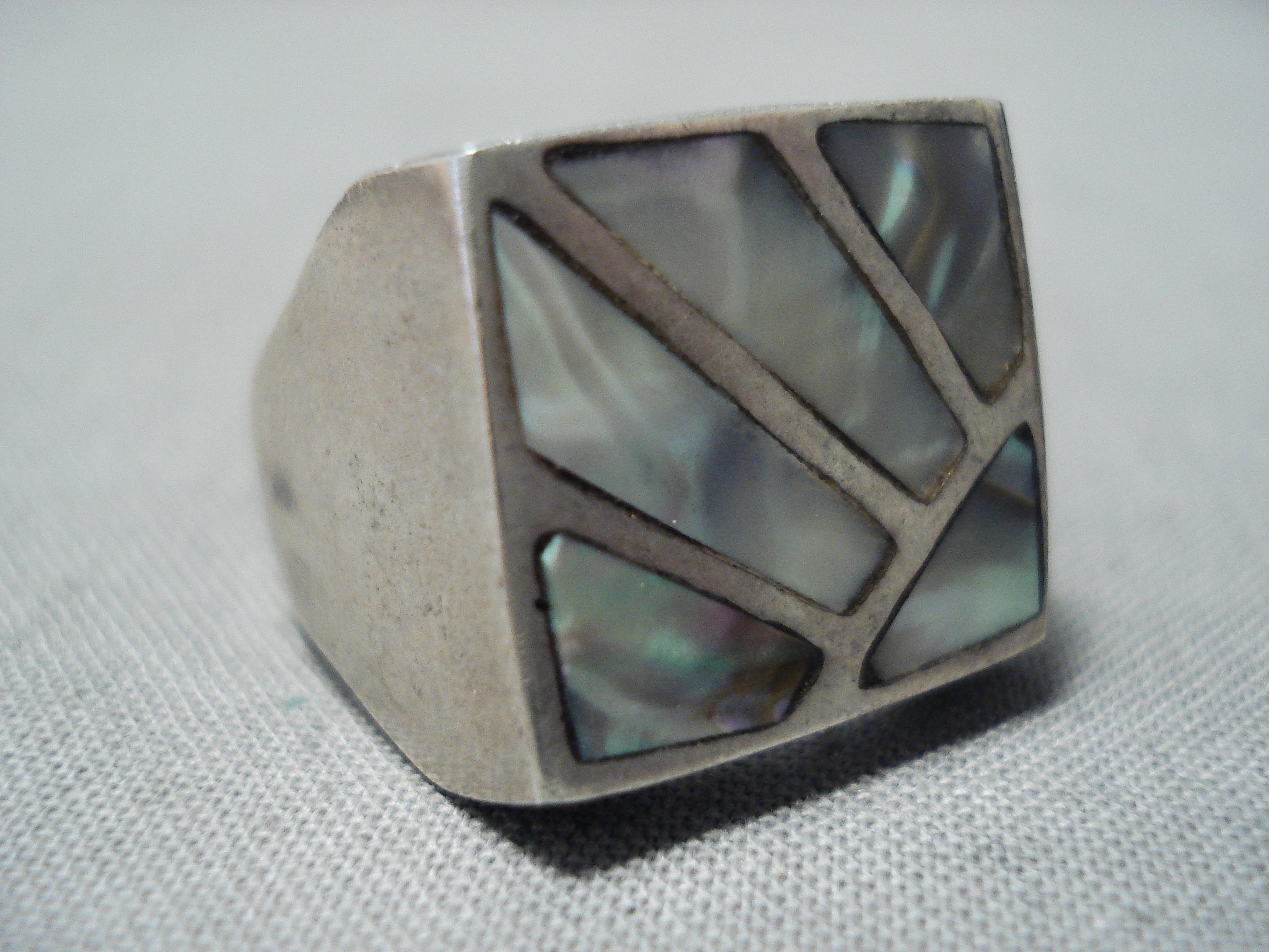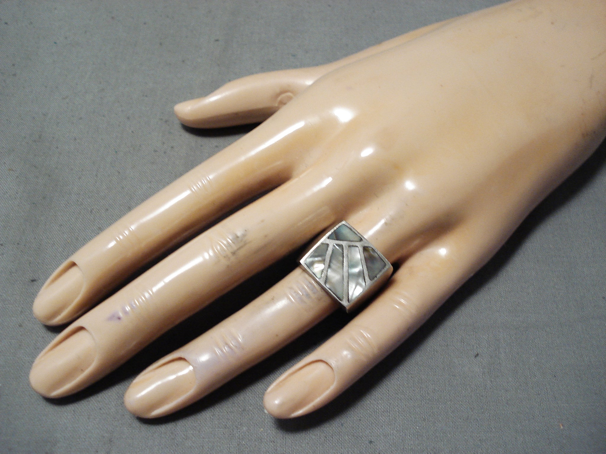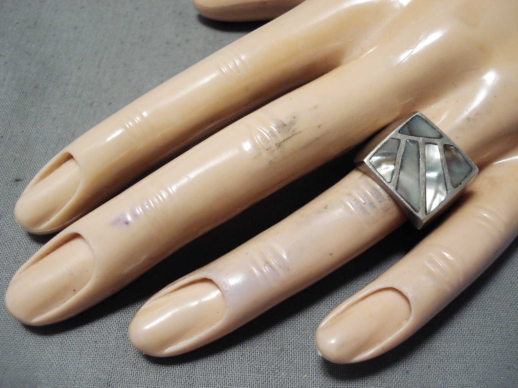 Striking Vintage Native American Navajo Mother Of Pearl Inlay Sterling Silver Ring