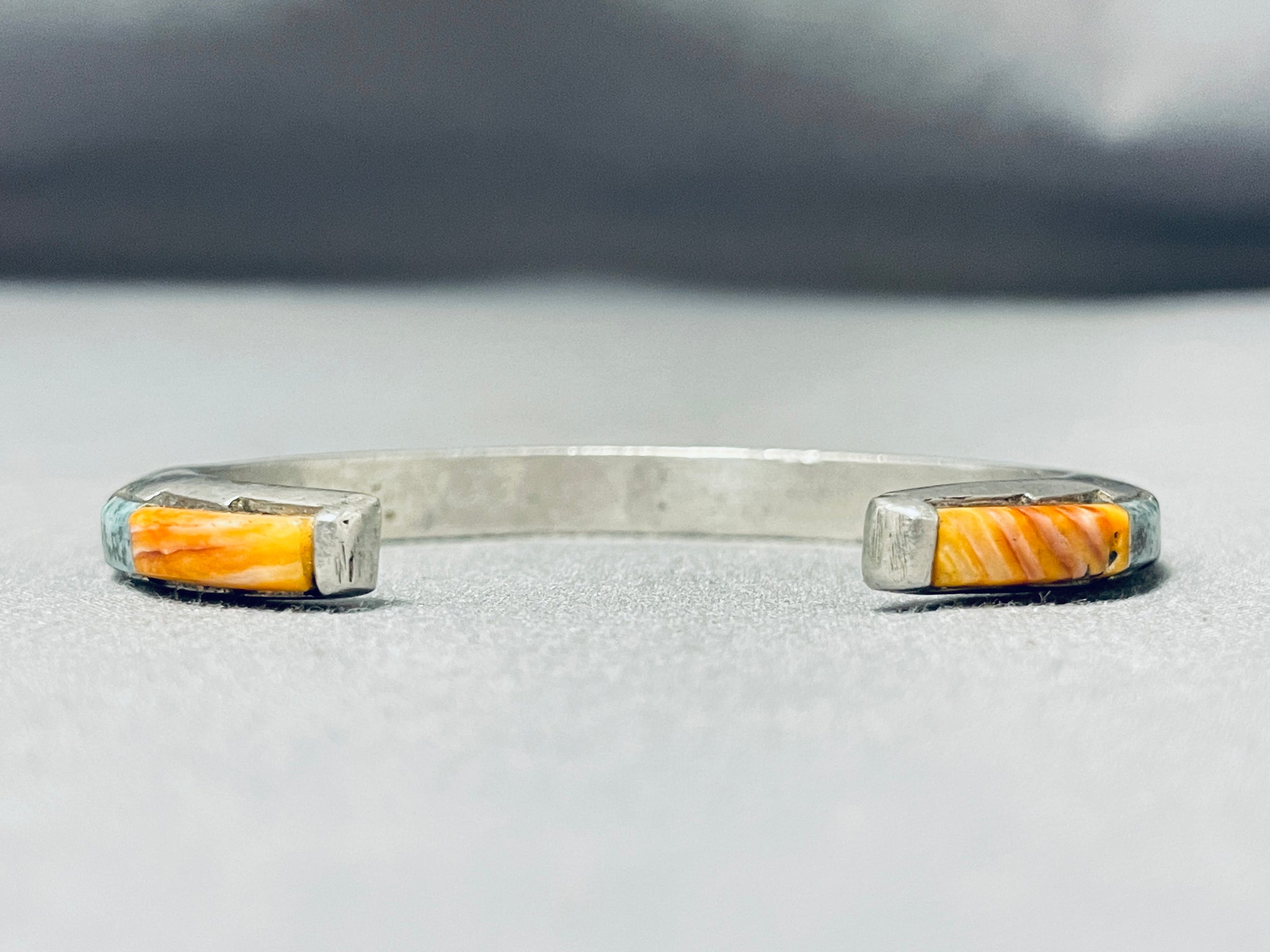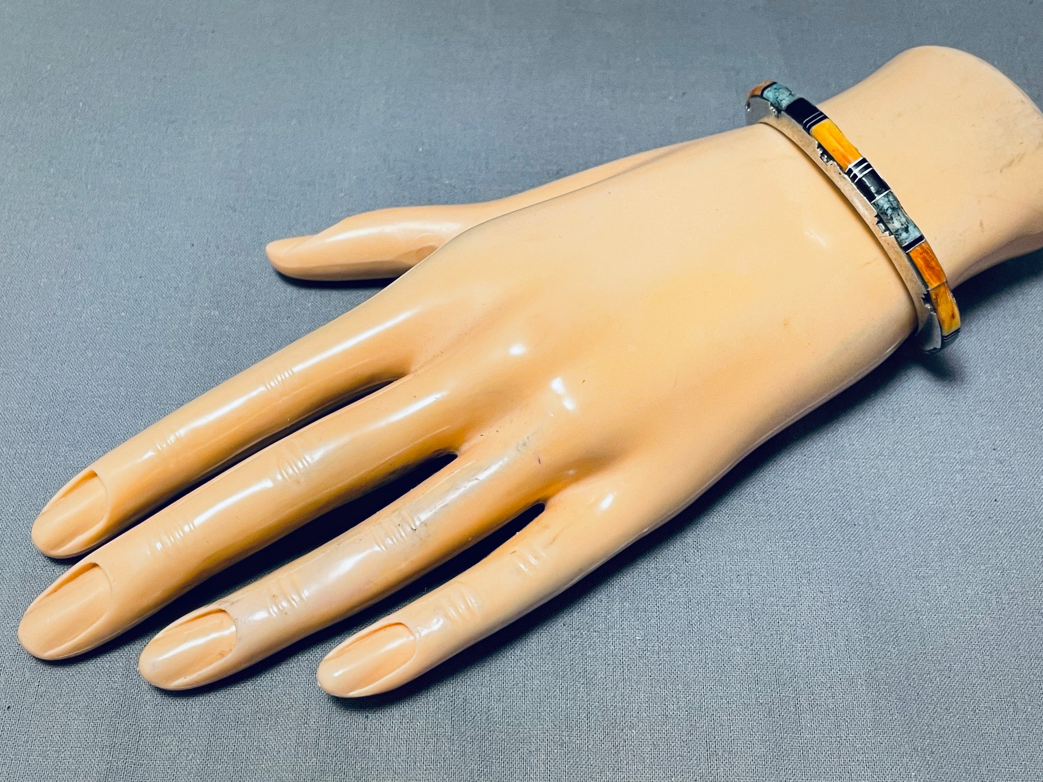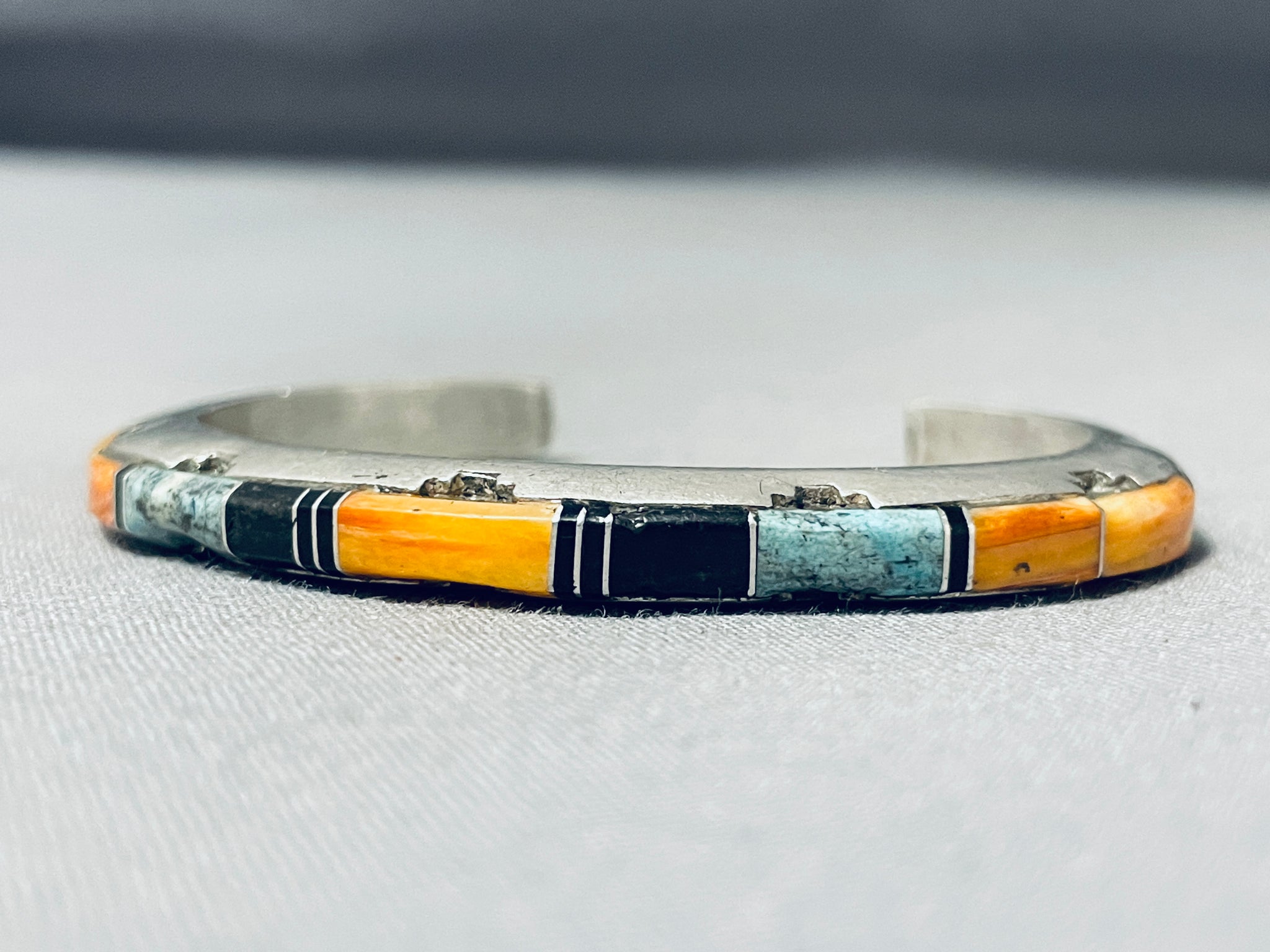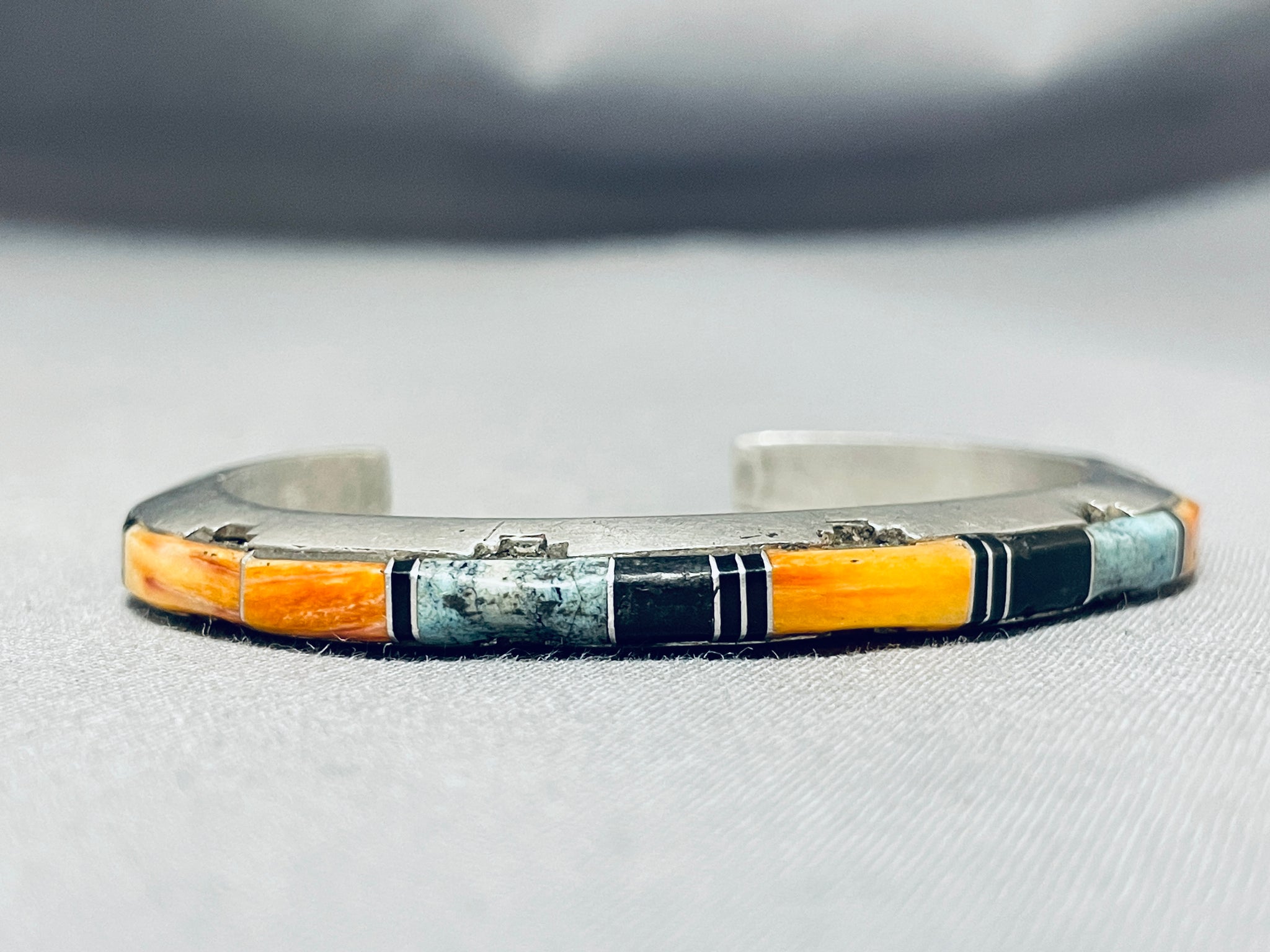 Striking Vintage Native American Navajo Spiny Jet Inlay Sterling Silver Thick Cuff