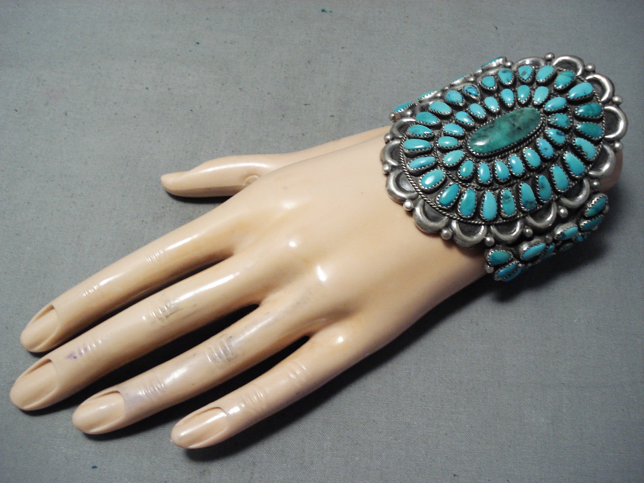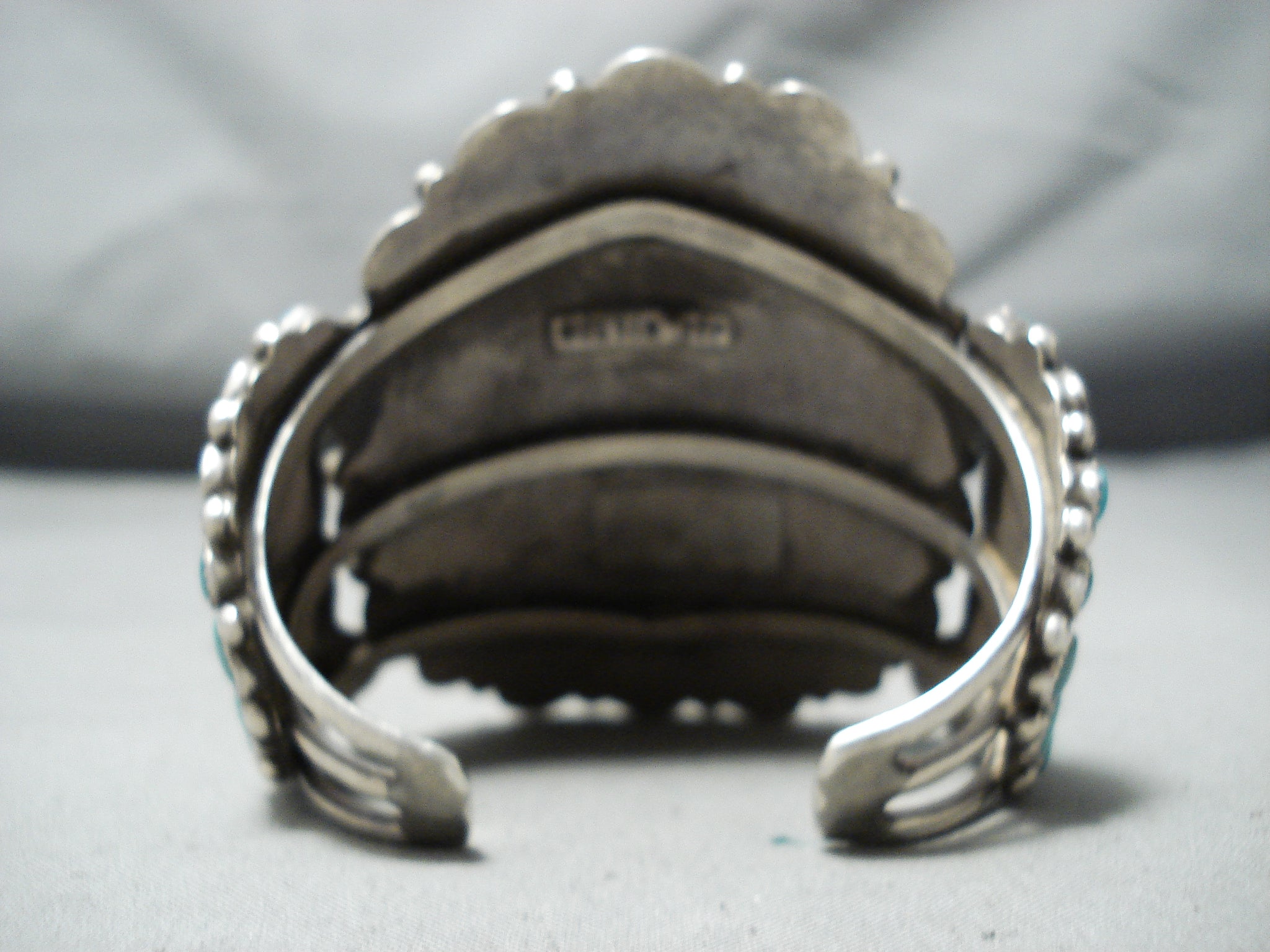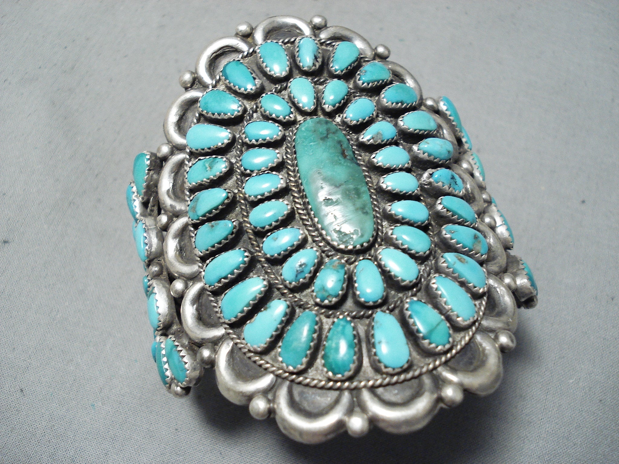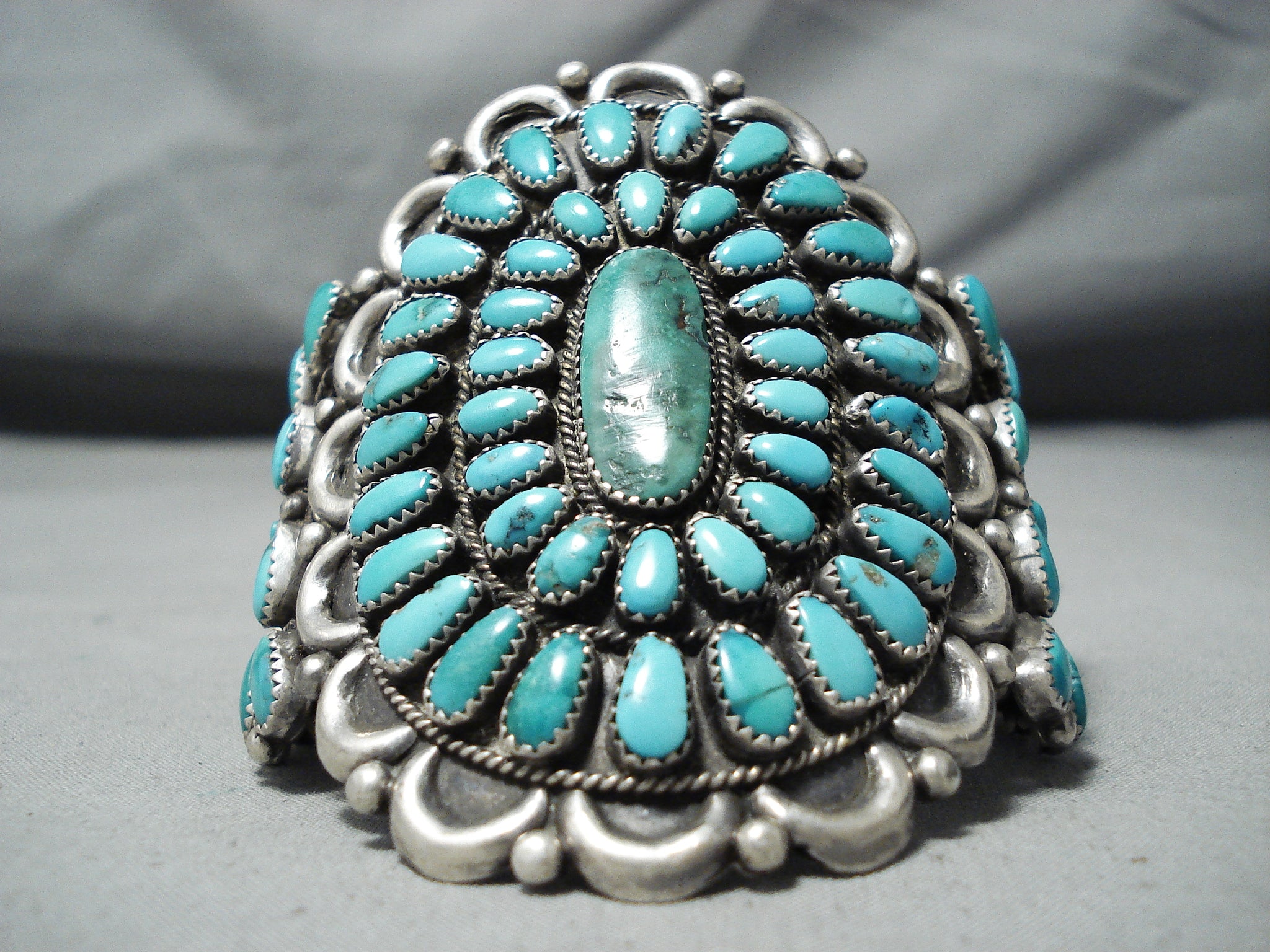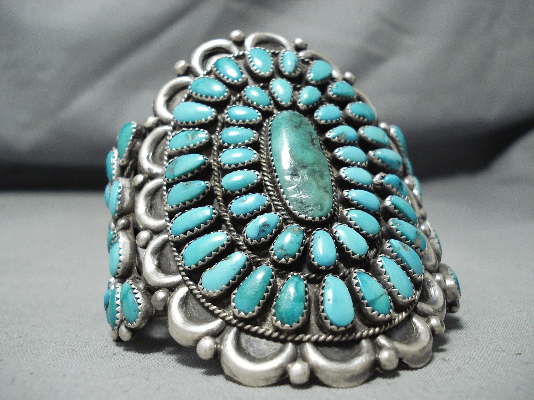 Striking Vintage Native American Navajo Turquoise Sterling Silver Cluster Bracelet Old
