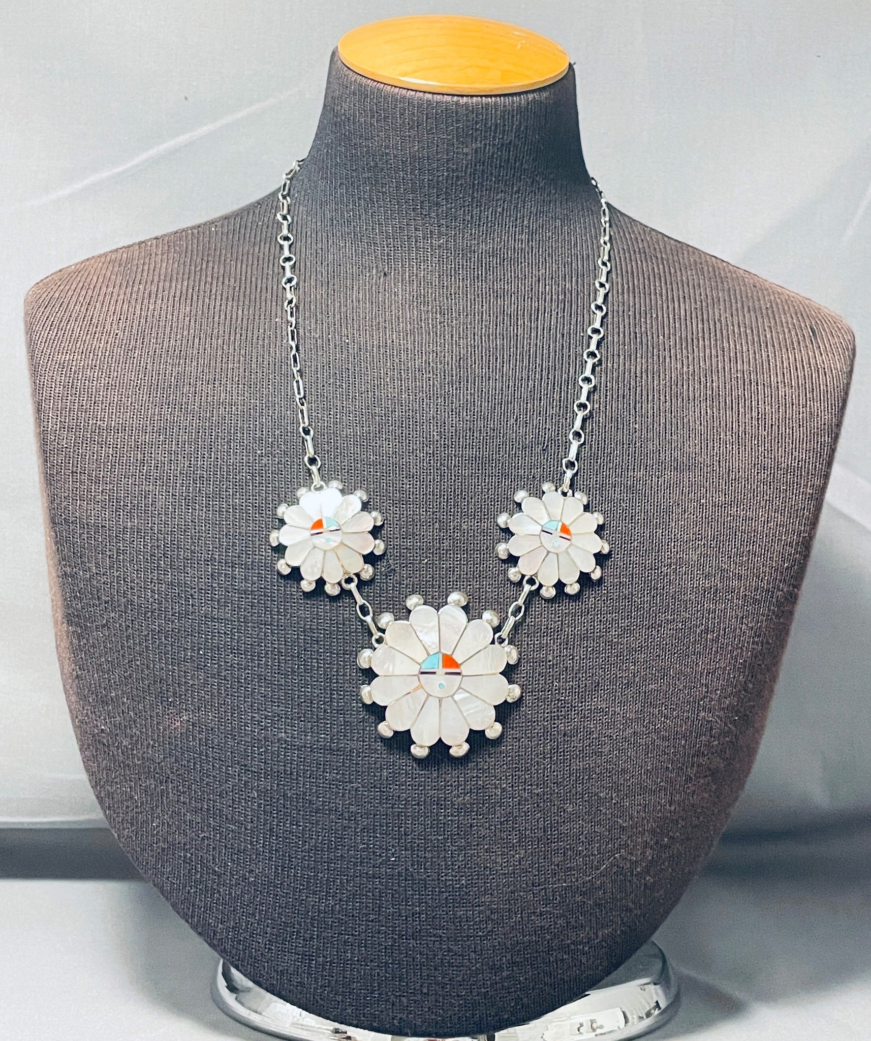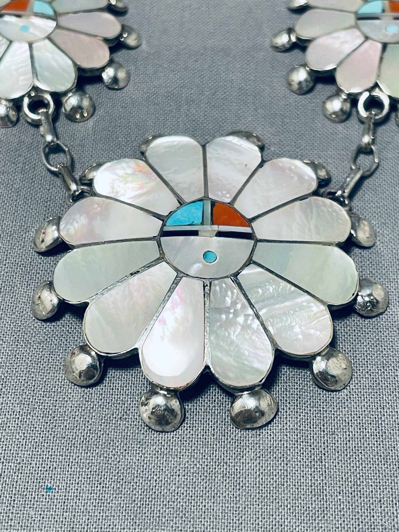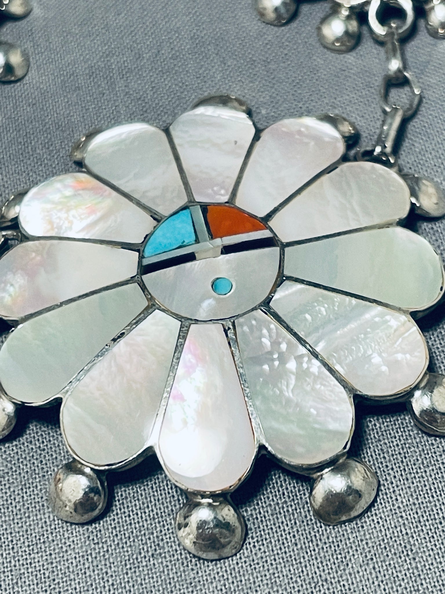 Striking Vintage Native American Zuni Mother Of Pearl Sterling Silver Sunface Necklace