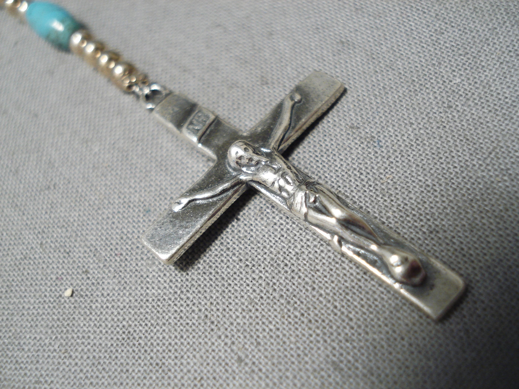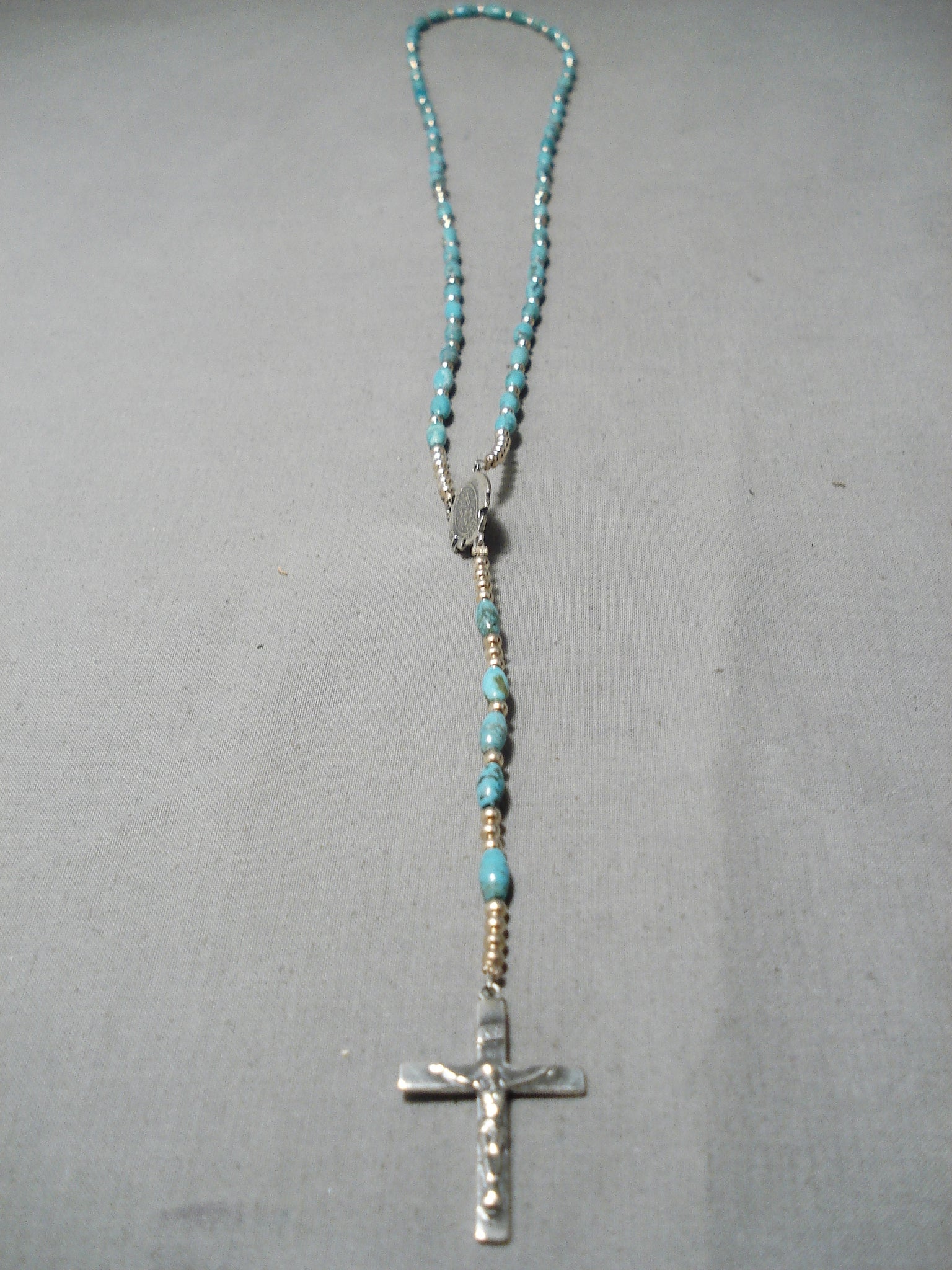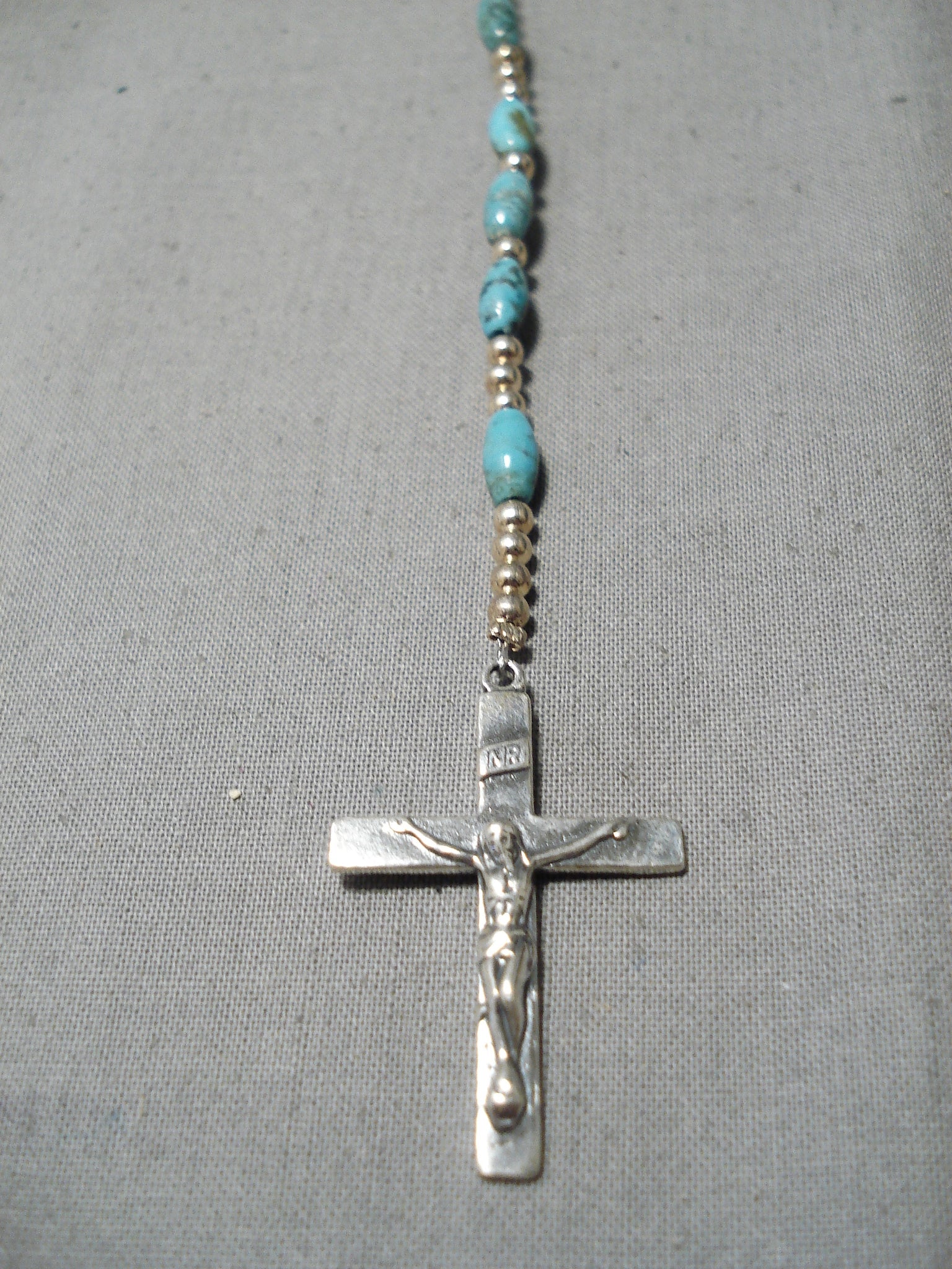 This is a breathtaking Navajo turquoise silver rosary. This rosary is absolutely stunning containing blue turquoise stones that are beautifully tubule shaped. Resting throughout the stones are wonderful round silver beads. Sterling silver, marked. The length of the necklace measures around 37". Sturdy 22 grams.