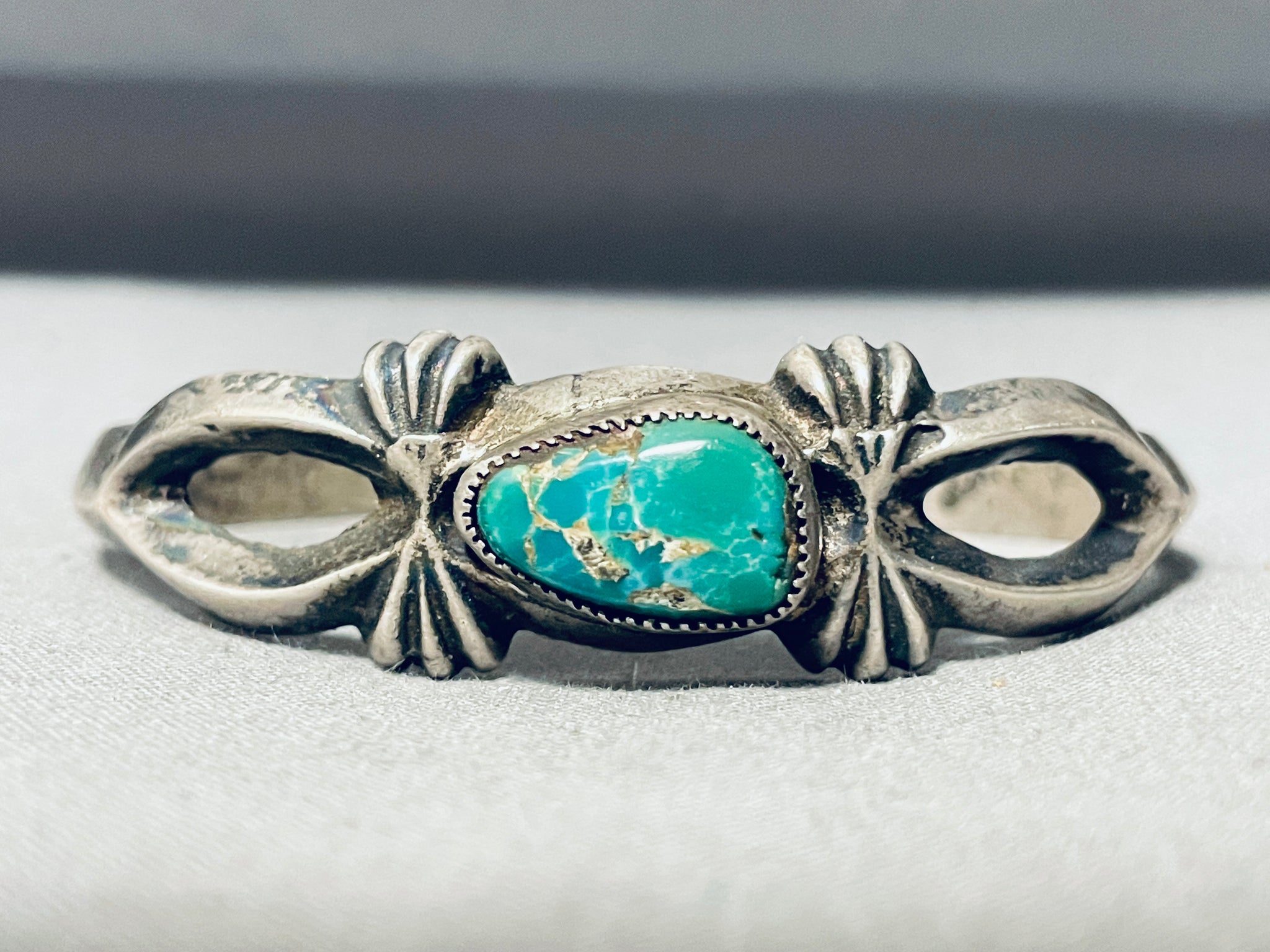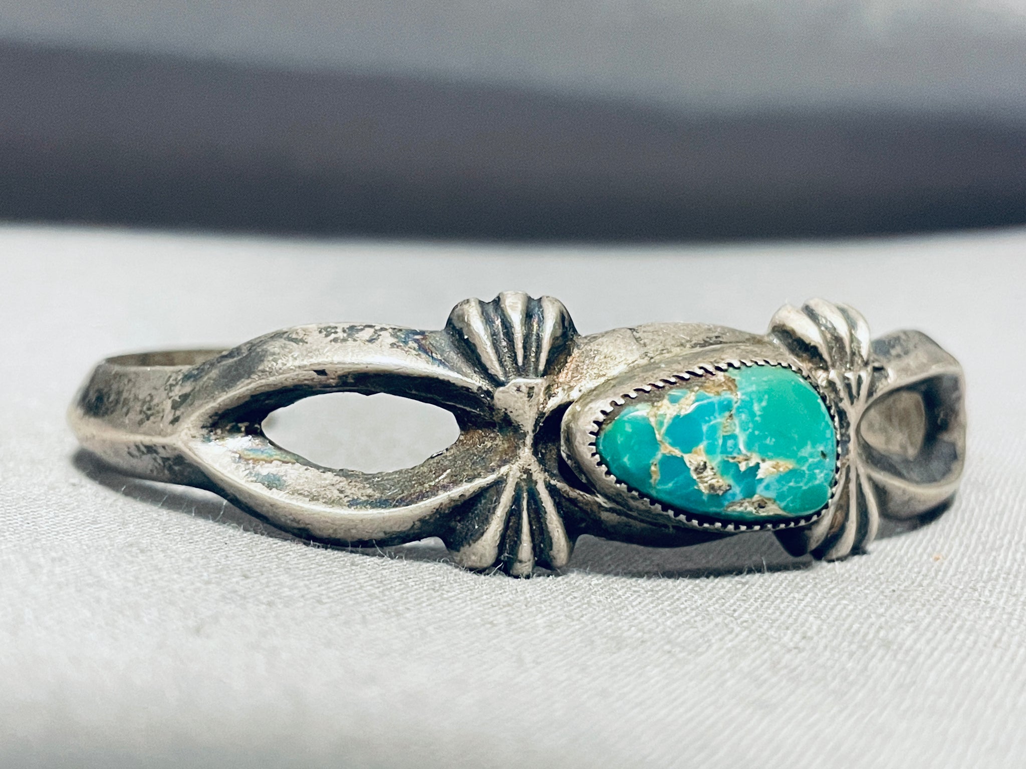 This is a fabulous vintage Navajo large single stone silver cuff bracelet. This outstanding thick and sturdy silver bracelet contains a center fat teardrop shaped Carico Lake turquoise stone. Surrounding the stone are stunning accenting silver fan flanks. I absolutely love the beautiful designed thick silver cuff with old natural patina. The center stone measures around 5/8" x 3/8". The width of the bracelet measures around 5/8". Sterling silver. Cir. Mid century . The inside end to end measures around 5-1/4" with an additional 1" gap. Sturdy 26 grams.