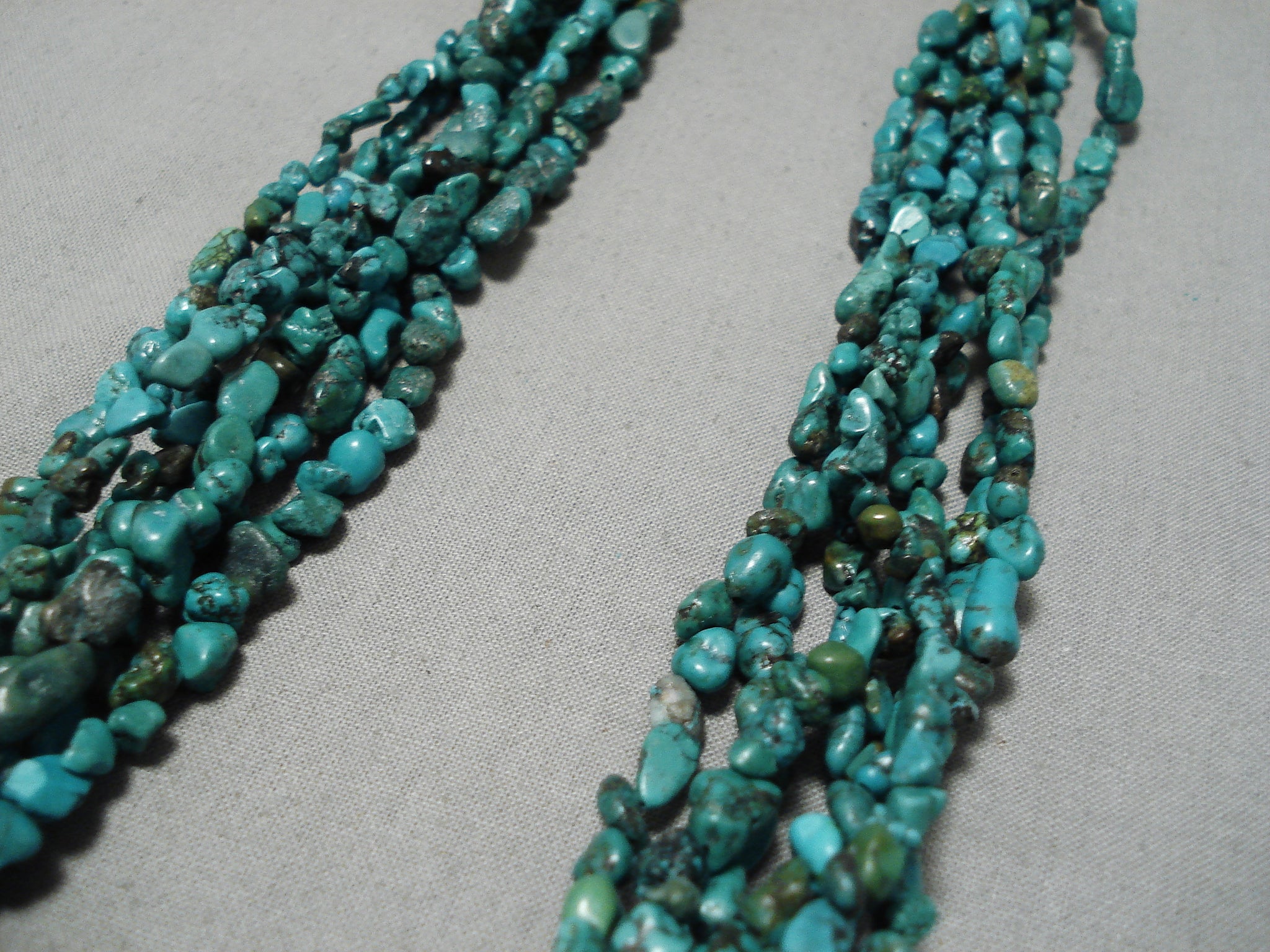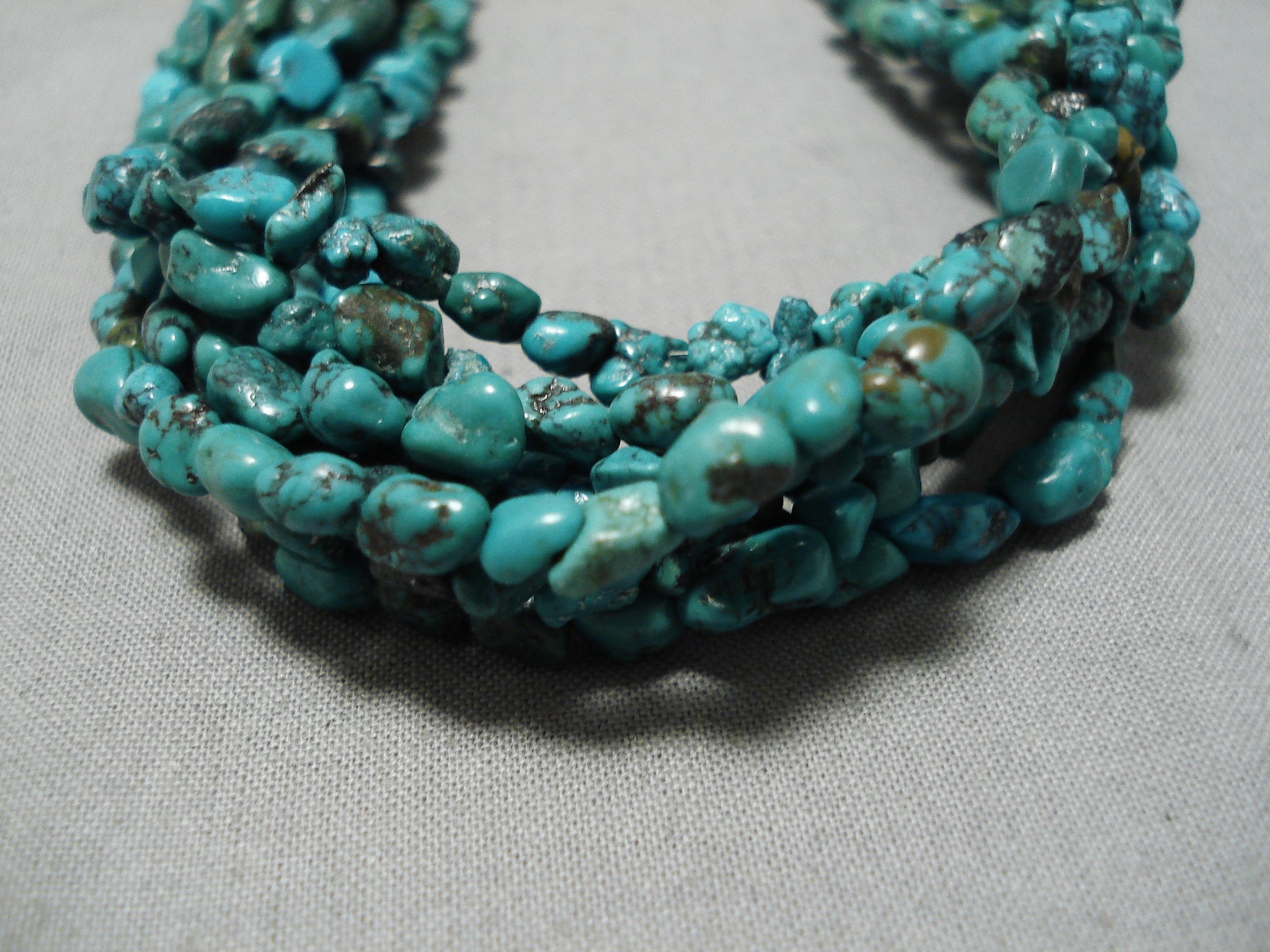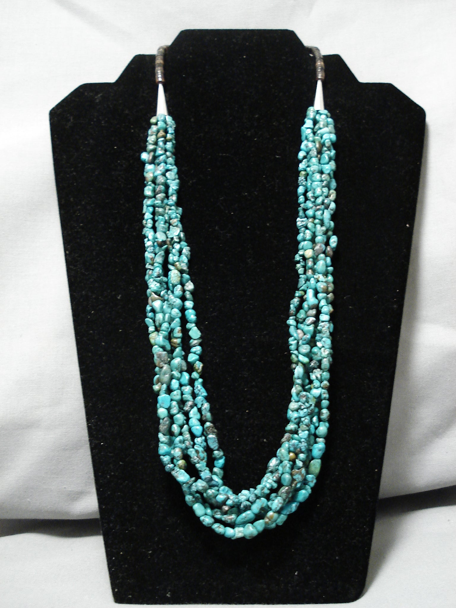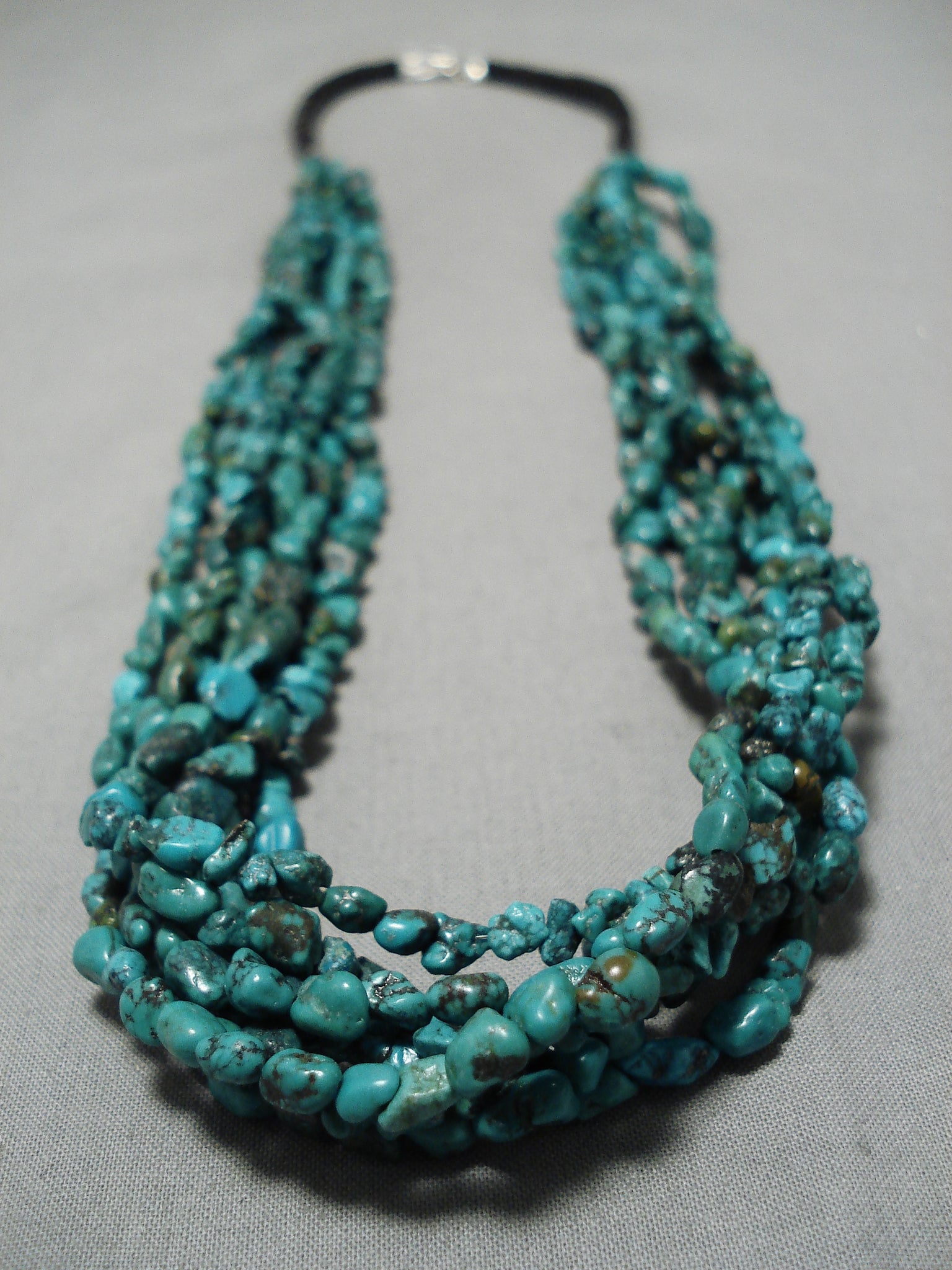 This is a marvelous Navajo turquoise necklace. This amazing piece contains 7 strands of remarkable spiderweb turquoise stones. The strands graduate into one strand towards the end with accenting silver cones and pen shell heishi with a traditional silver clasp. The turquoise on this piece consists of extremely old deposit Crow Springs turquoise which is more rare than the new deposit. Sterling silver, marked. The length of the necklace measures around 25". Sturdy 83 grams.