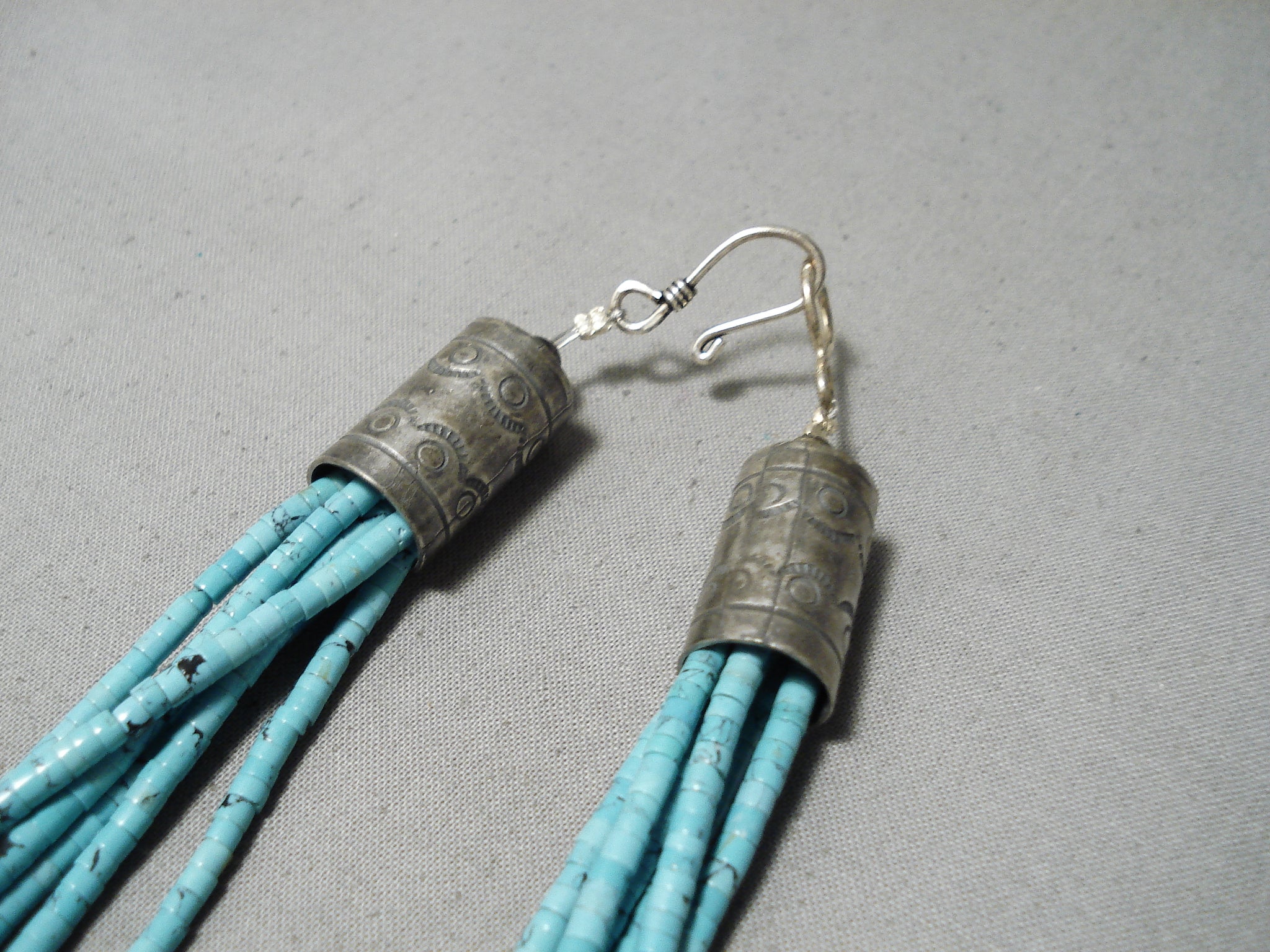 This is a breathtaking vintage Navajo turquoise and silver necklace. This outstanding piece contains 7 fabulous strands that are comprised of only turquoise heishi. Resting at the ends of the impeccable necklace are wonderful large hand carved silver drum beads that have wonderful hand stampings. This necklace contains a superior large traditional silver clasp. Sterling silver, marked. Cir. Mid to late 20th century . The length of the necklace measures around 20". Sturdy 63 grams.