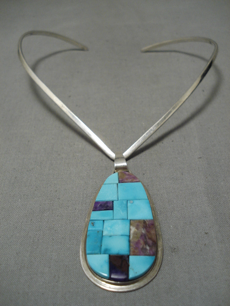 Stunning Vintage Native American Navajo Turquoise Spiny Oyster Inlay Sterling Silver Necklace