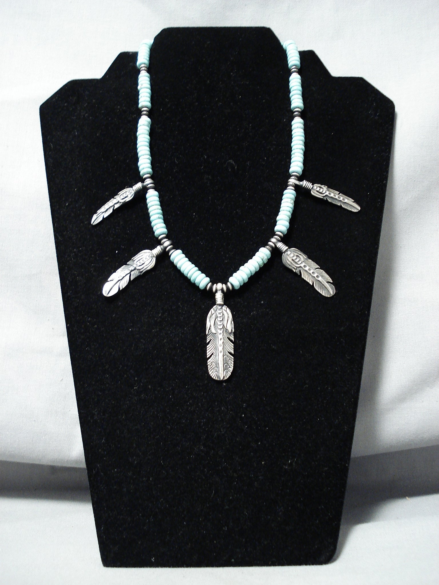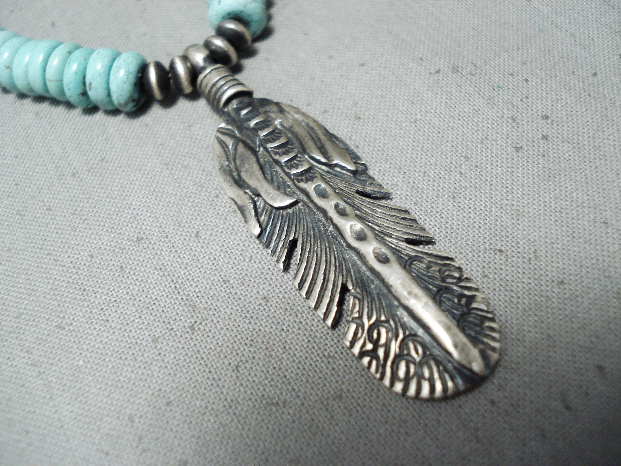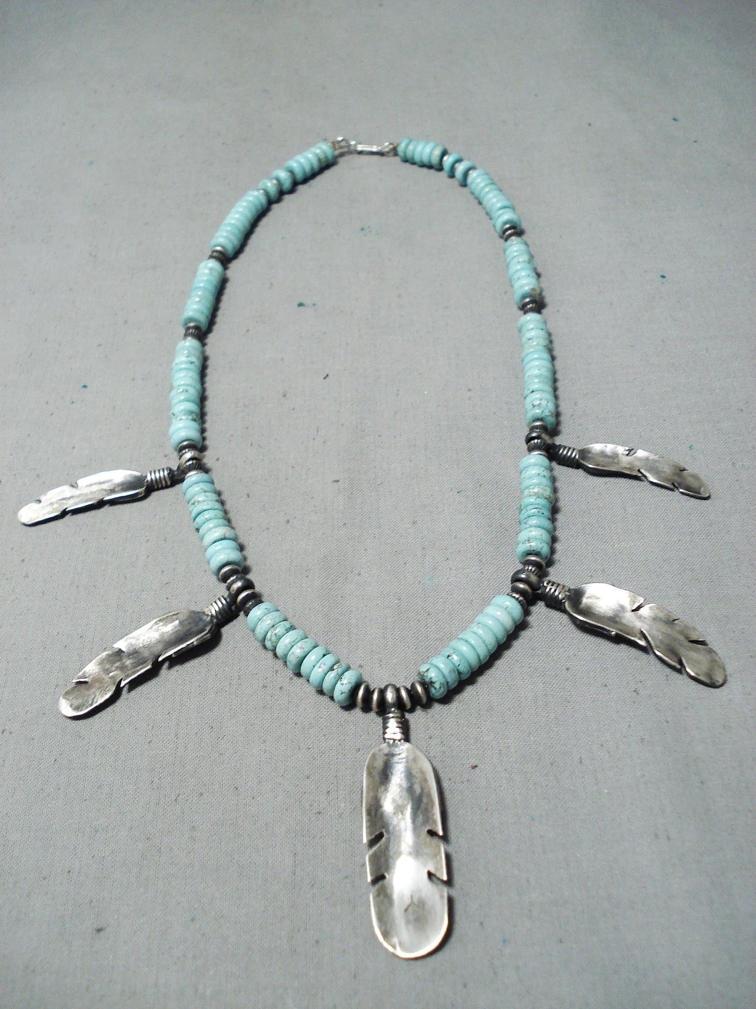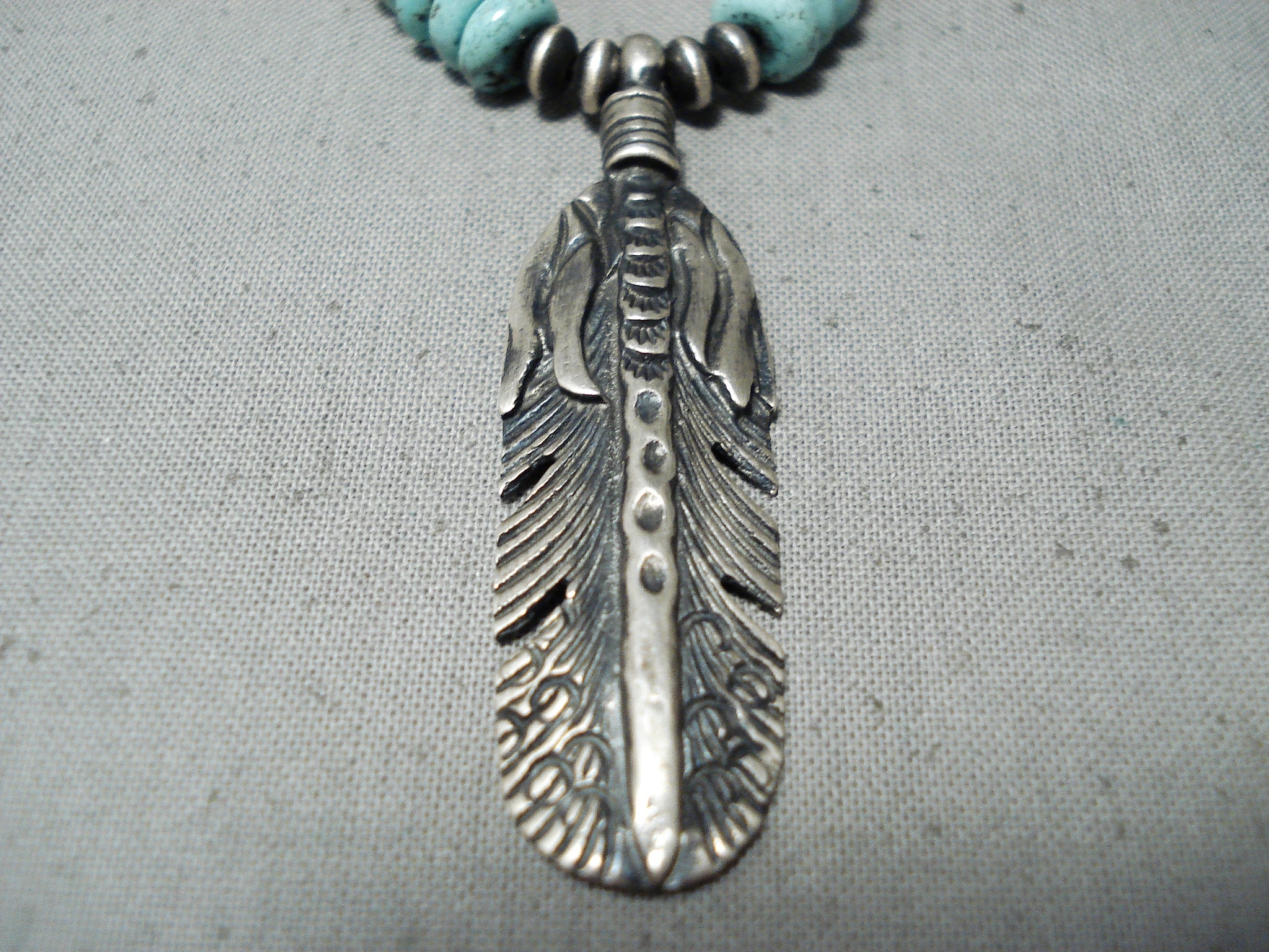 Stunning Vintage Native American Navajo Turquoise Sterling Silver Feathers Necklace